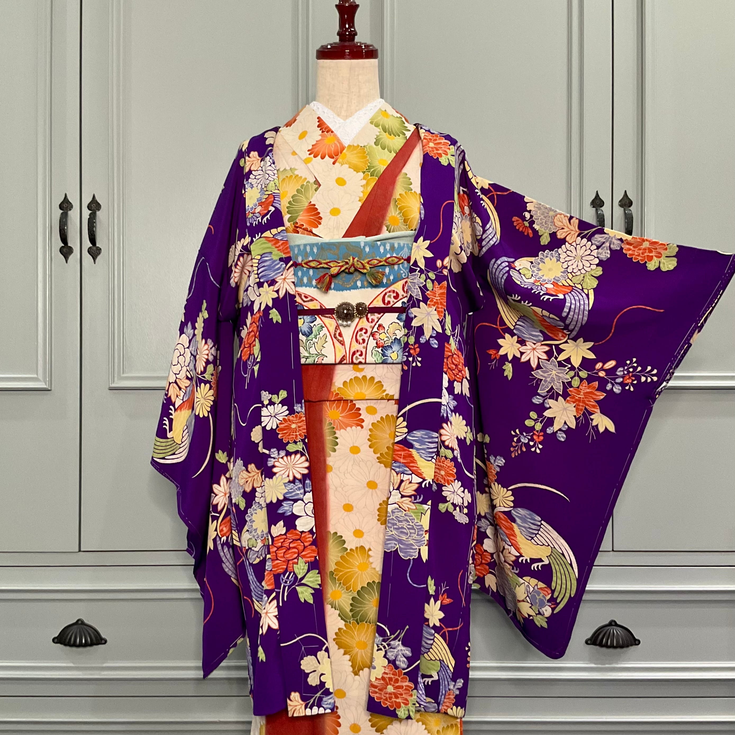 パープル地に、鳥さんや菊、牡丹、紅葉が描かれたアンティーク長羽織です