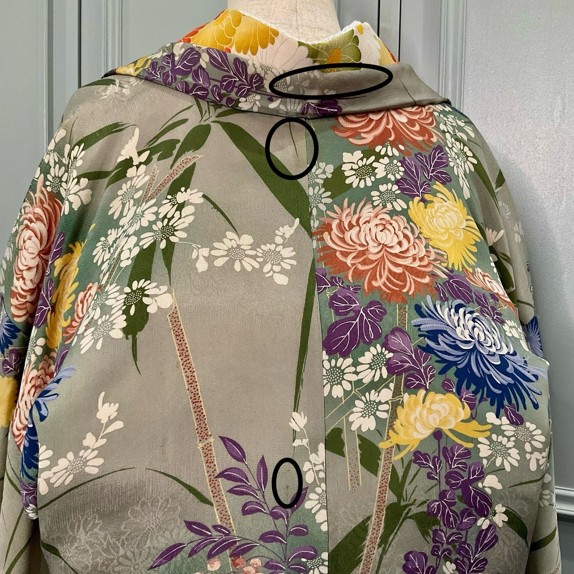 翠霞花実*菊 南天 笹 竹 糸菊 乱菊 暈し グレーグリーン くすみグリーン 薄緑 アンティーク長羽織 B327