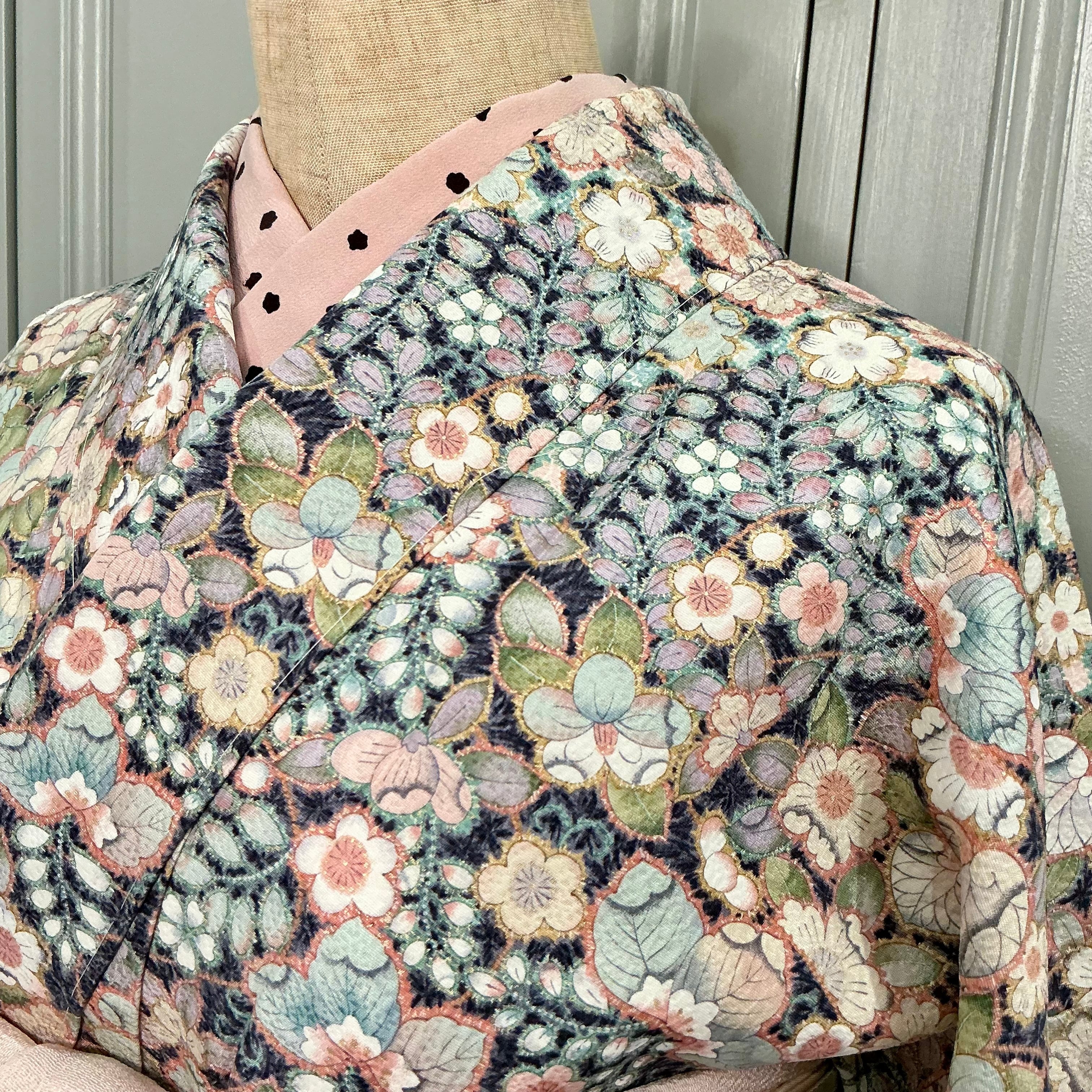 Garden of Night Fog*未使用品 辻が花テイスト ネイビー 紺 藤 桜 更紗模様 小紋着物 B330