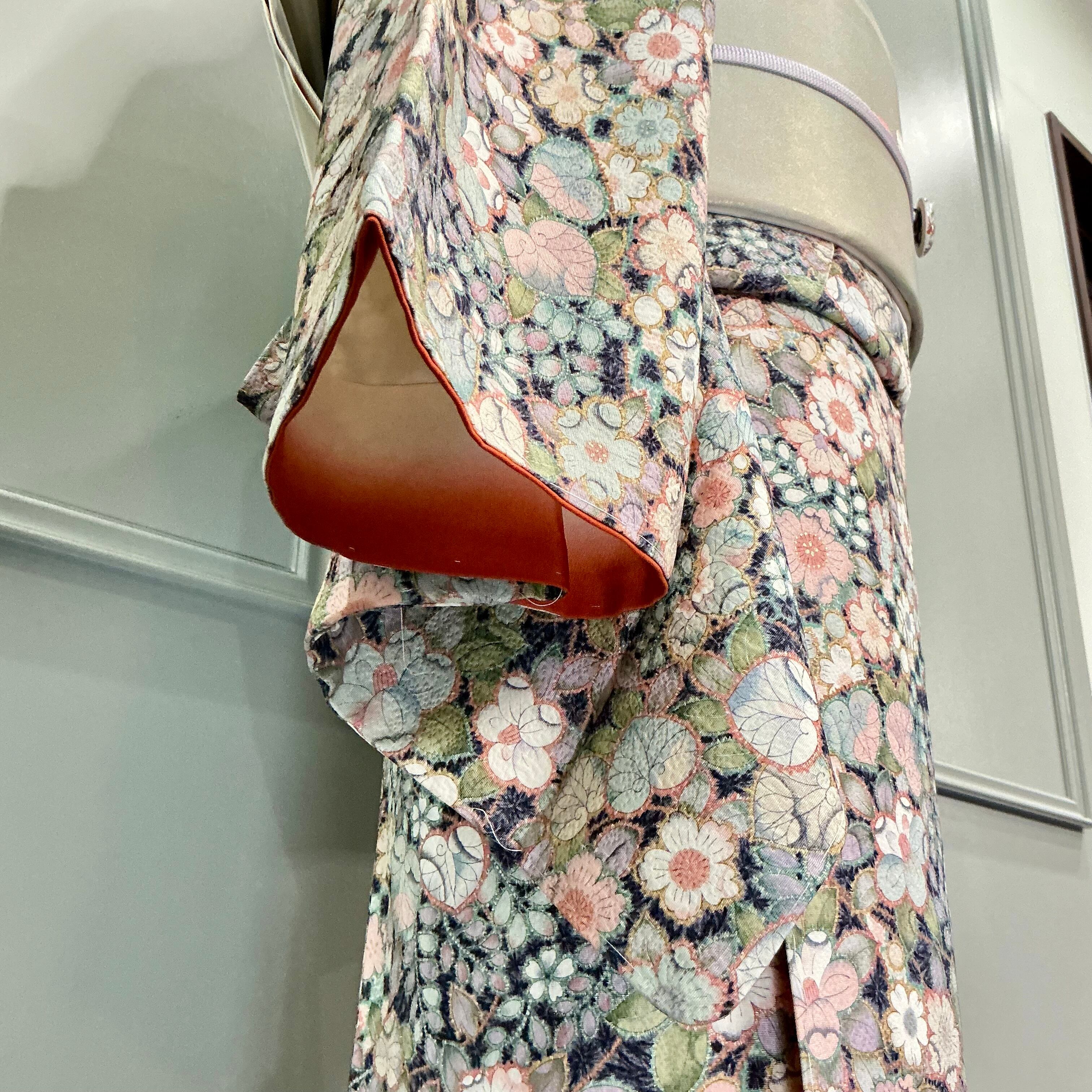 ネイビーの地色に辻ヶ花調の美しく絵画的なデザインが華やかな小紋着物です