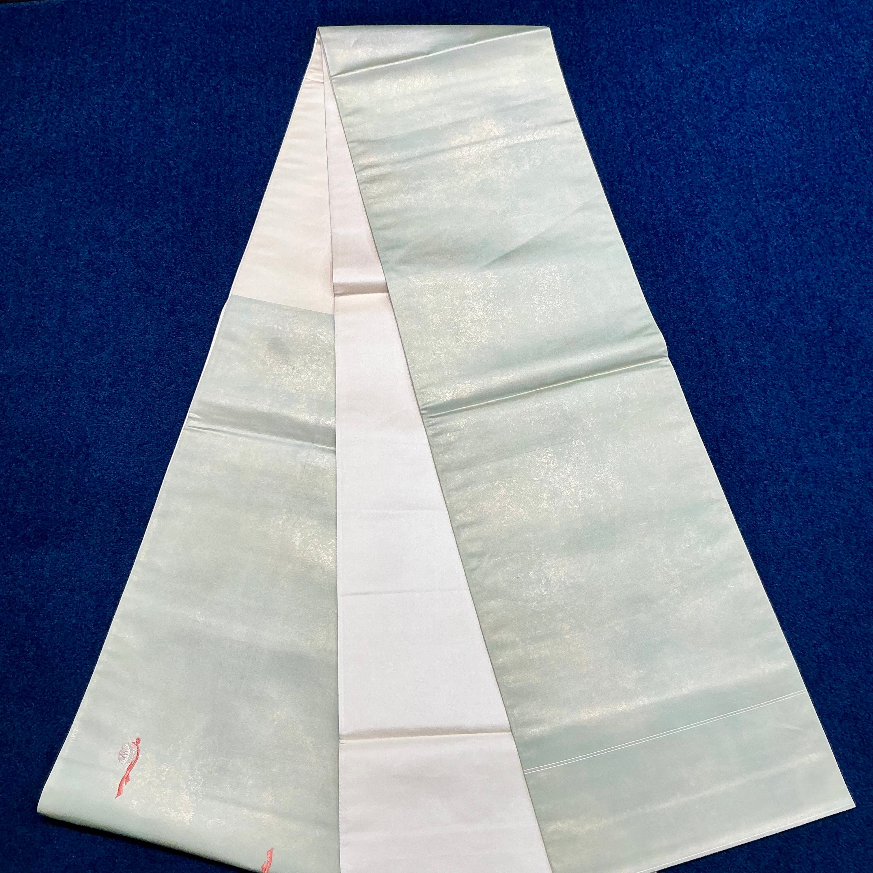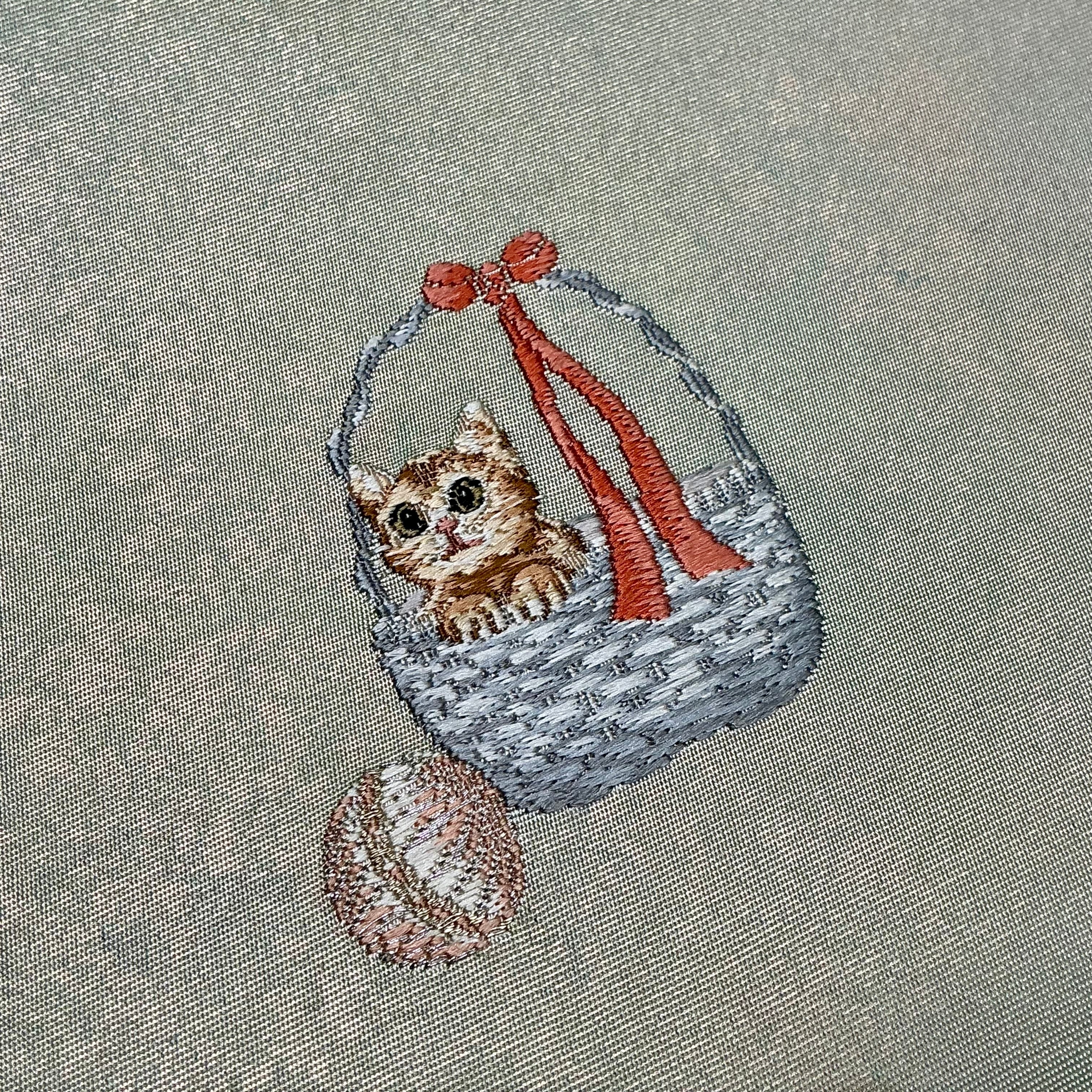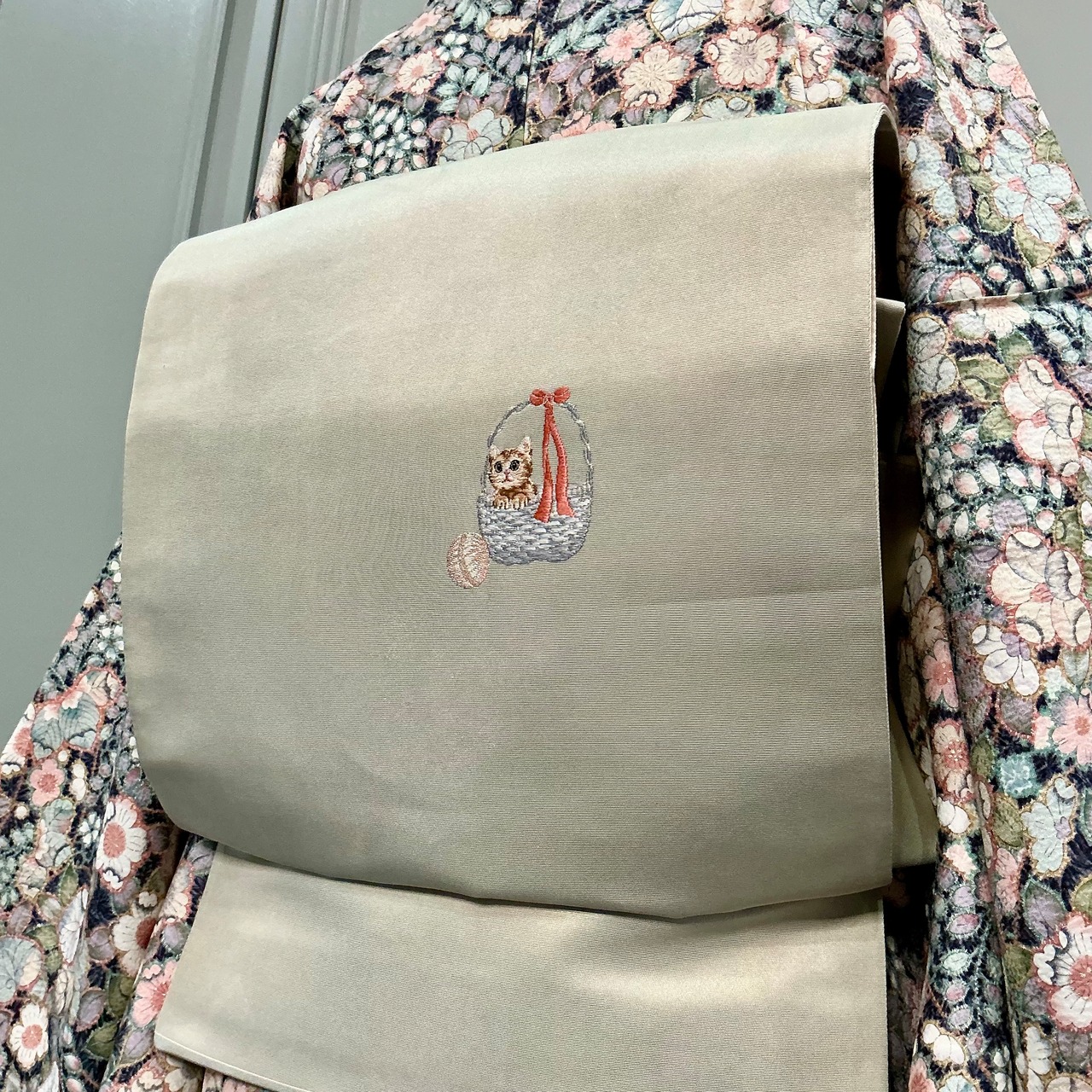 ほんのりとミント×シルバーの地色に、鞠と猫の刺繍がとってもキュートな洒落袋帯です