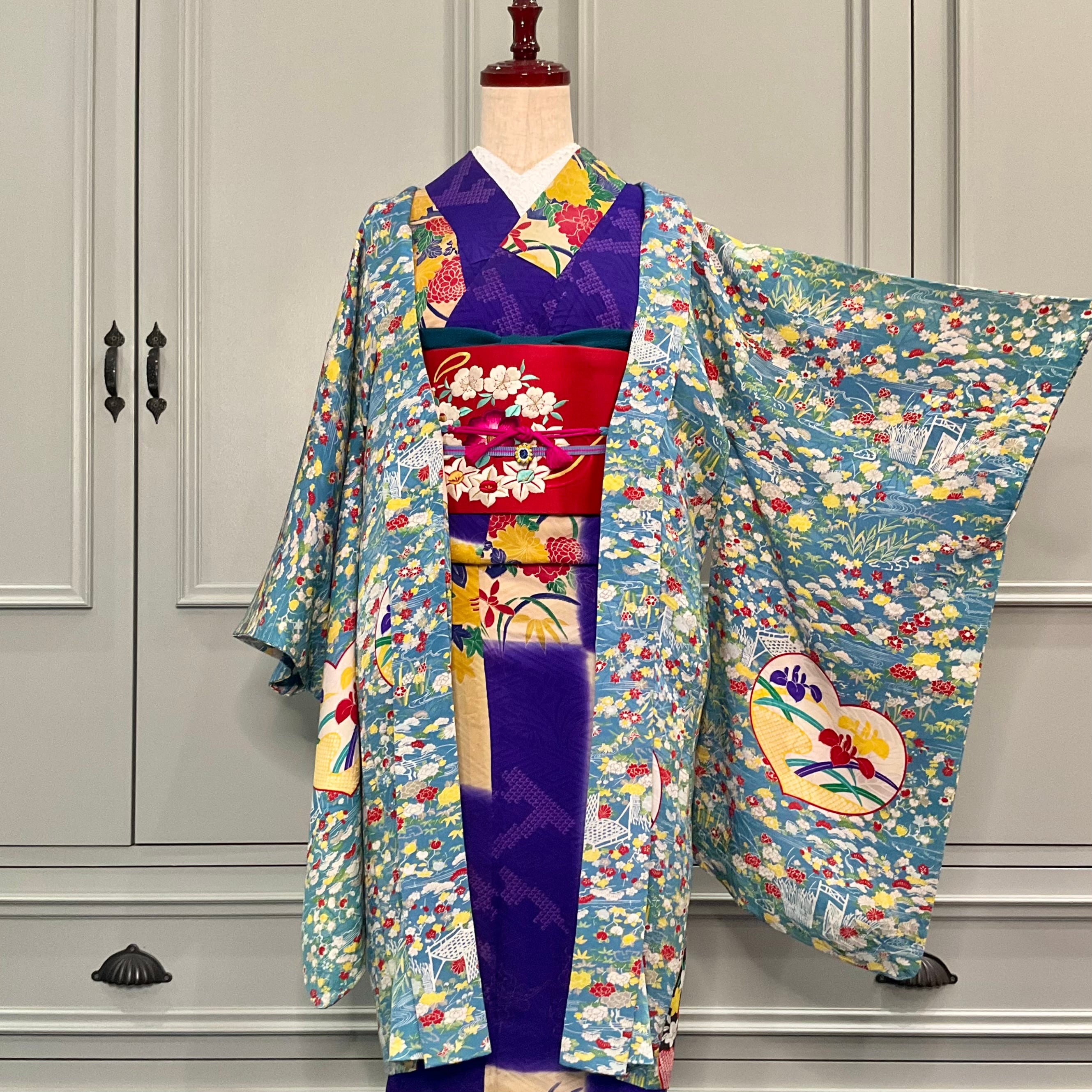 浅葱色の地に、小さな草花の模様と大きな橘が描かれたアンティーク長羽織です