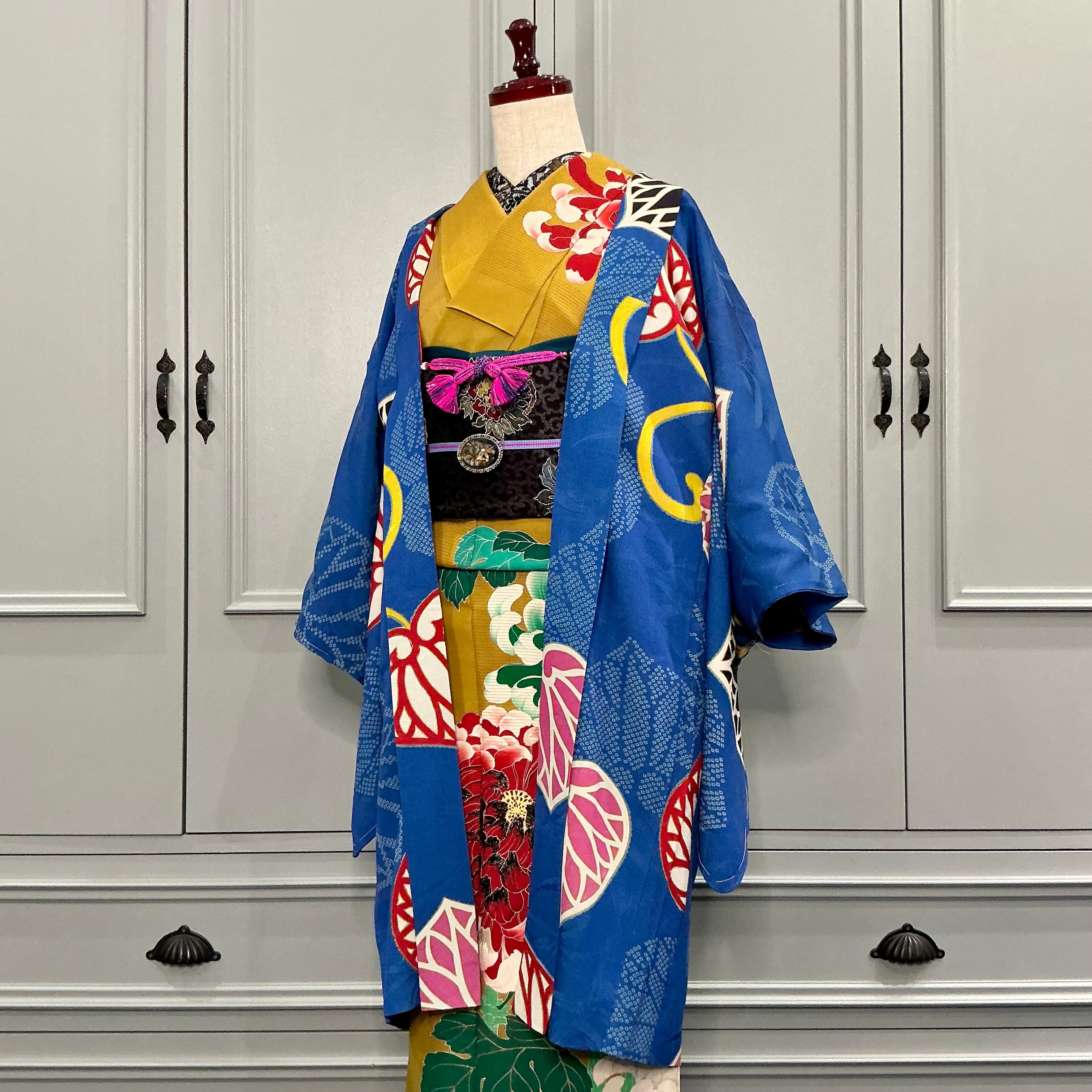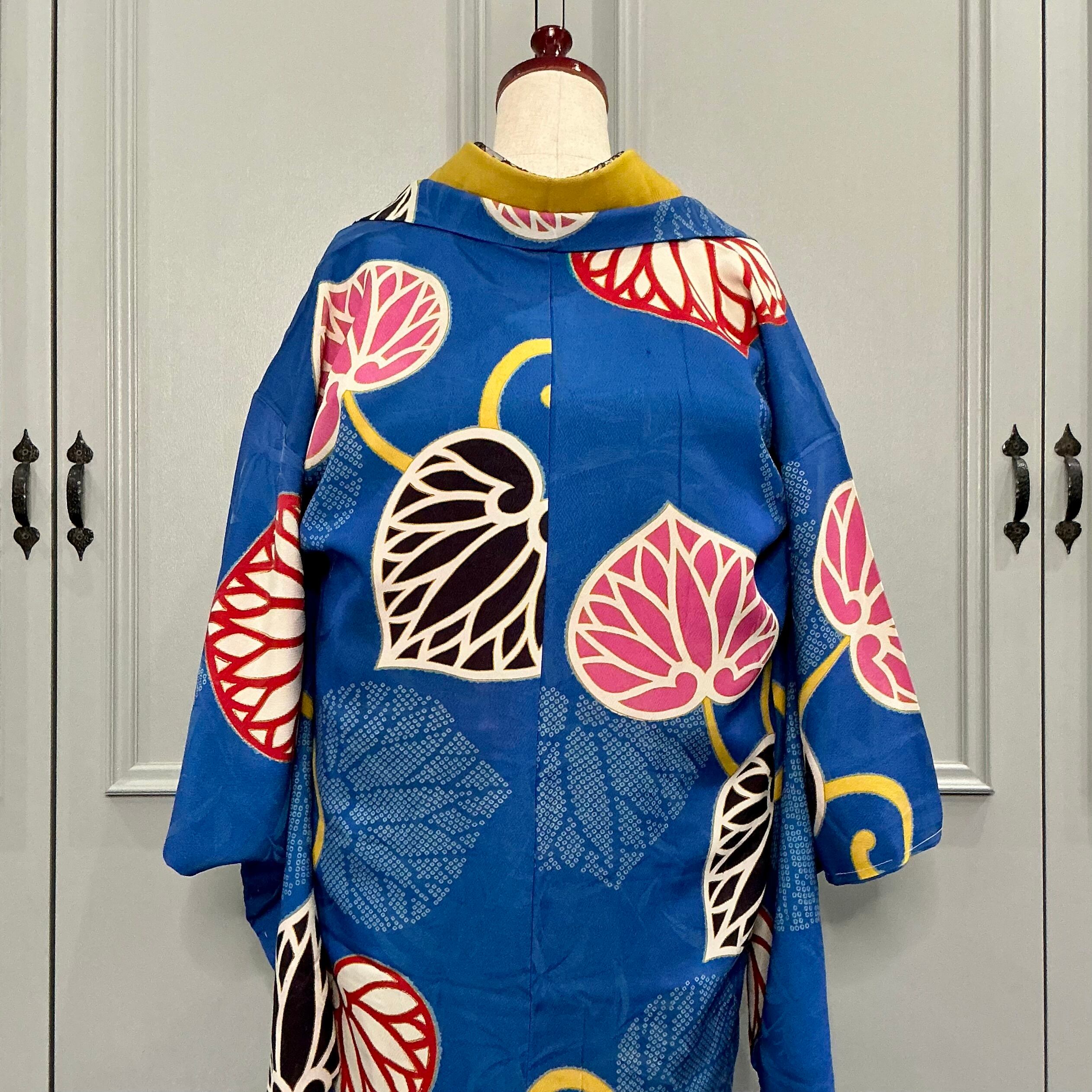 ブルー地に大きな葵の葉っぱが描かれたアンティーク長羽織です