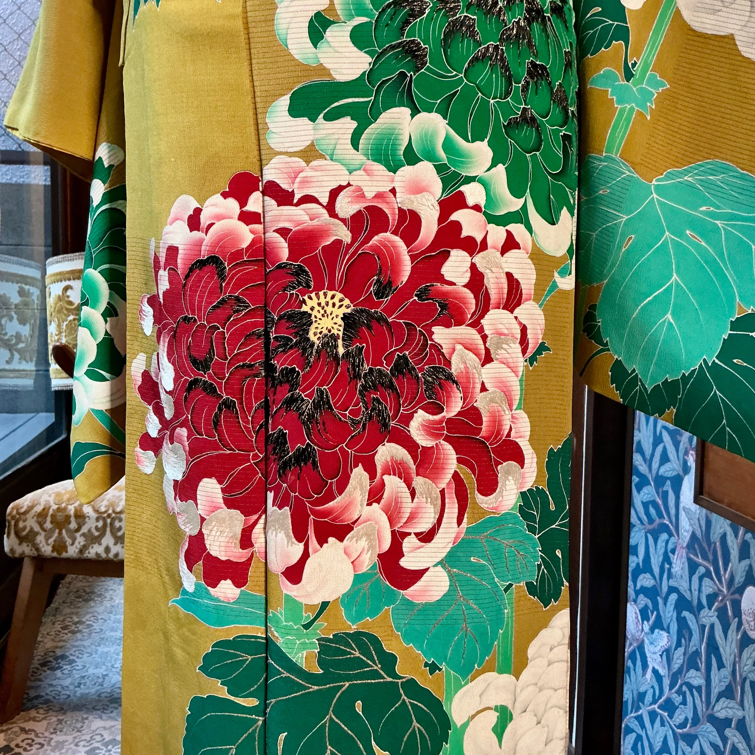 紅、白、緑の大きな菊には刺繍も施され、モダンで大胆なデザイン✨️晴れの日に纏いたい華やかな一着ですね*