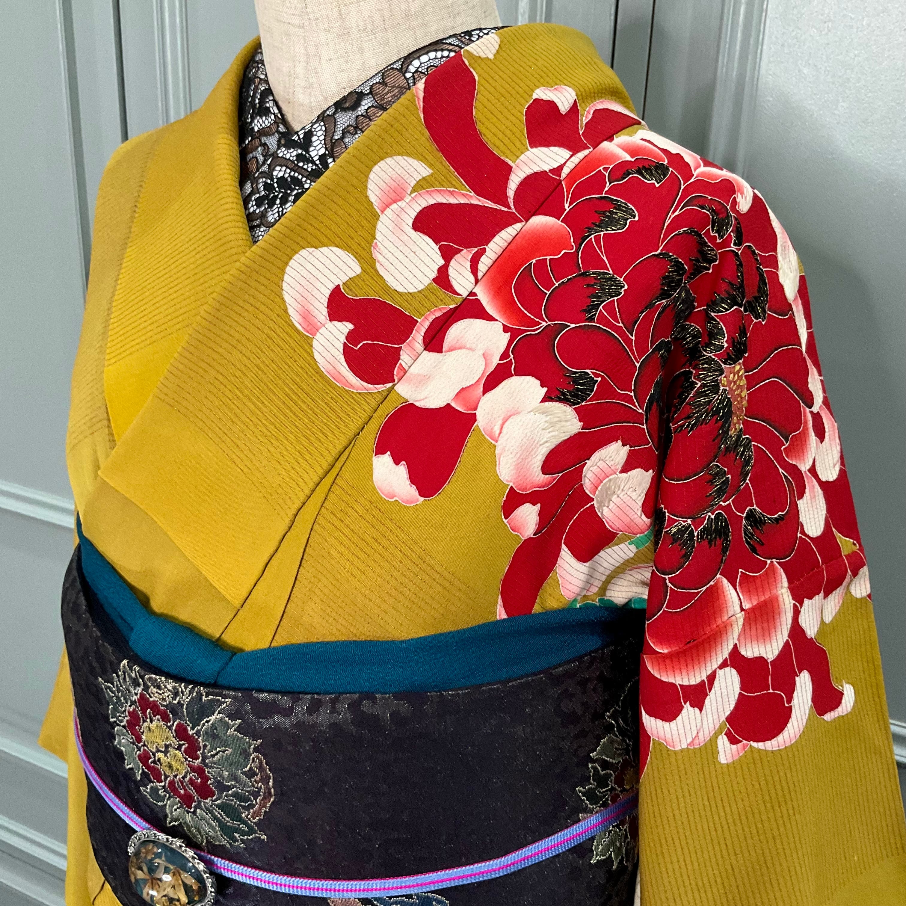 Blessing Mum*菊 刺繍 マスタード 山吹色 芥子 辛子 赤 白 緑 大柄 アンティーク訪問着 結婚式 袴 卒業式 B336