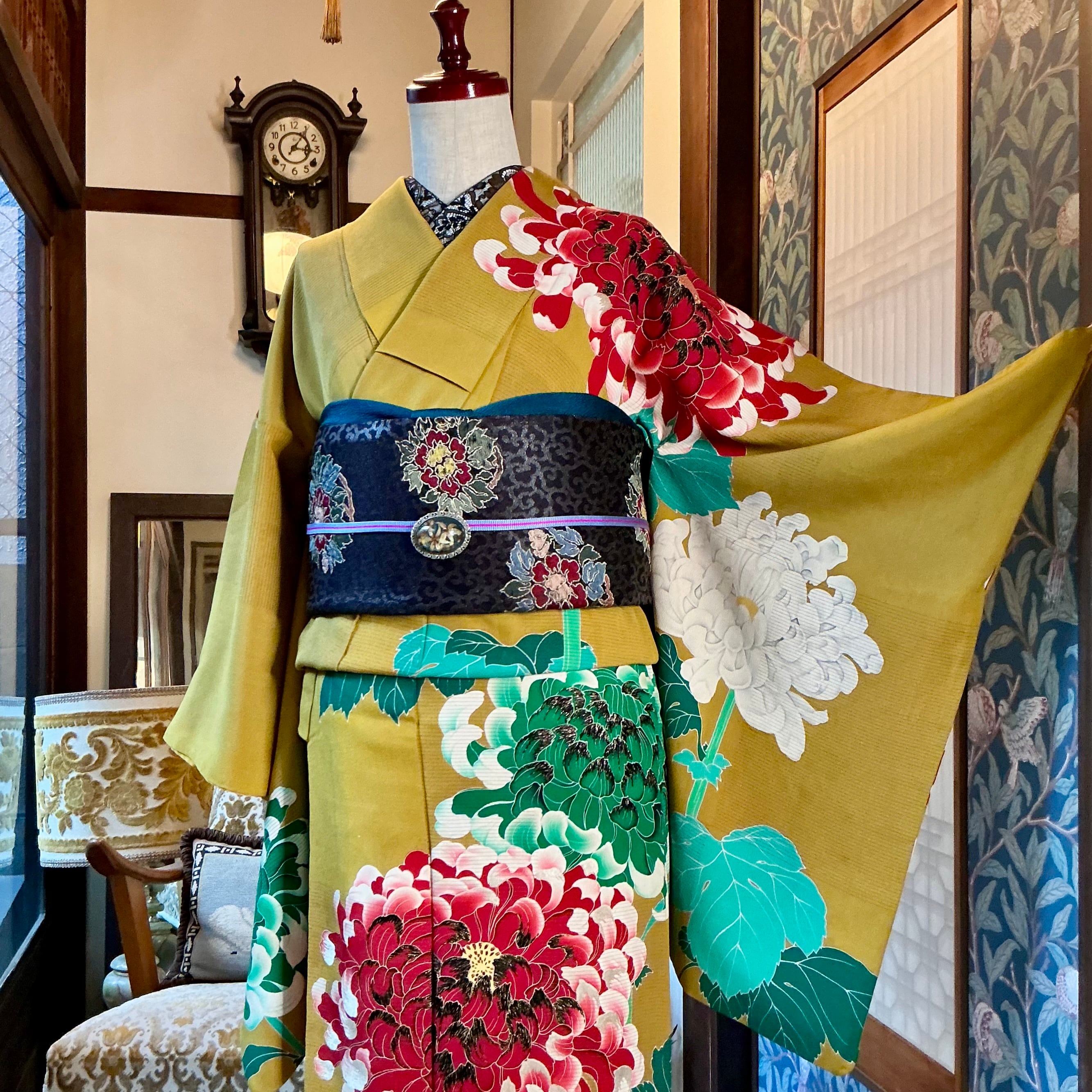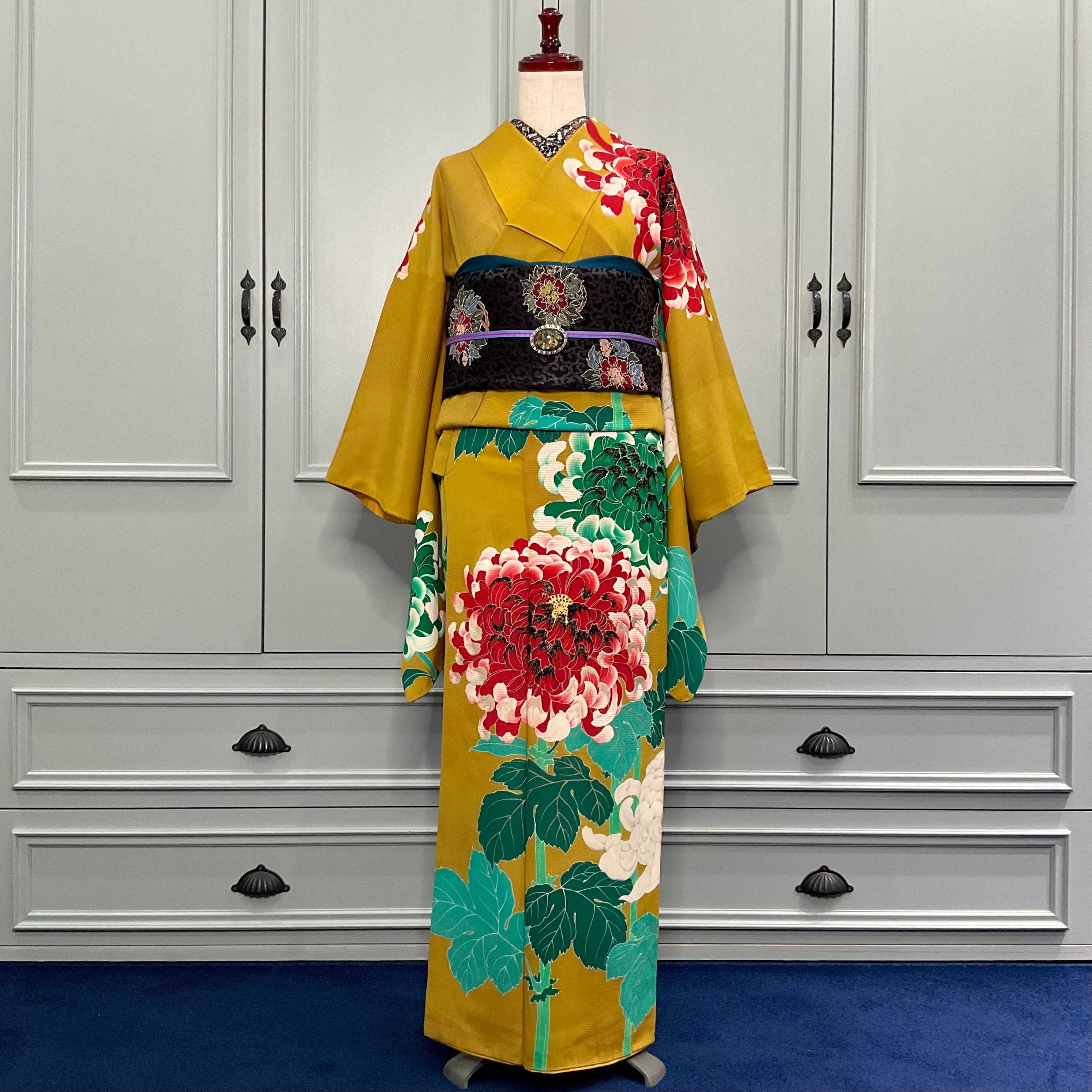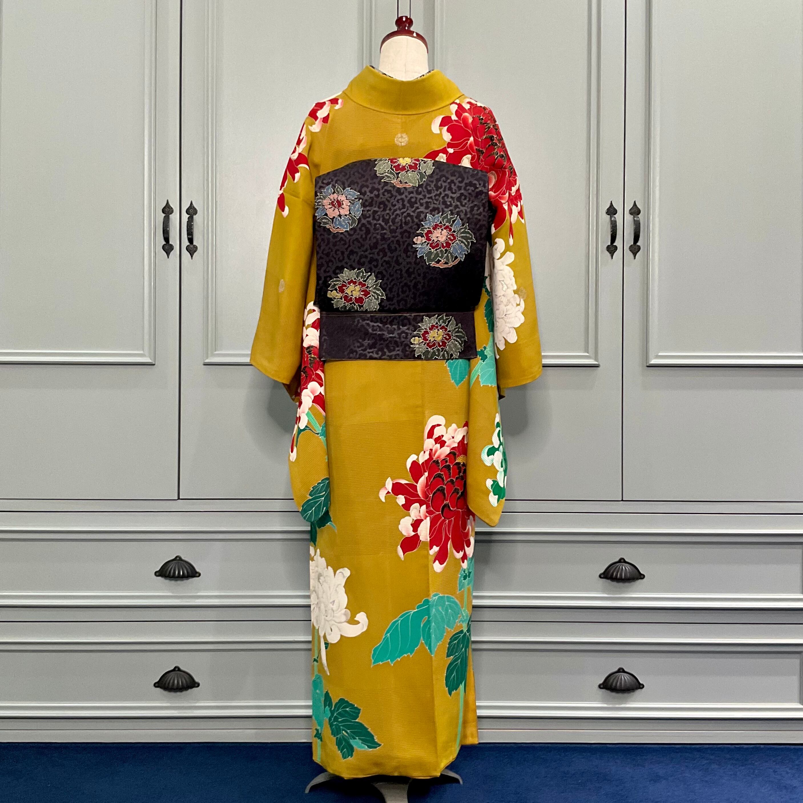 マスタード色の地に、大きな菊のデザインが印象的な袷のアンティーク訪問着です
