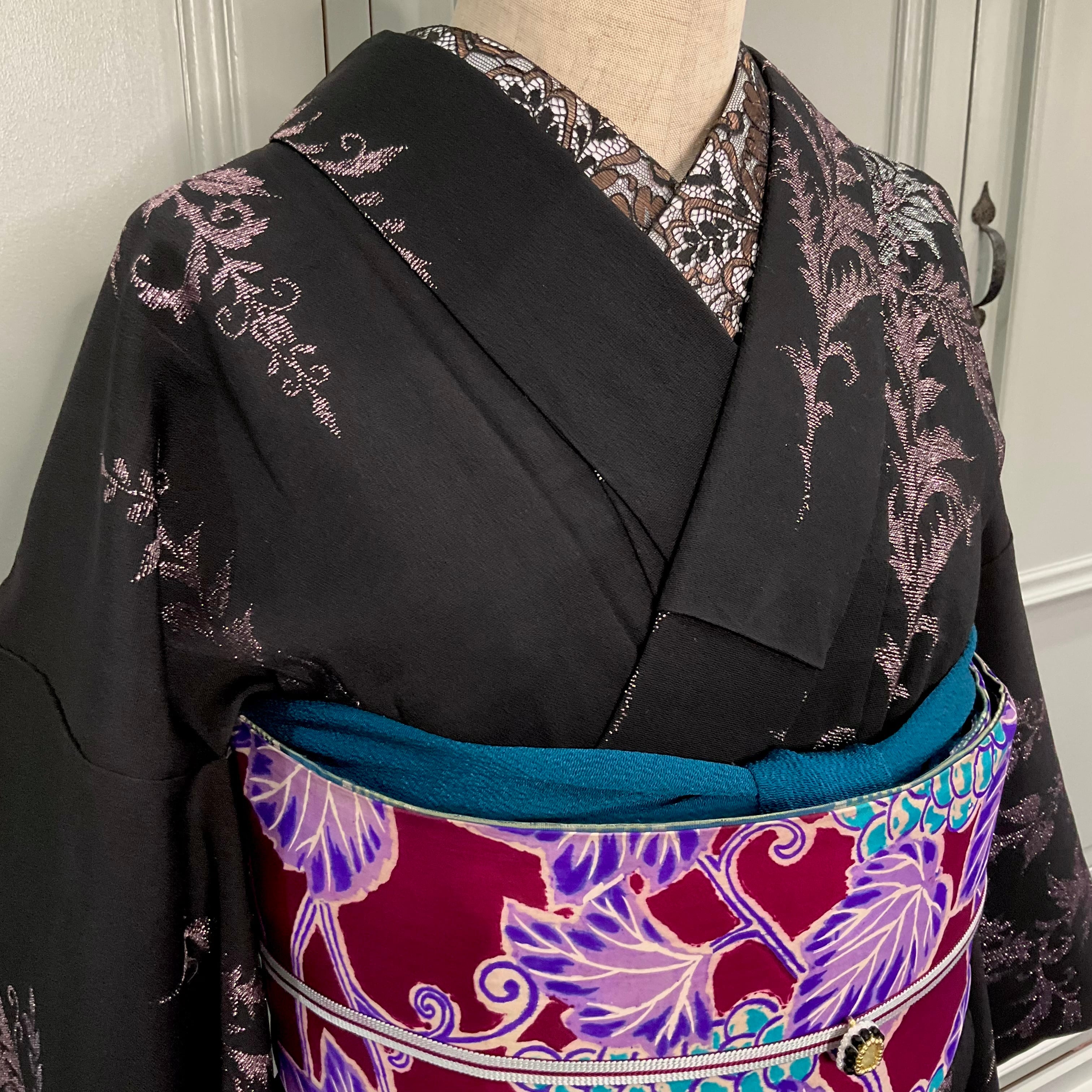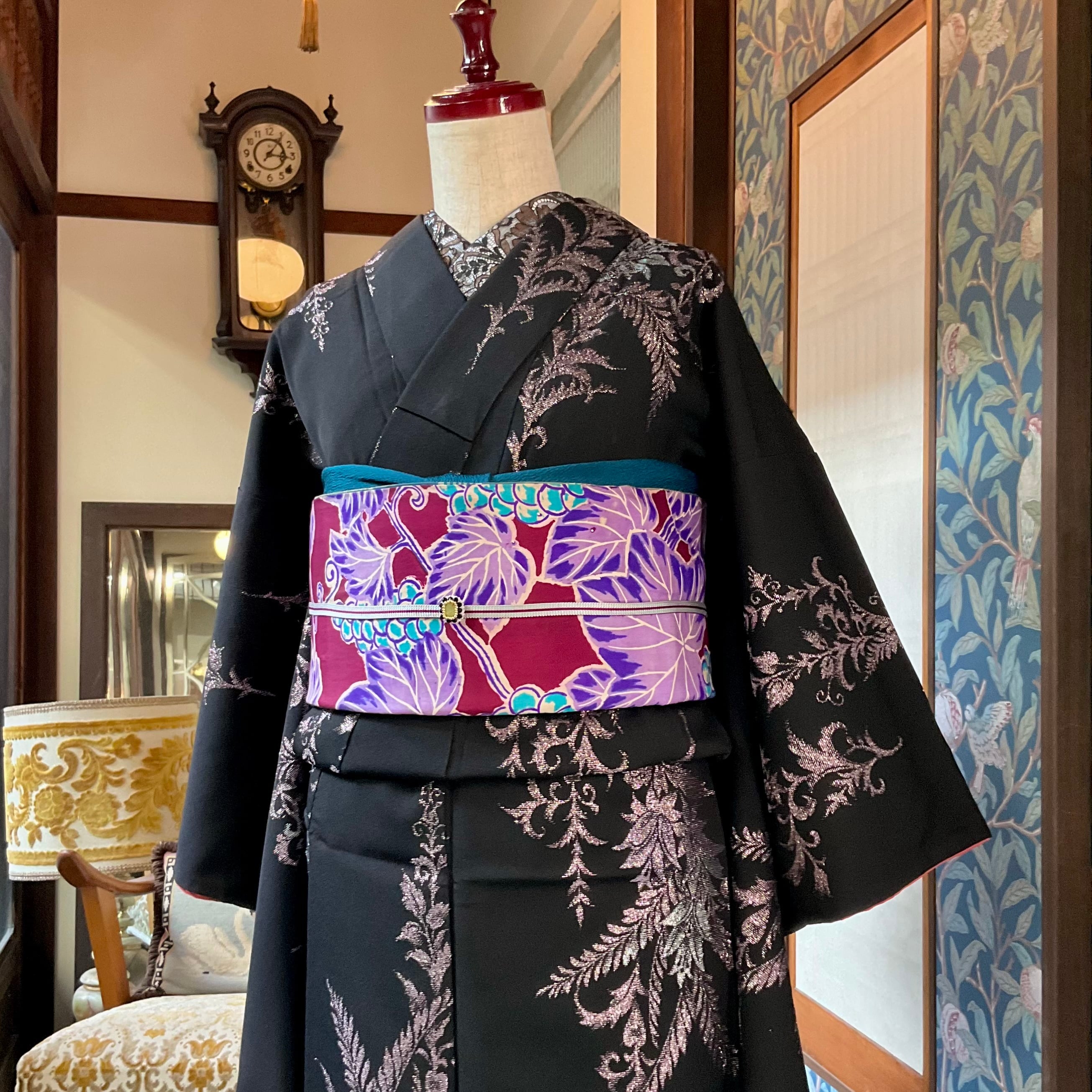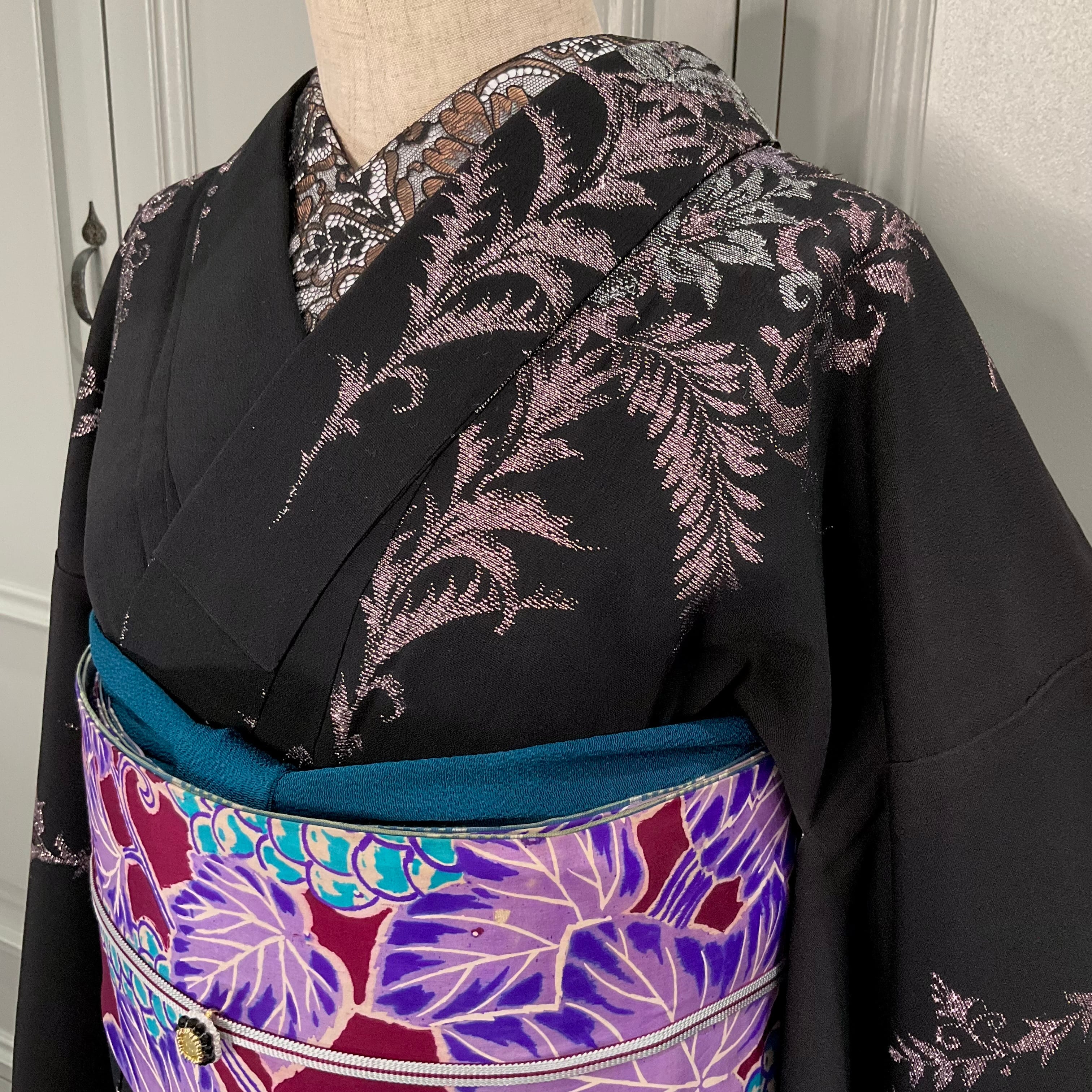 黒地にダマスクのような柄のセミアンティークのマジョリカお召着物です