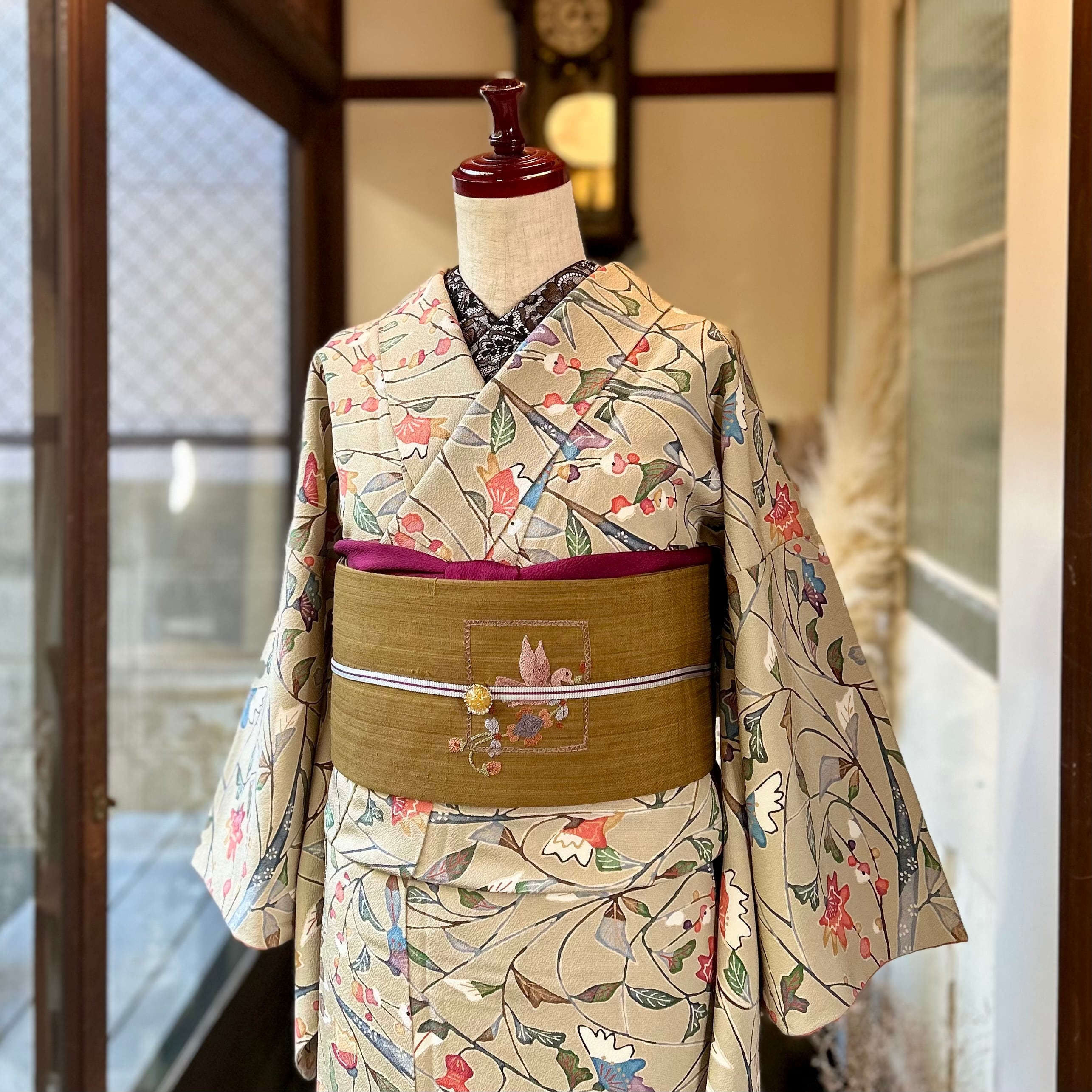 紅型調で味わい深い大人な表情で、レッドやブルー、グリーンの彩りに雪持のようなホワイトがブラウンの地色にくっきりと浮かび上がり、上品な華やぎある一着です✨