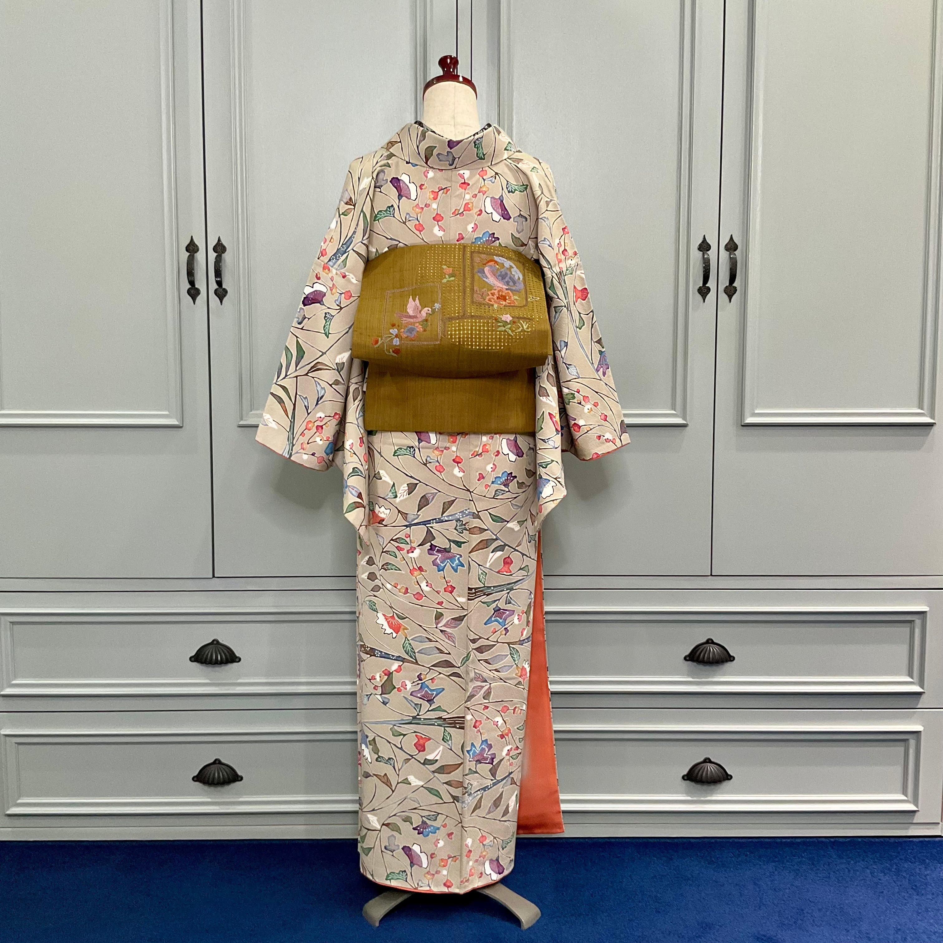 こっくりとしたカフェオレカラーの地色に、色鮮やかな花や枝模様が紅型調に描かれた小紋着物です