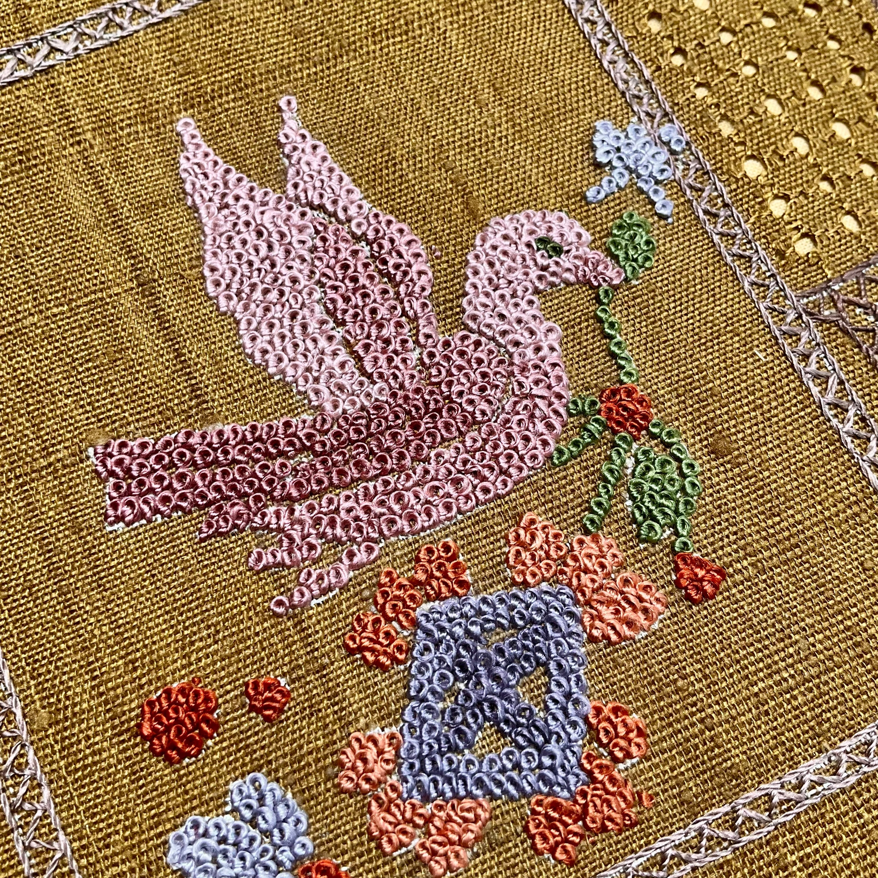 風合い豊かな紬地に、額のように形どられたスクエアの中には細やかな刺繍で施された鳥や花☘️