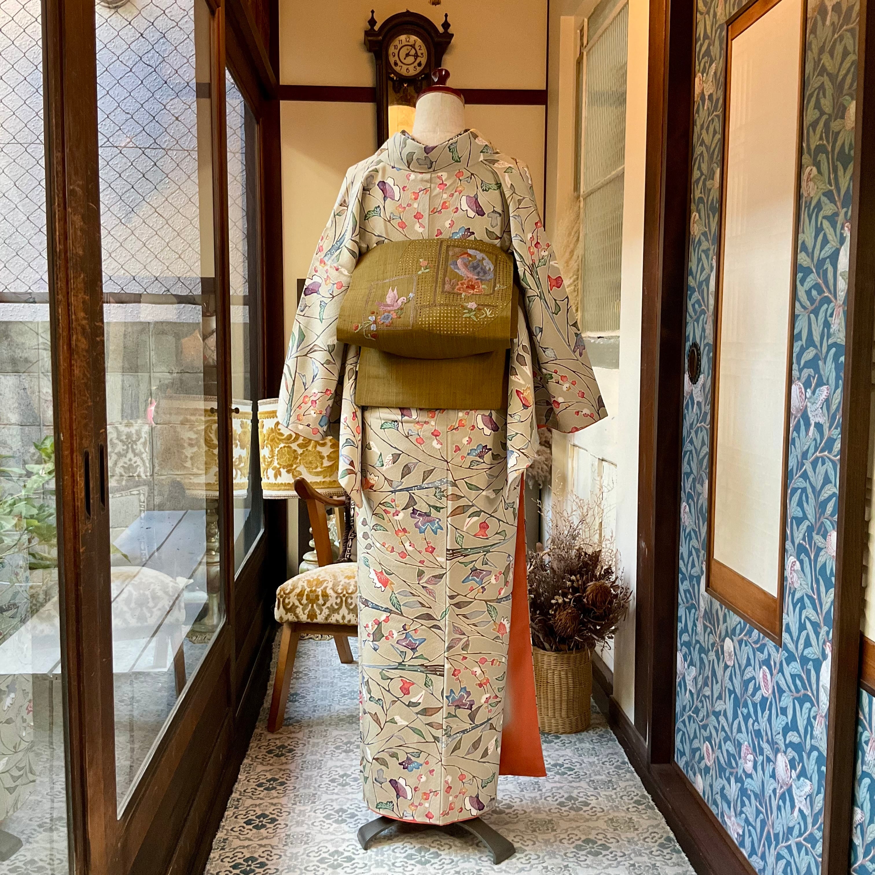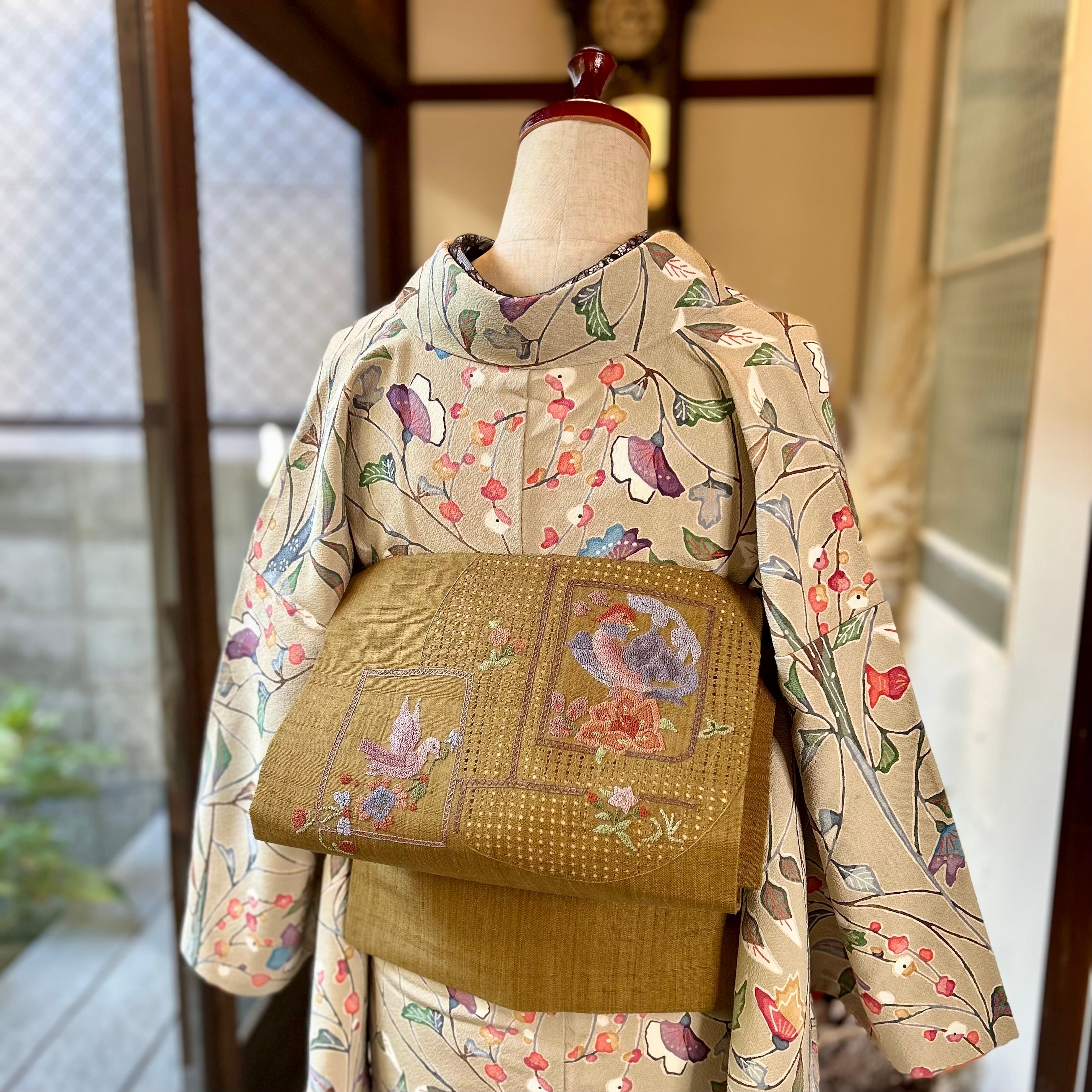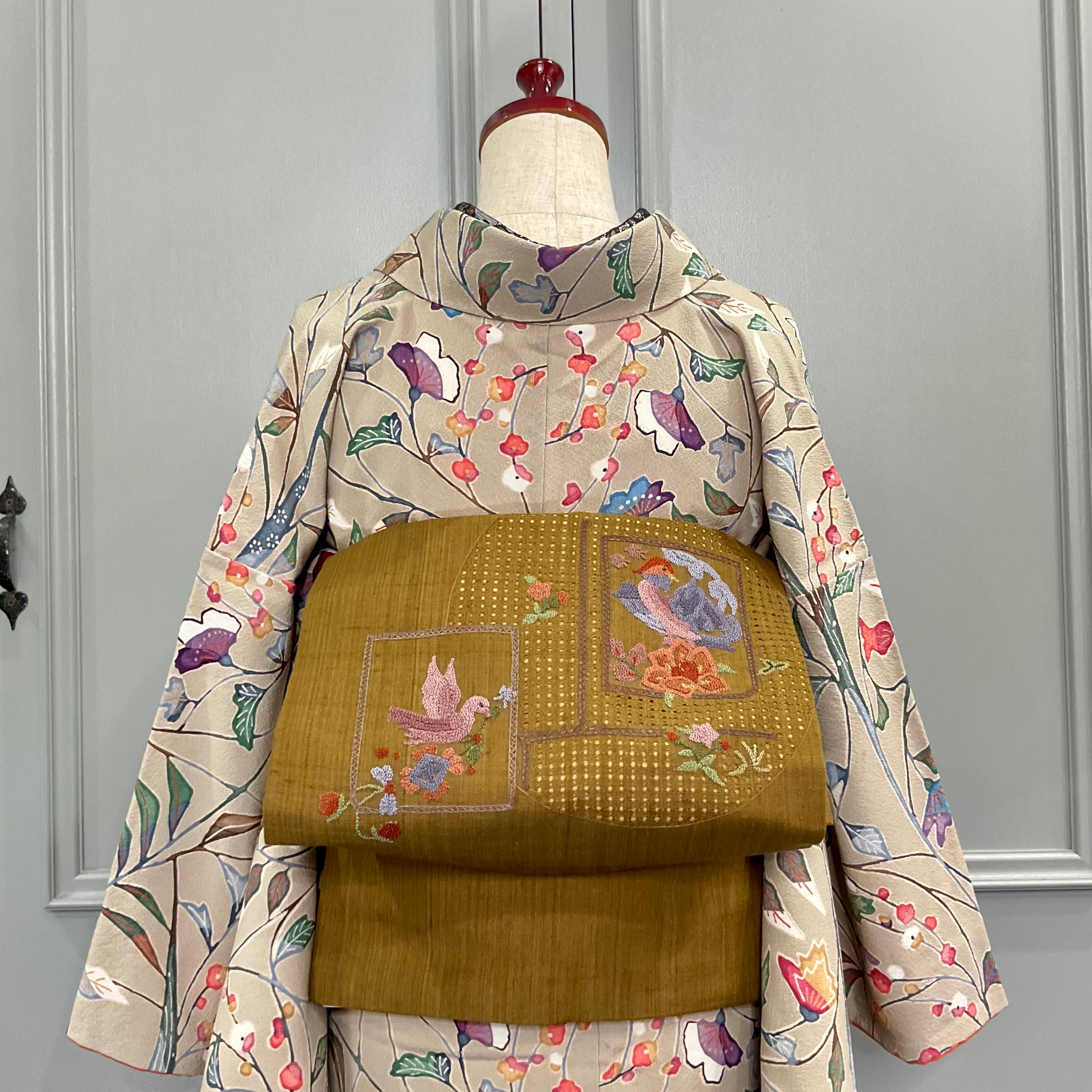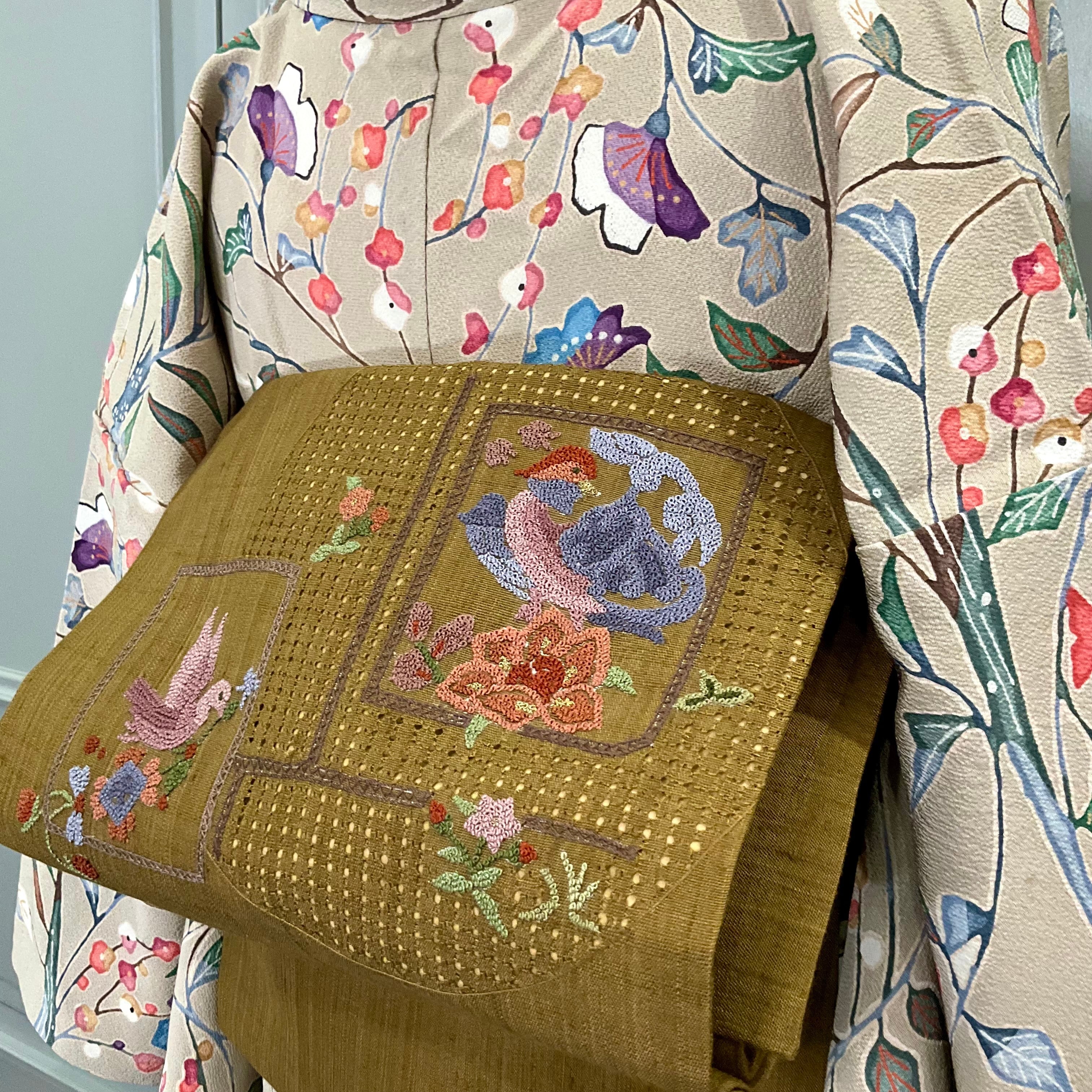 見事な刺繍と鳥の可愛らしさ、鶯茶の落ち着いた色合いの調和がとても魅力的です✨