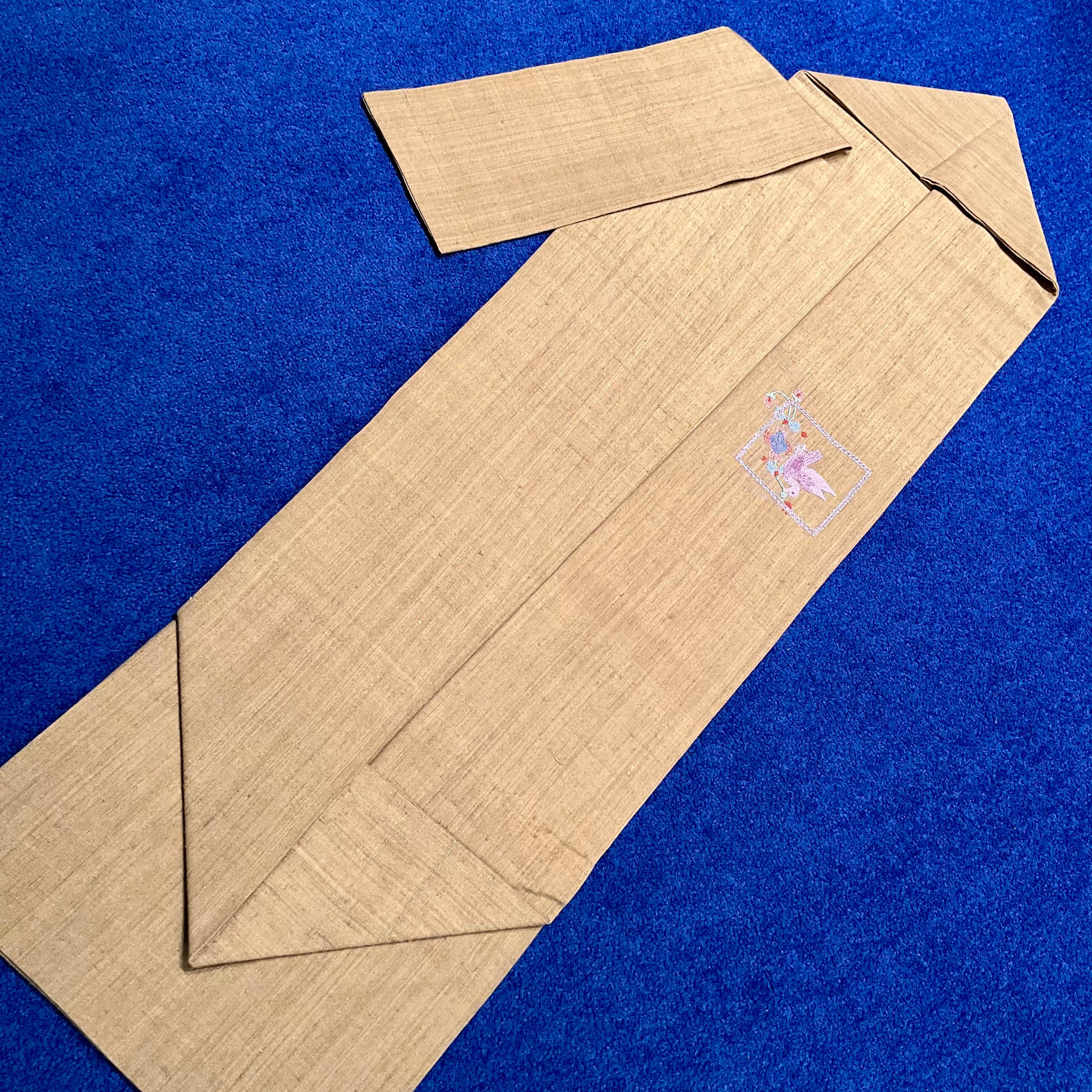 Bird in a frame*相良刺繍 手刺繍 鳥 ブラウン 茶 鶯茶 名古屋帯 B342