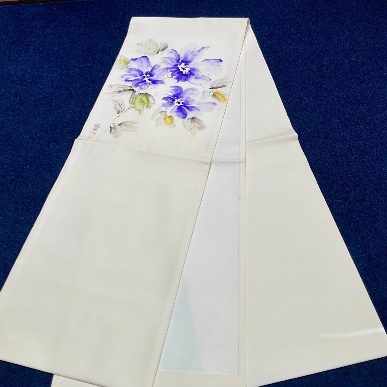 少しやわらかいホワイトの地色が表情をやさしくし、お太鼓と胴前に美しい青紫色で水彩画のように描かれたお花が艶やかに咲く姿は、背中の表情を豊かにしてくれていますね✨