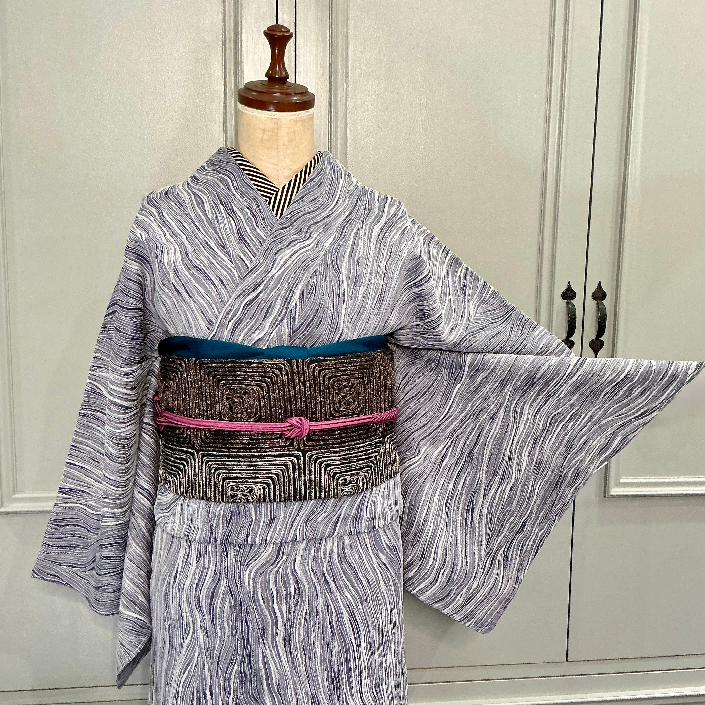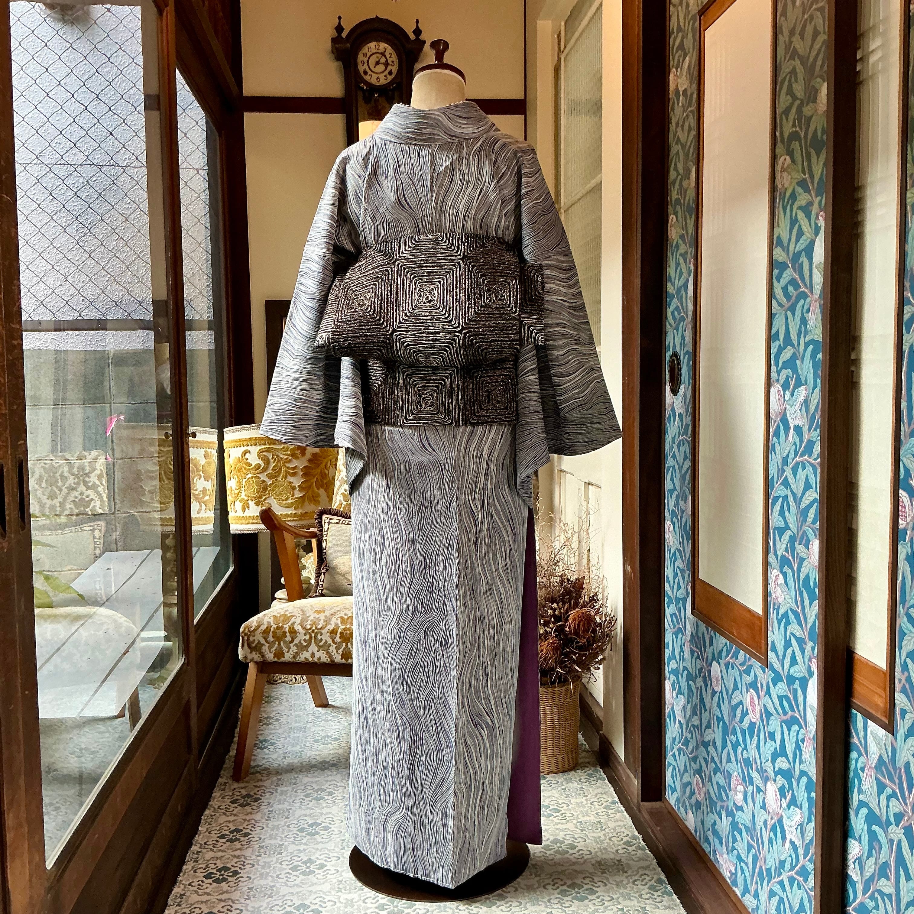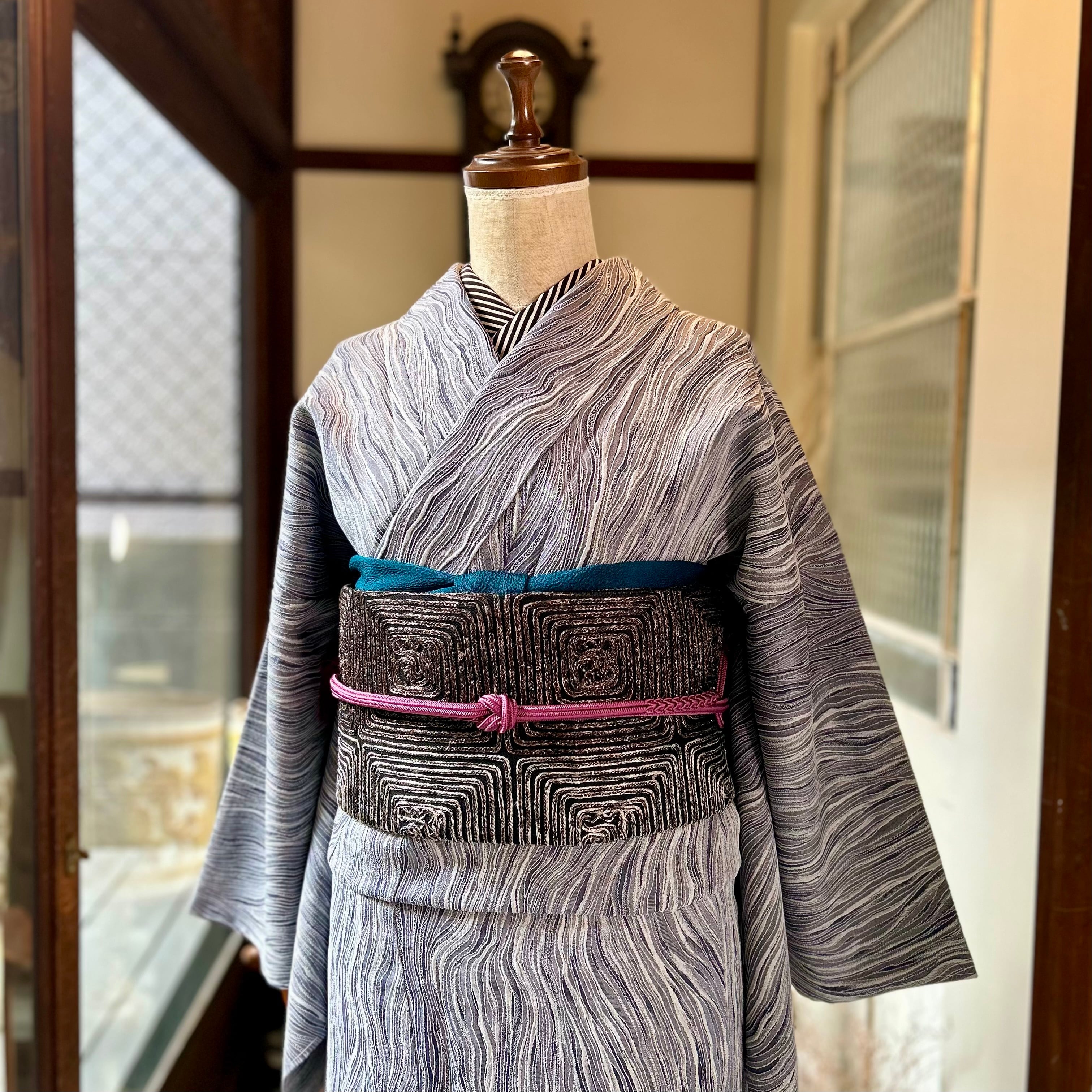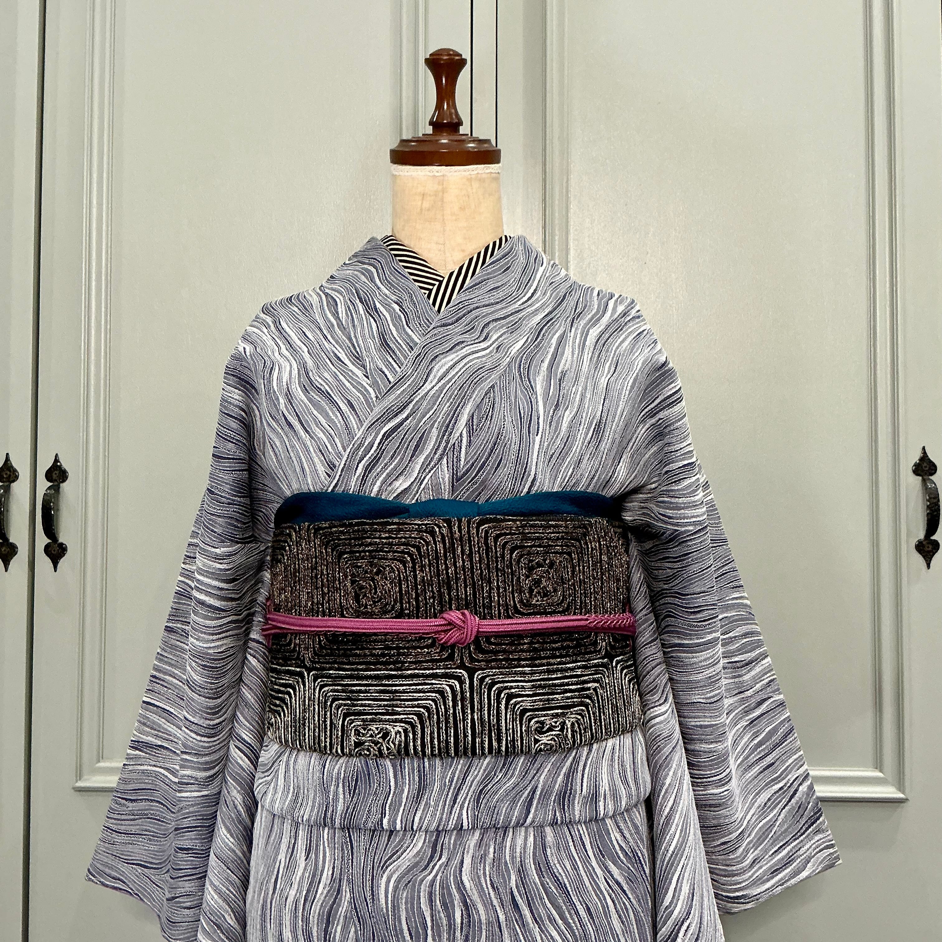 墨黒、灰の地色に流れるような縞模様の輝宝織が美しい袷の小紋着物です