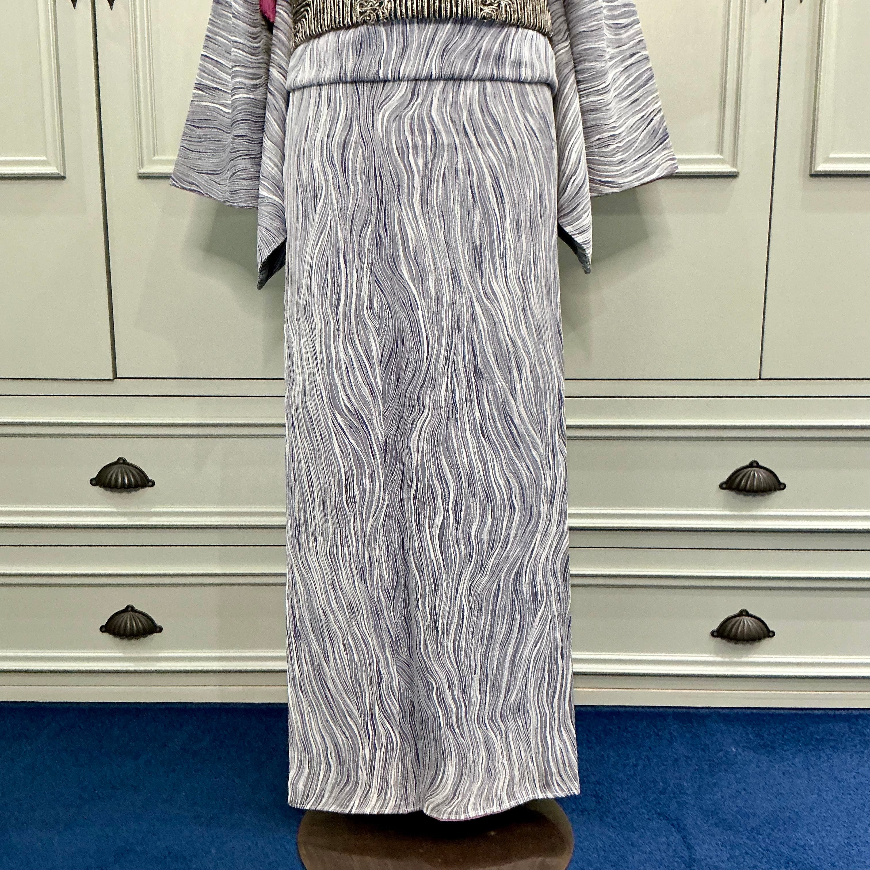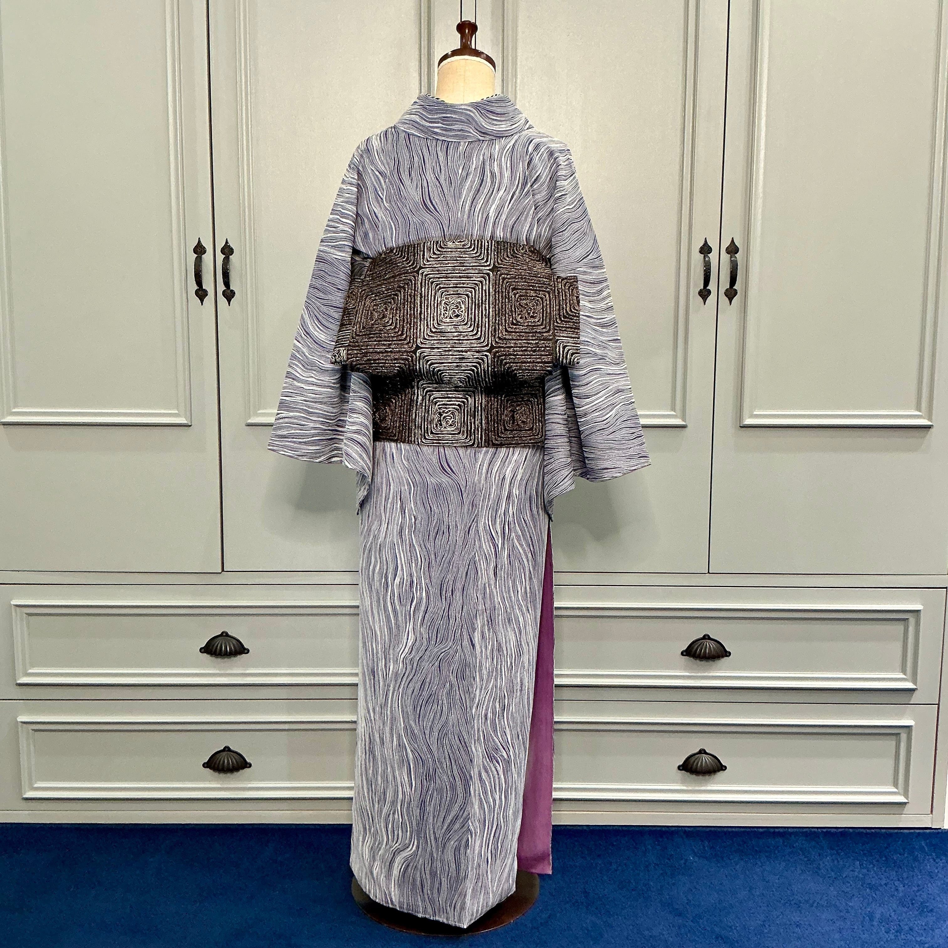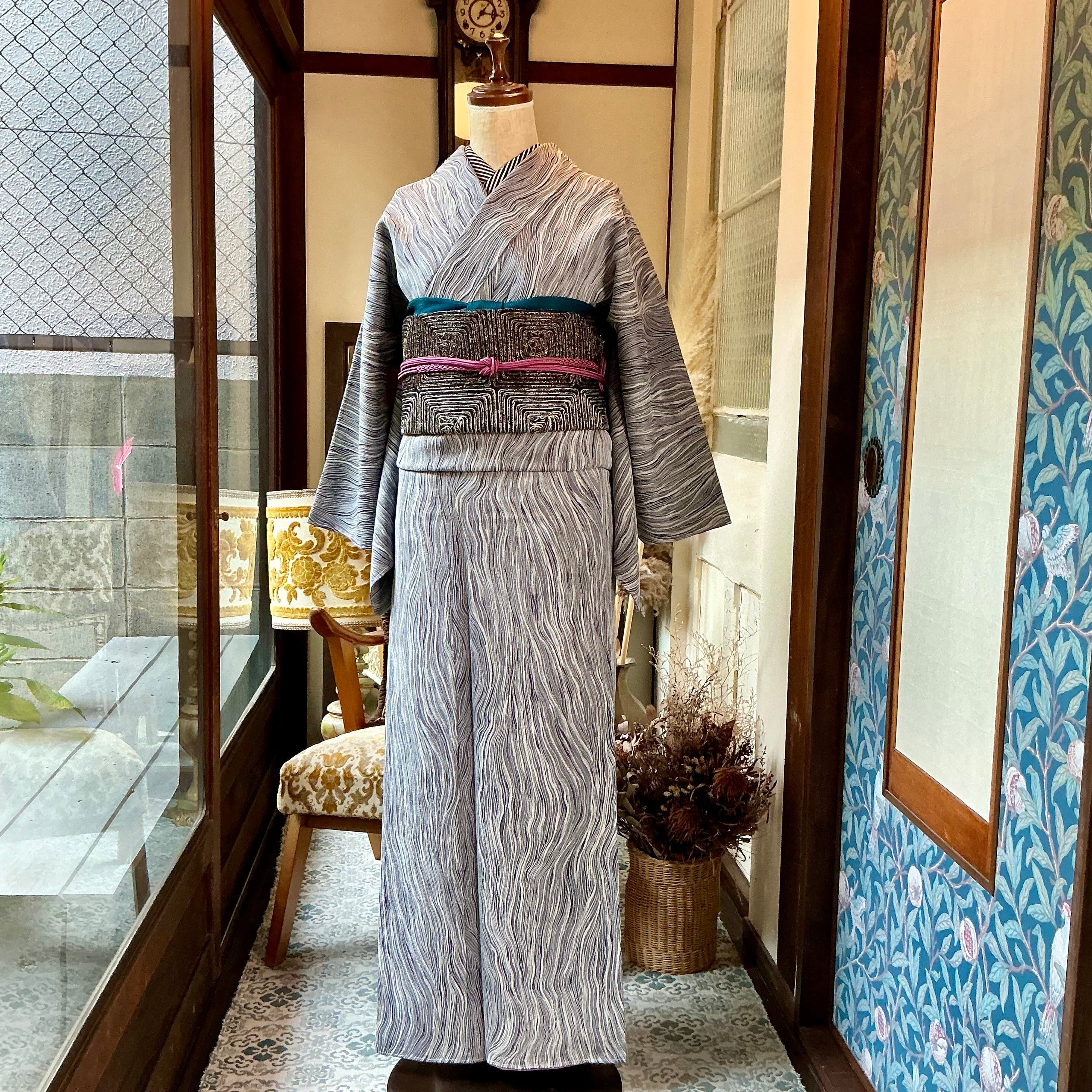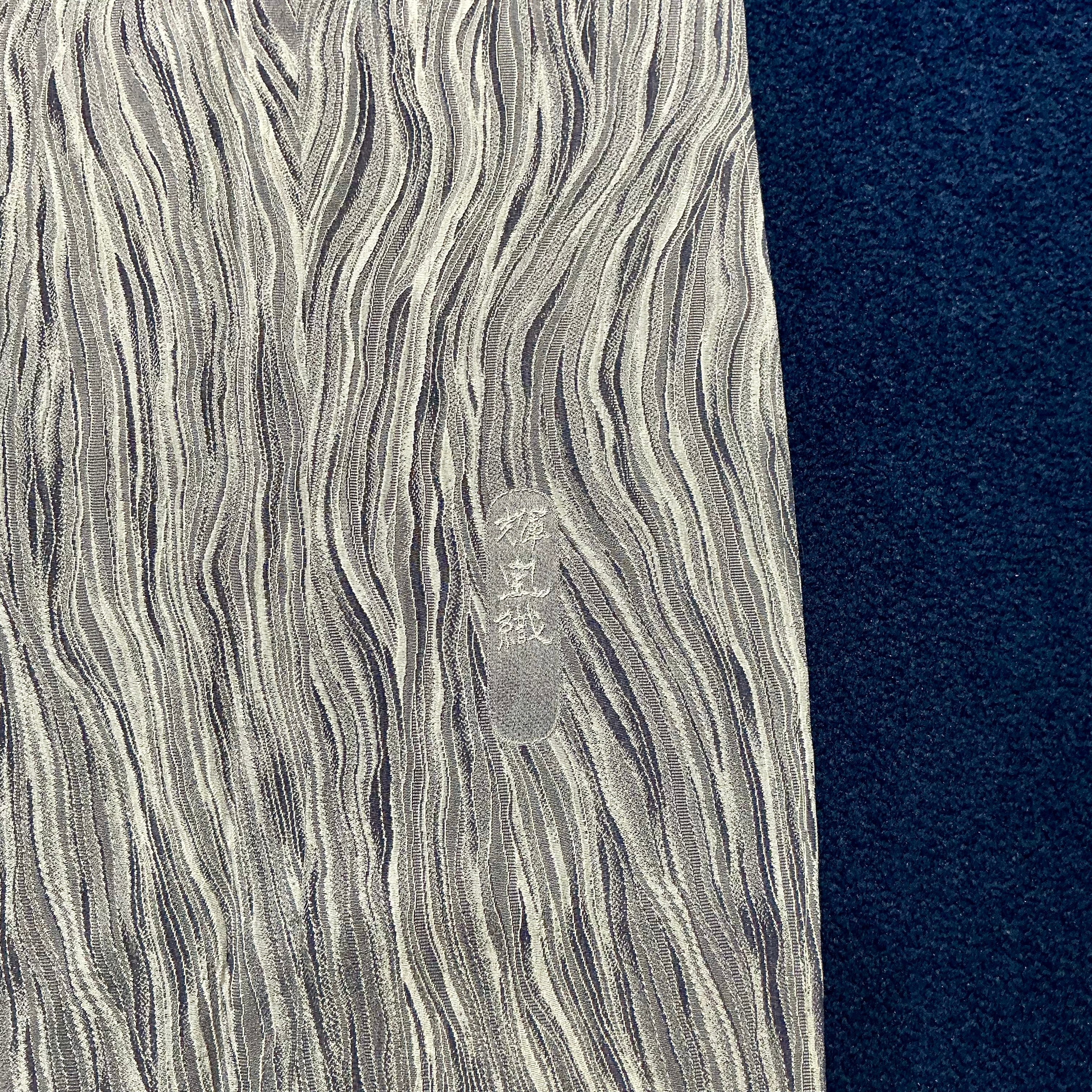 墨黒、灰の地色に流れるような縞模様の輝宝織が美しい袷の小紋着物です