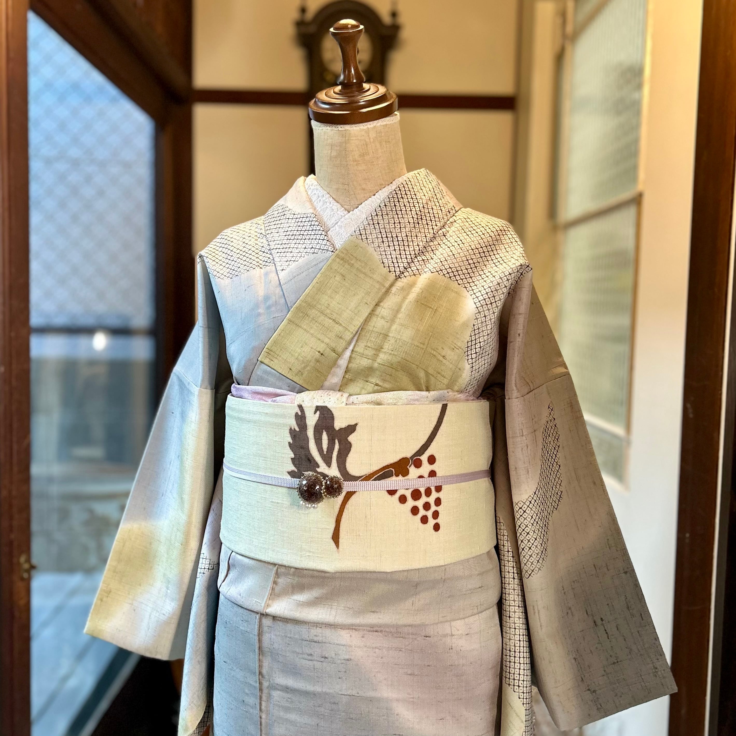 ○合わせた着物、オリジナル帯揚げビリジアングリーンとオリジナル三分紐ミント×プラムはweb shop掲載品です♪