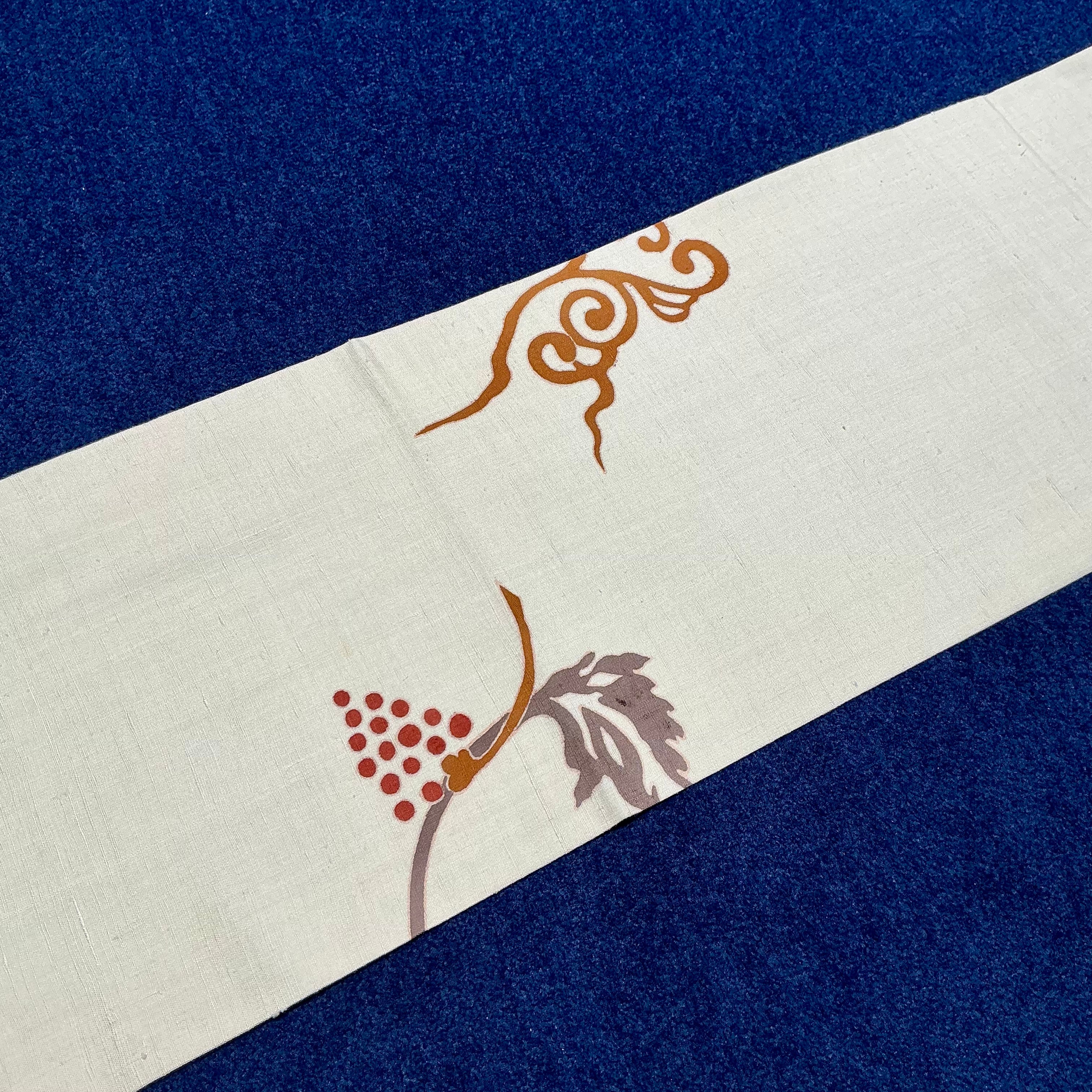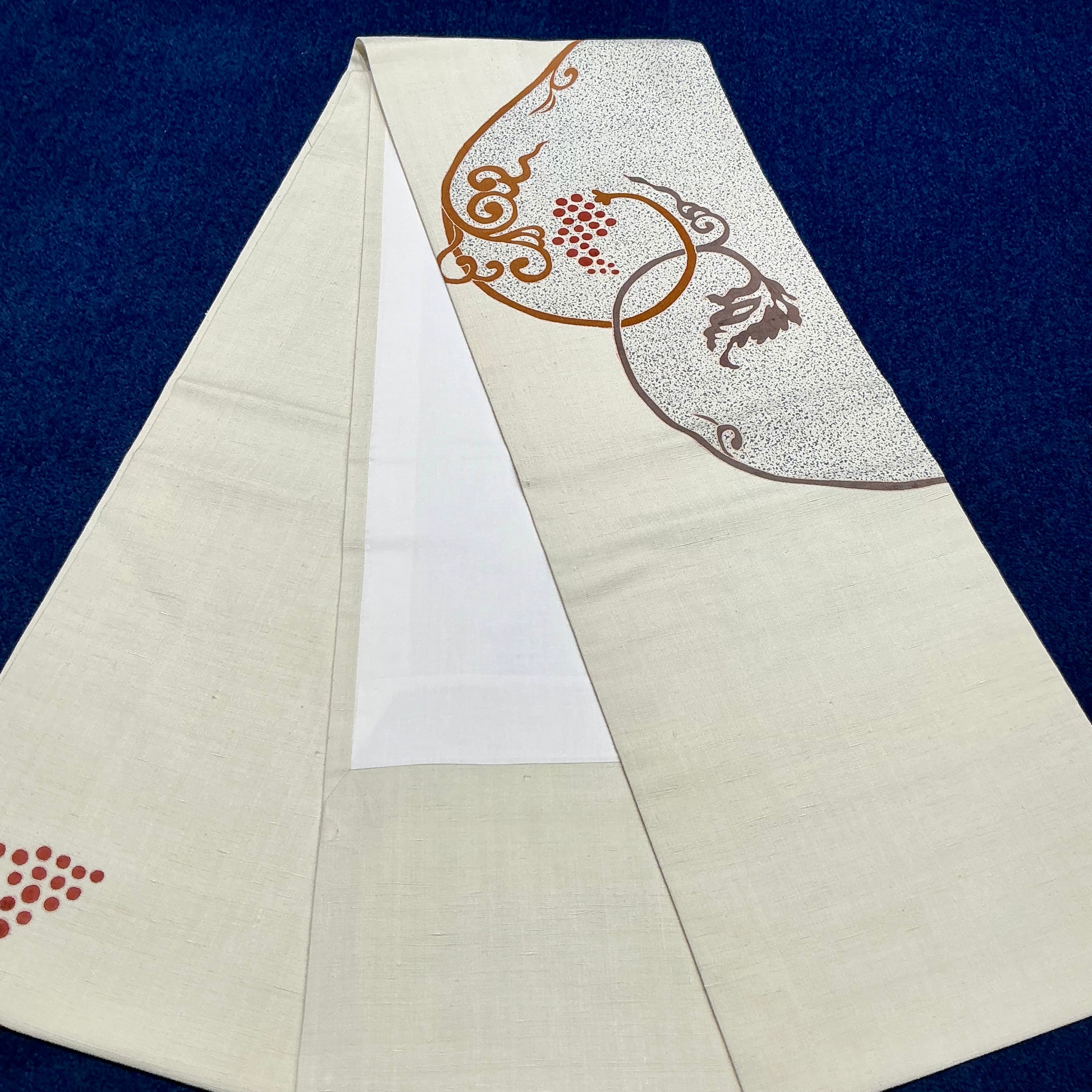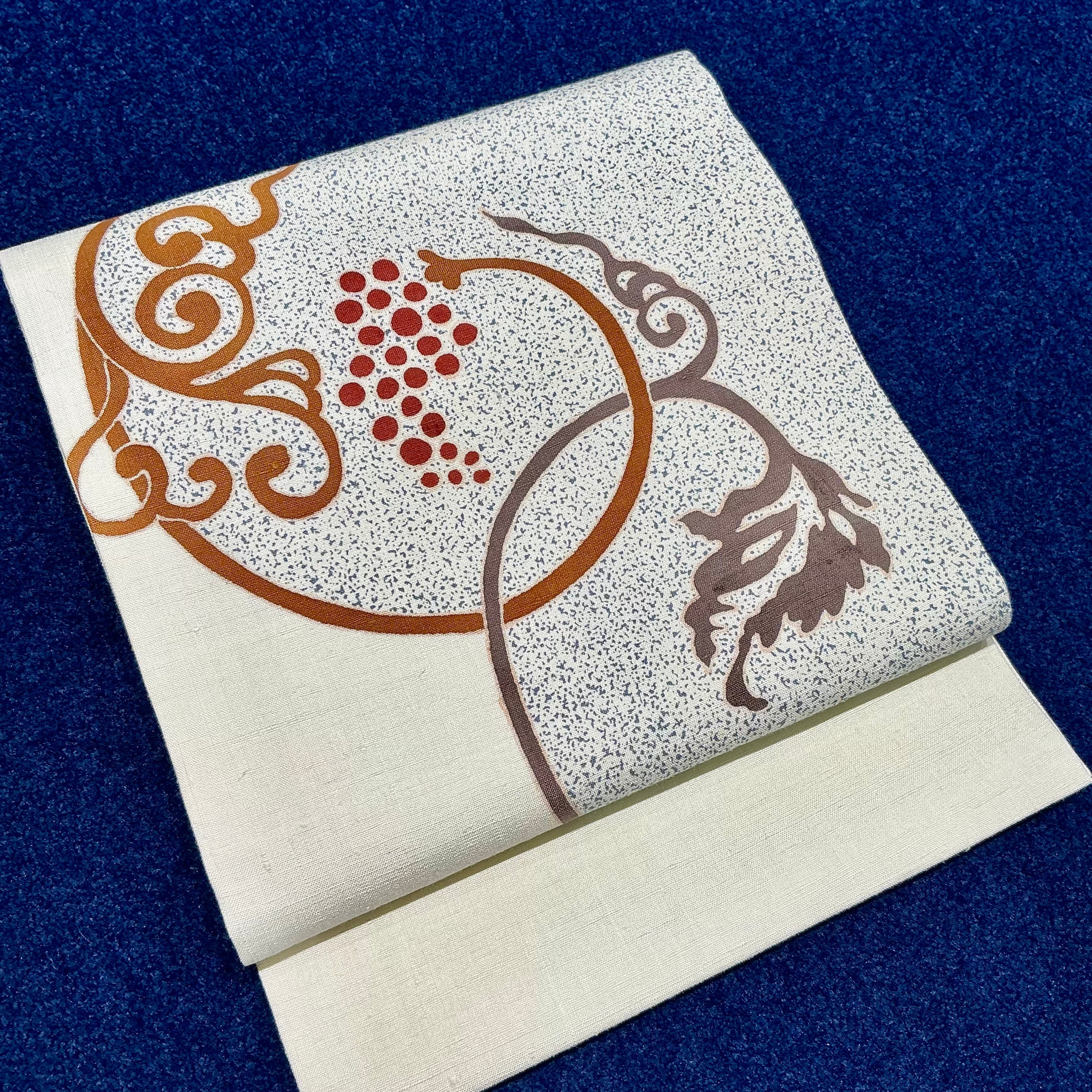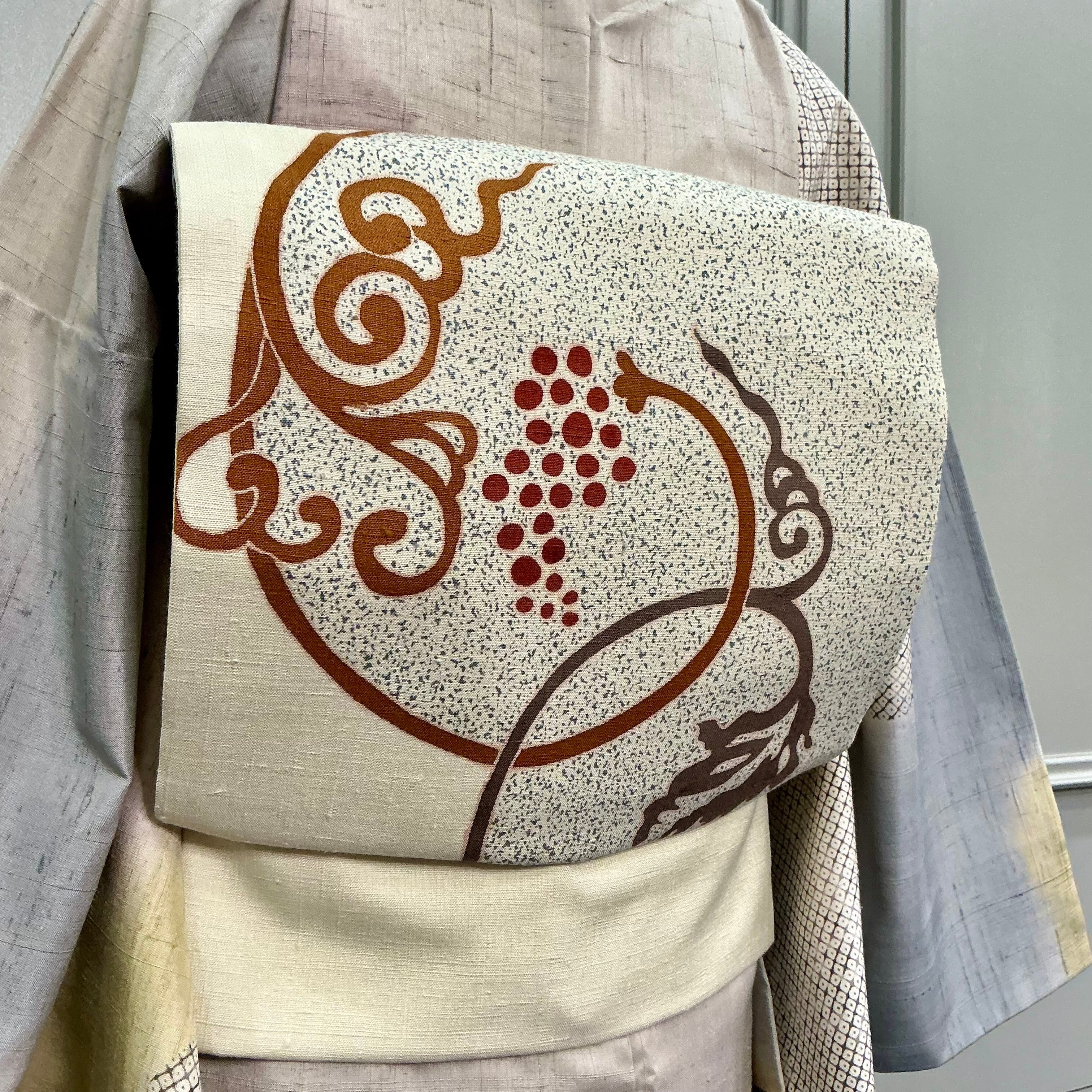 生成の地色に、ぶどうのモチーフが描かれた名古屋帯です