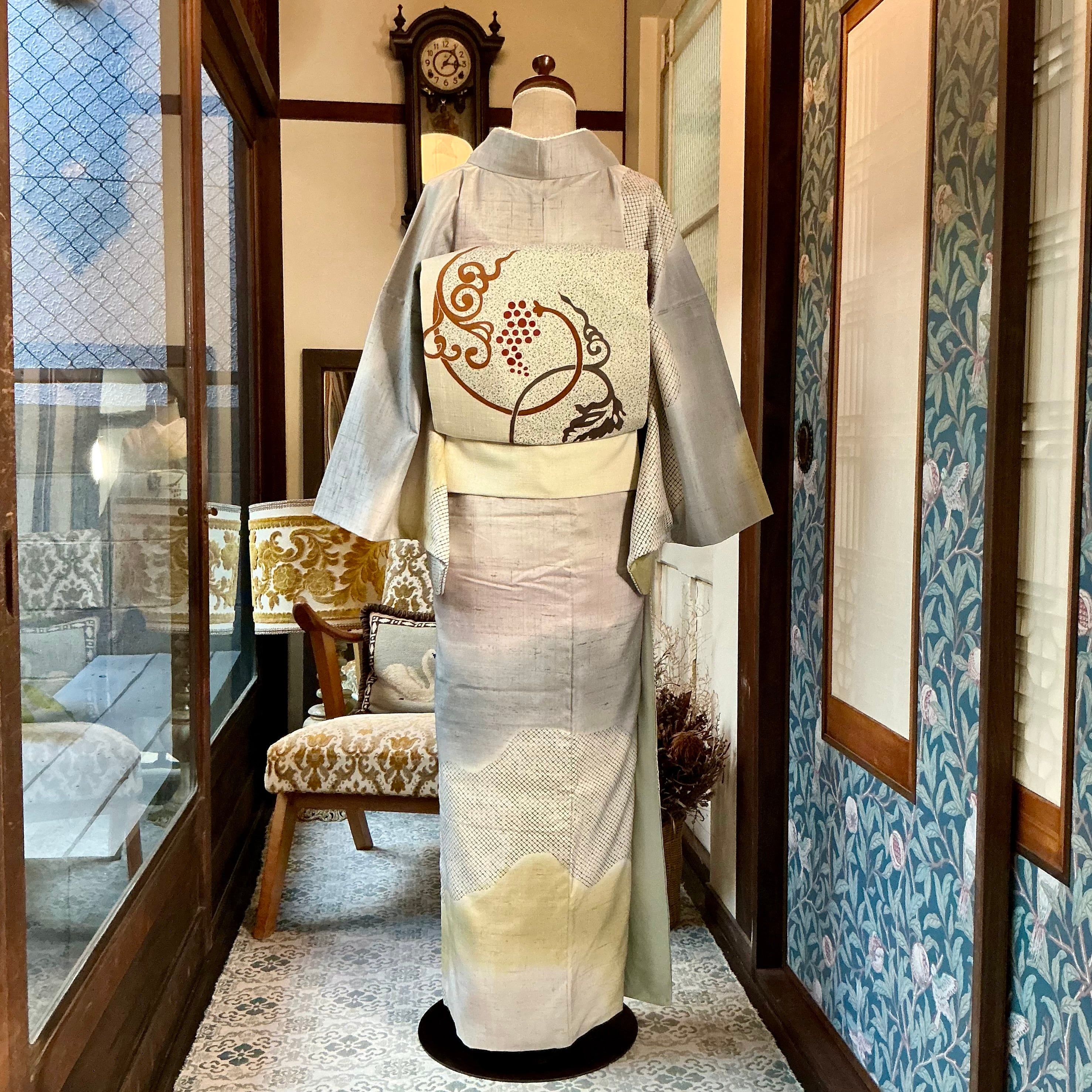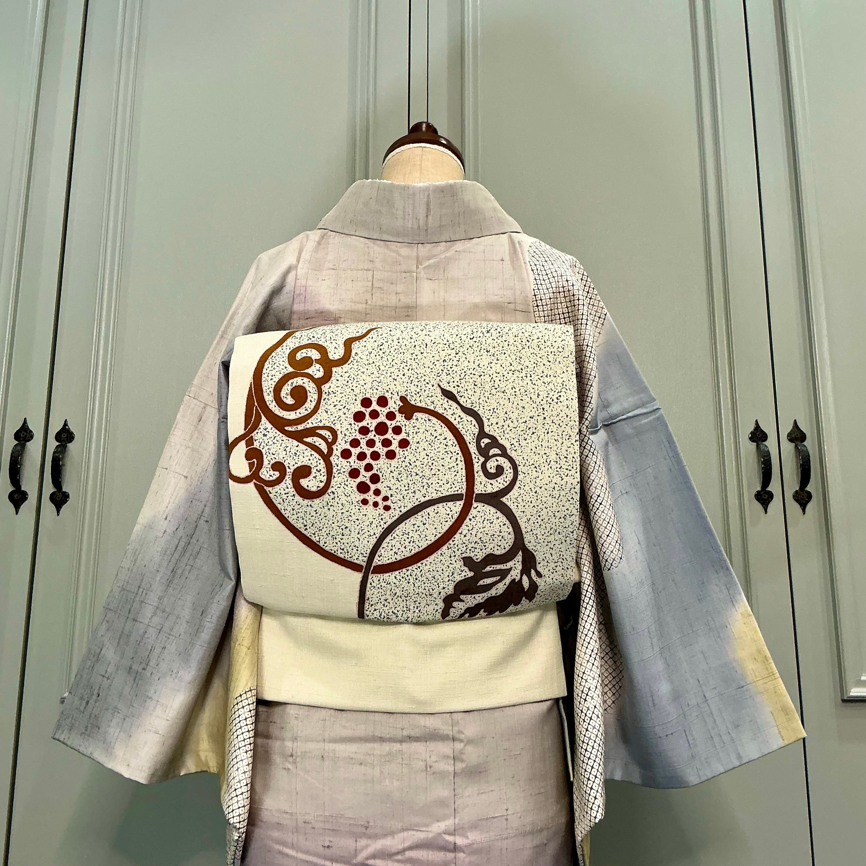 grape autumn*未使用品 ぶどう 葡萄 染め帯 生成 エルクベージュ ブラウン グレー 名古屋帯 B350