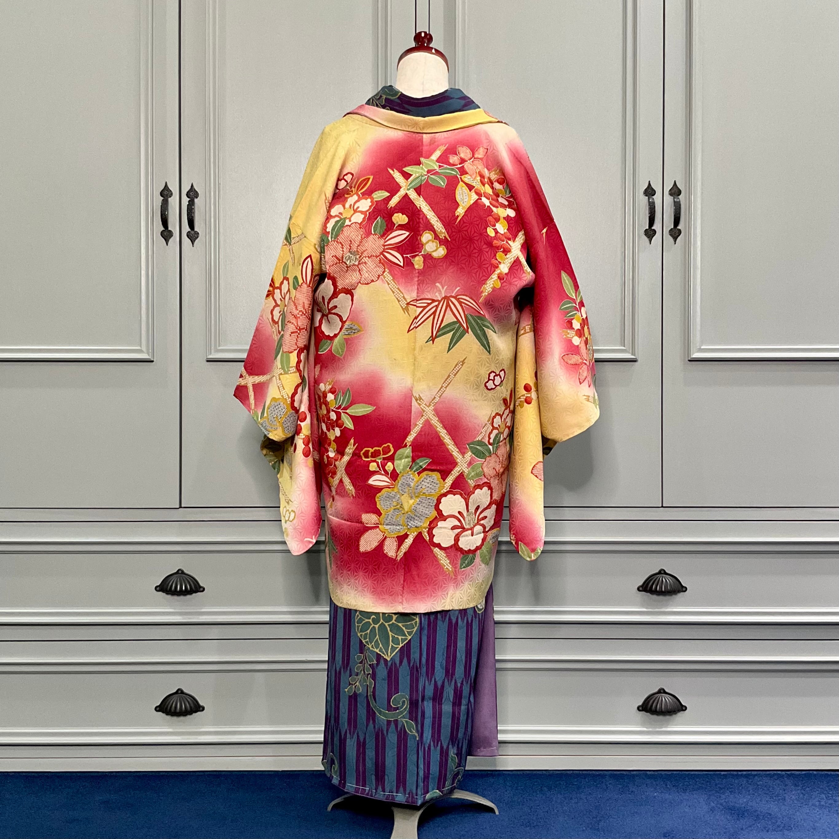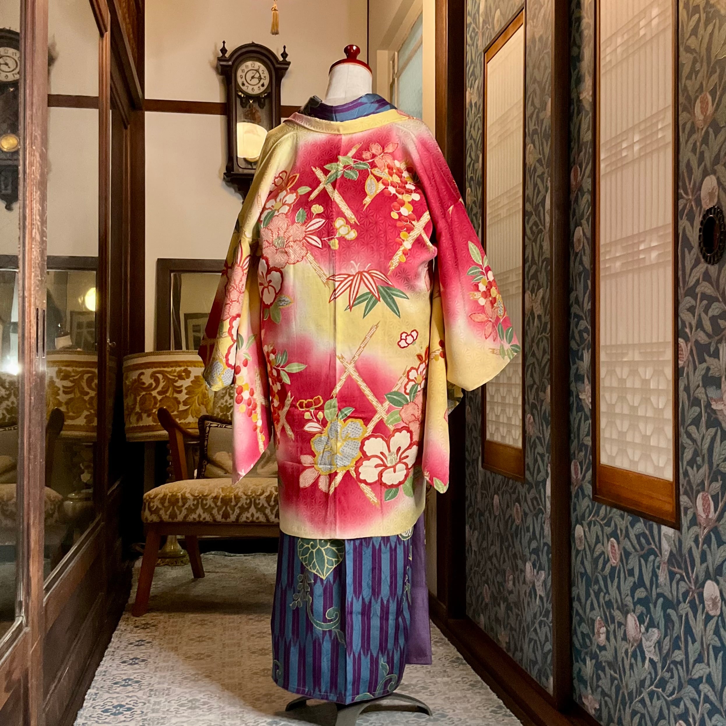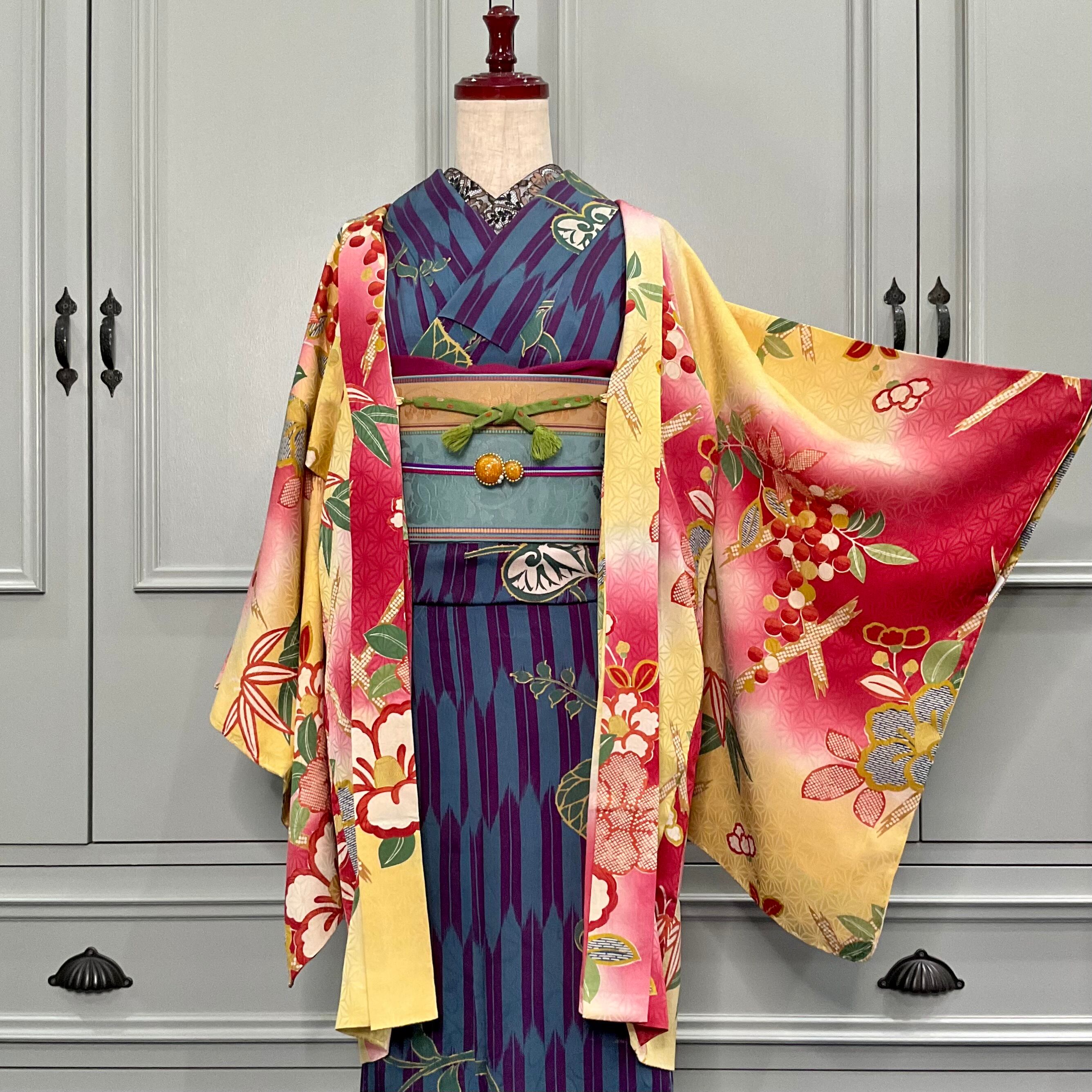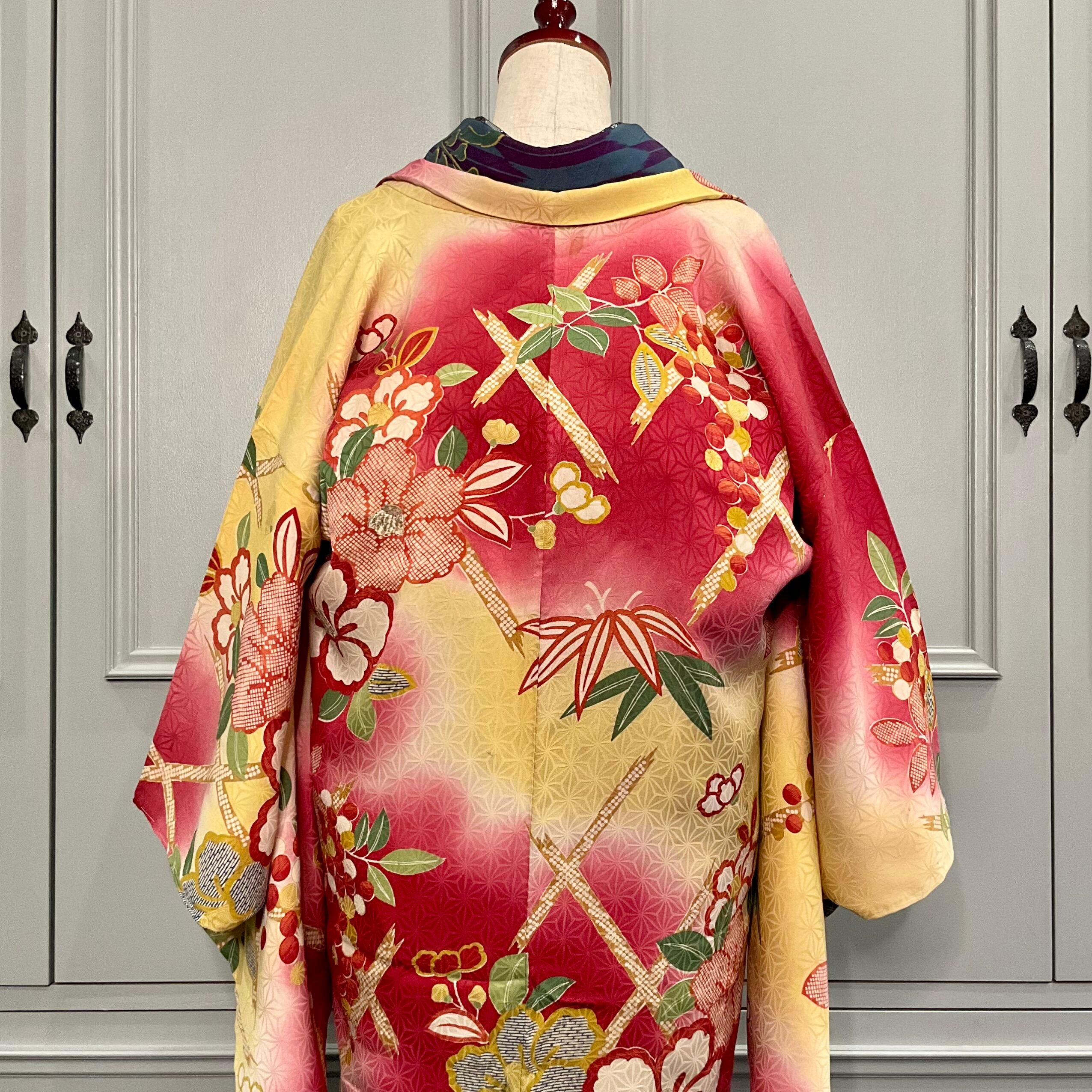 黄色×紅の暈し地に、大きな椿と南天が描かれたアンティーク長羽織です