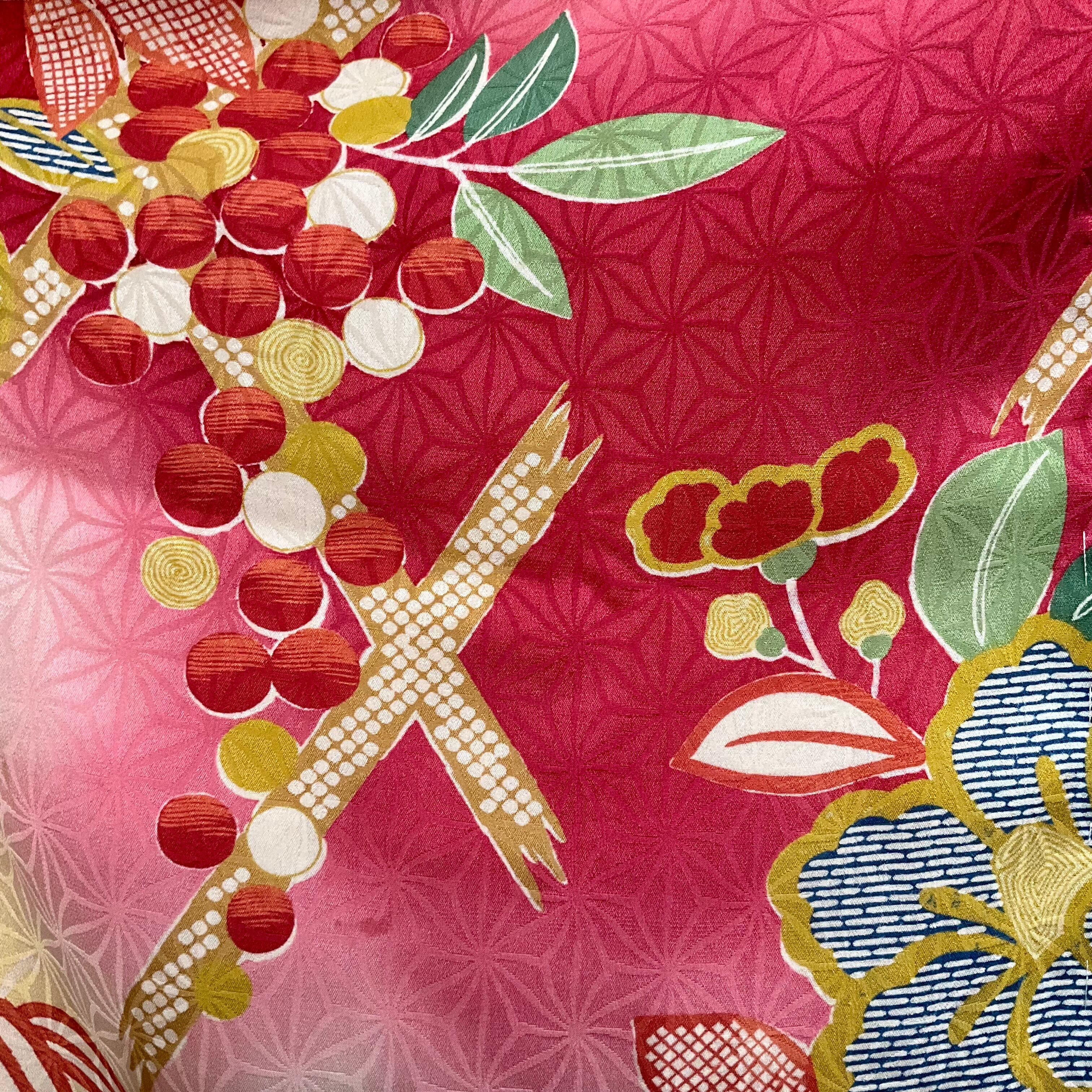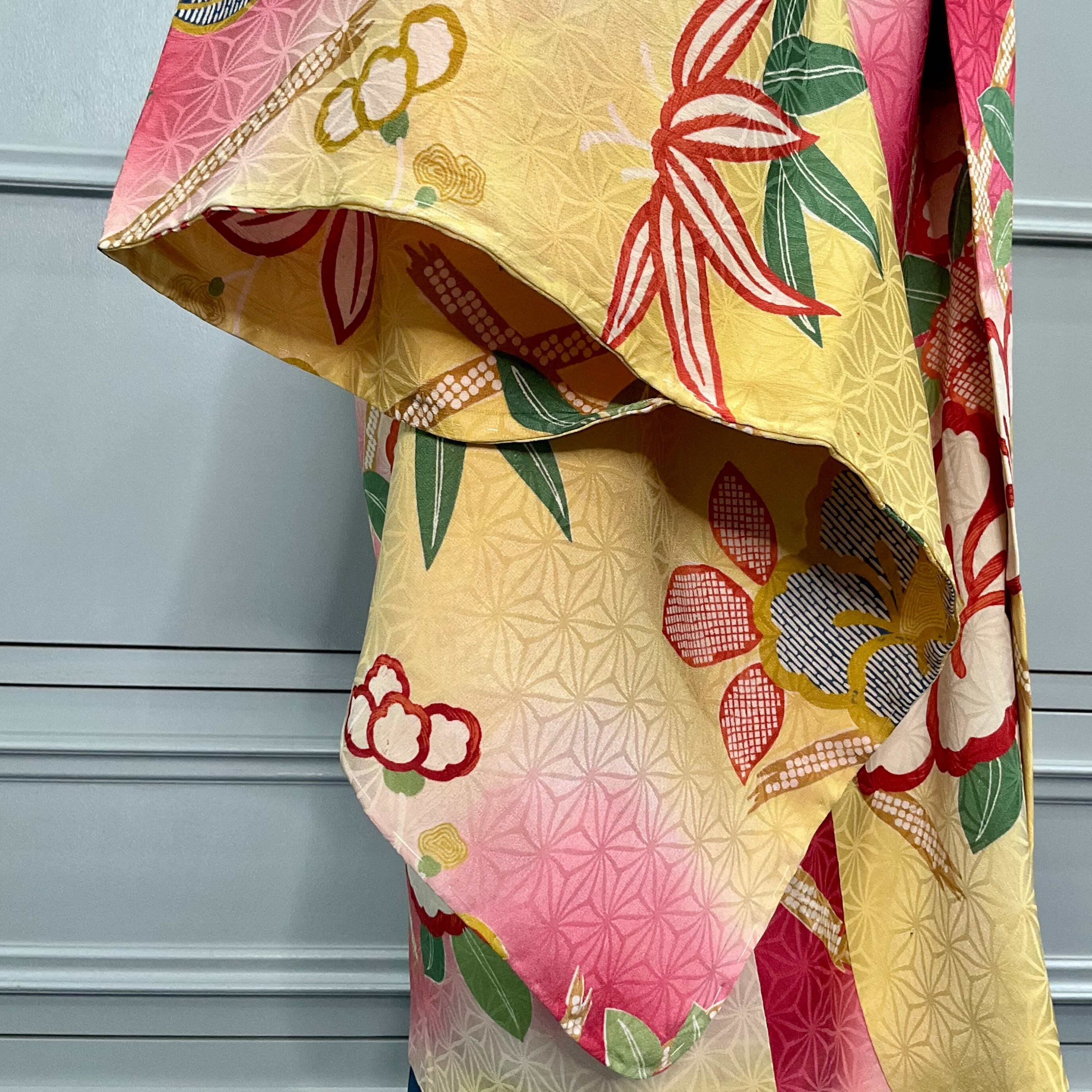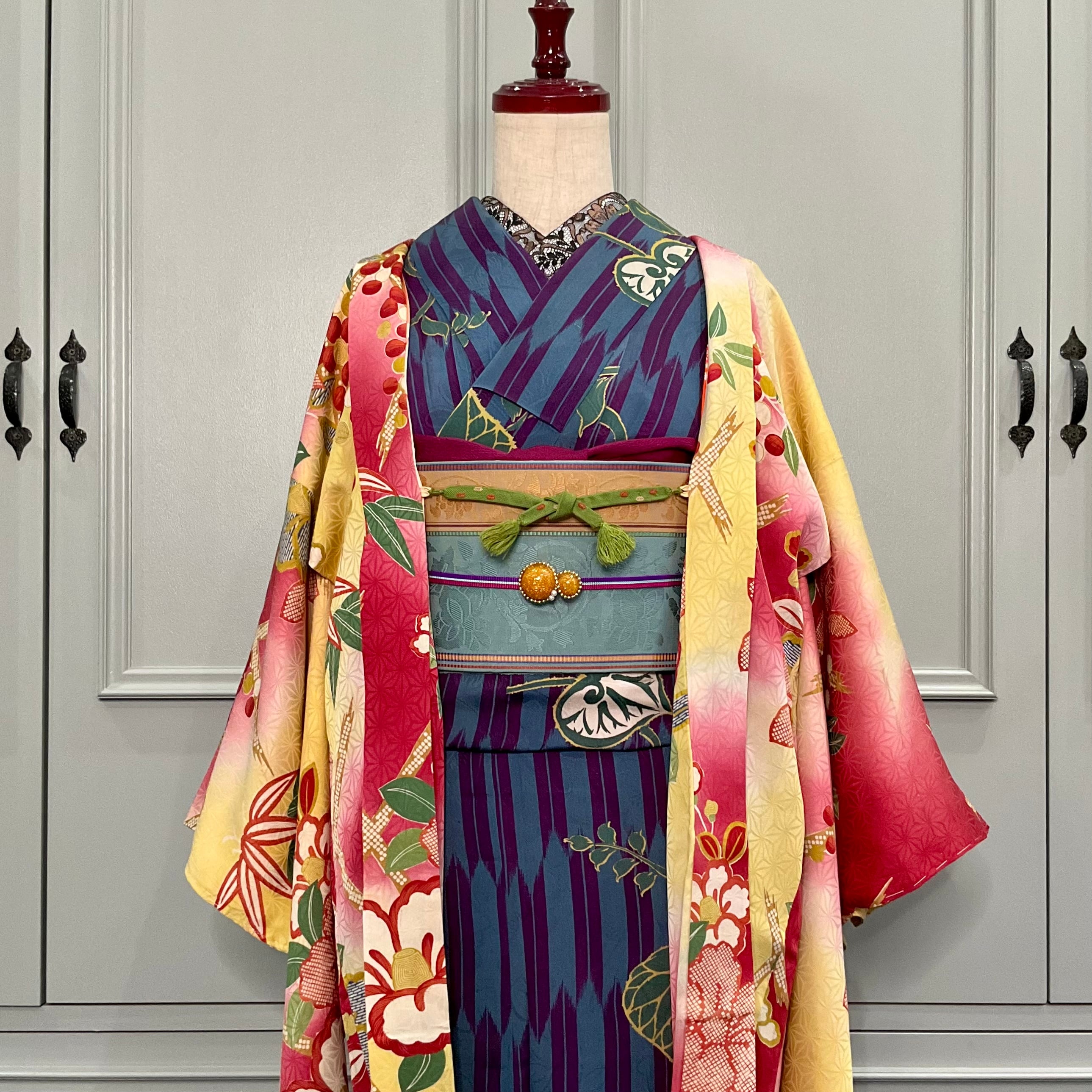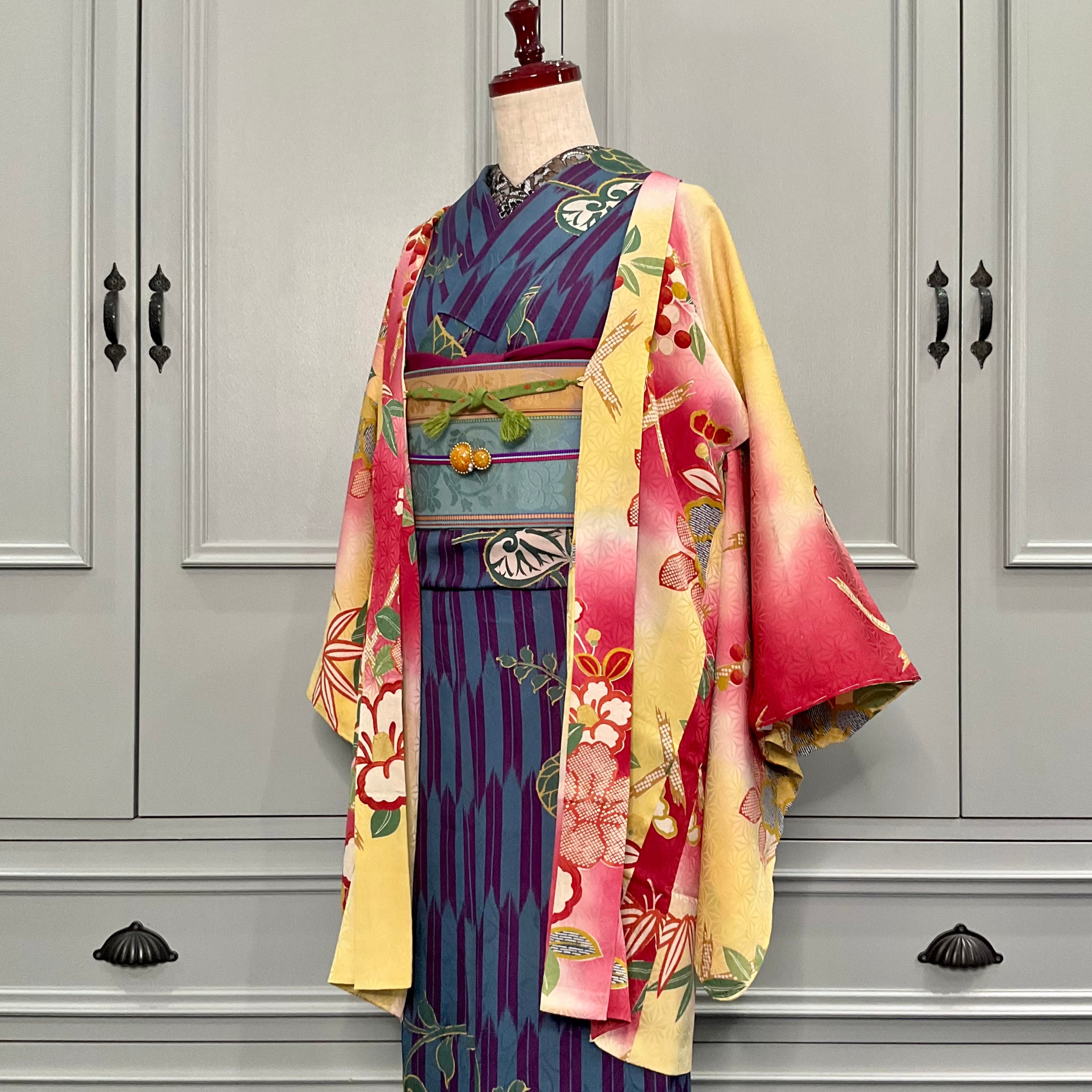 黄色×紅の暈し地に、大きな椿と南天が描かれたアンティーク長羽織です
