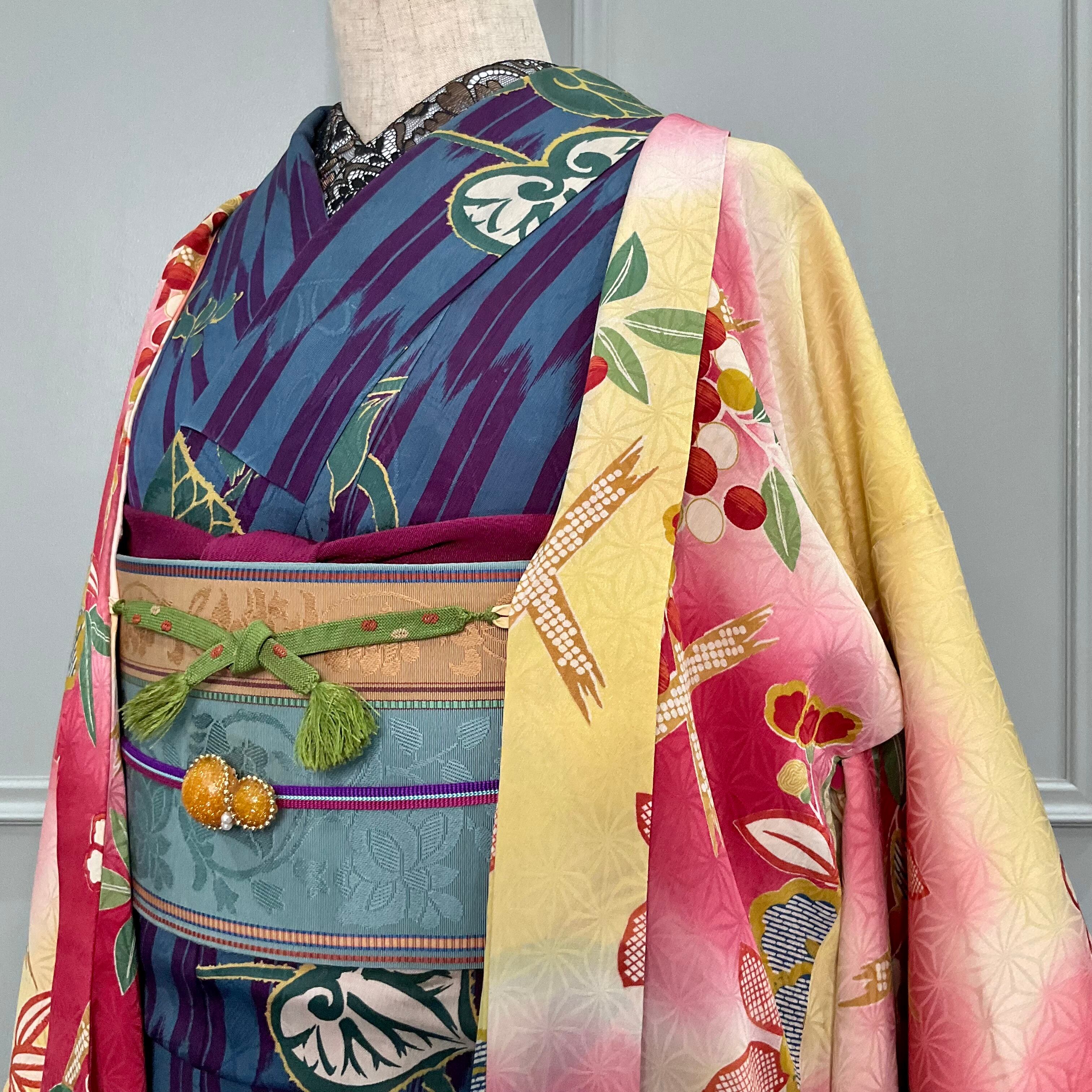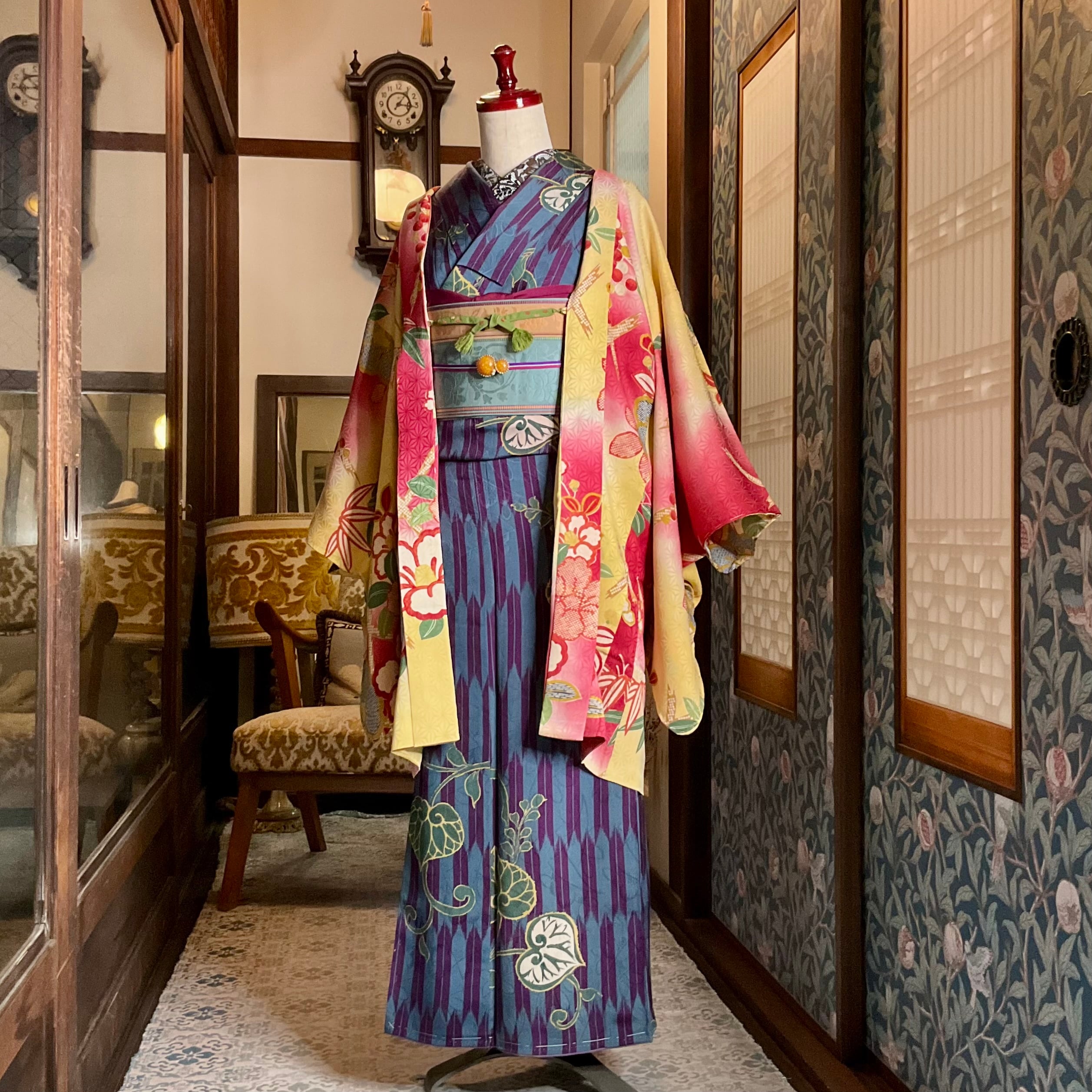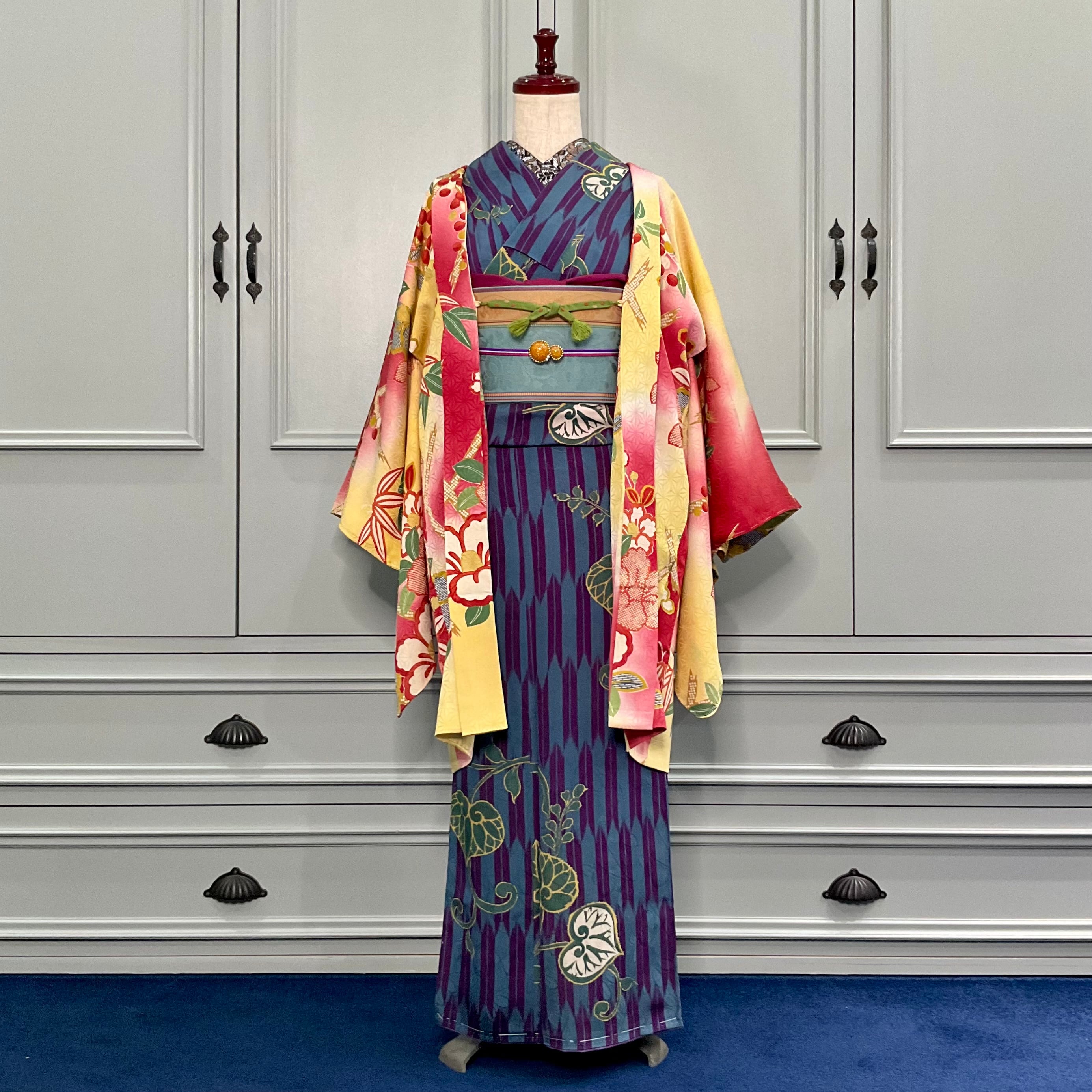 ○合わせたアンティーク小紋着物、アンティーク半幅帯、オリジナル帯揚げプラム、オリジナル三分紐トリプルライン パープルもwebshop掲載品です♪