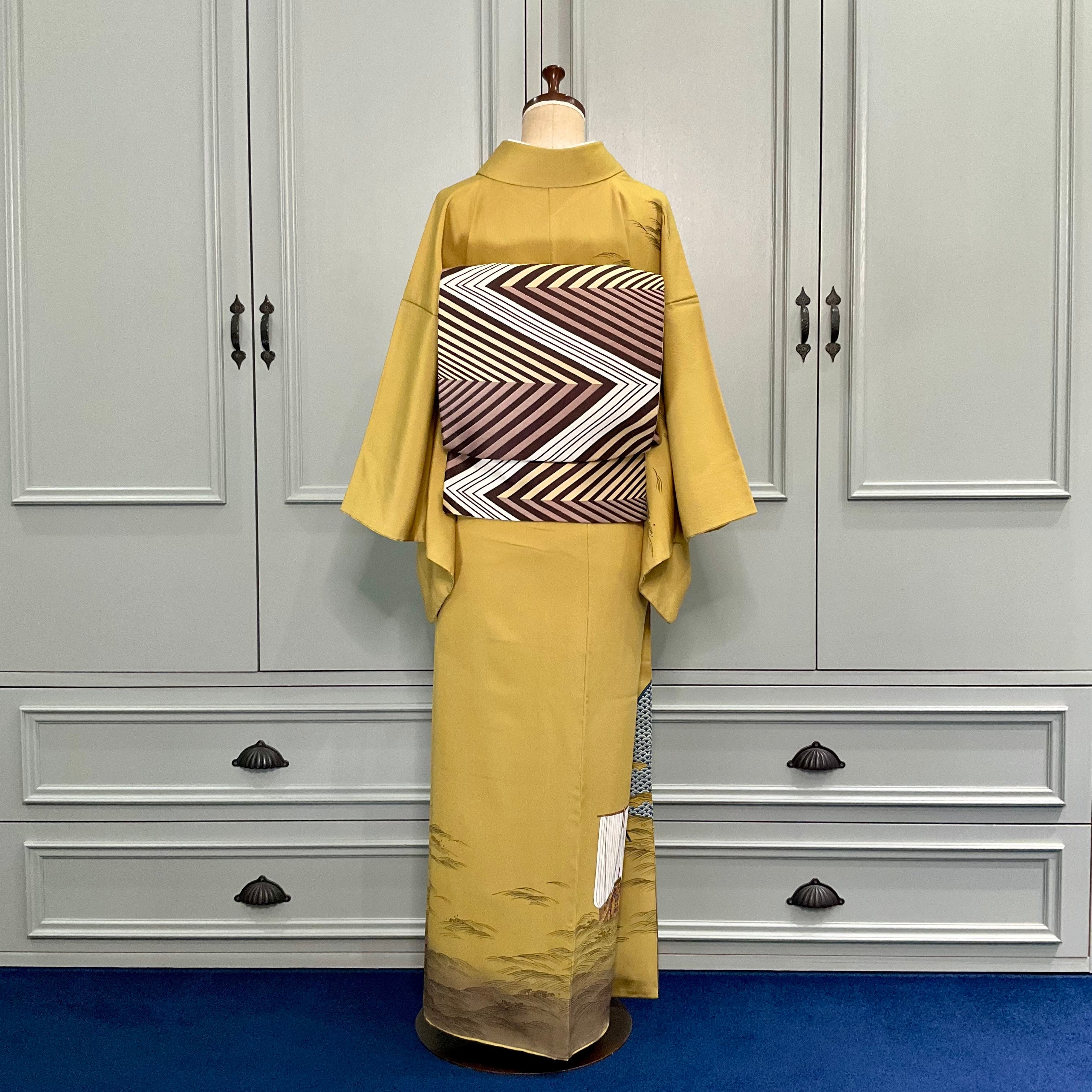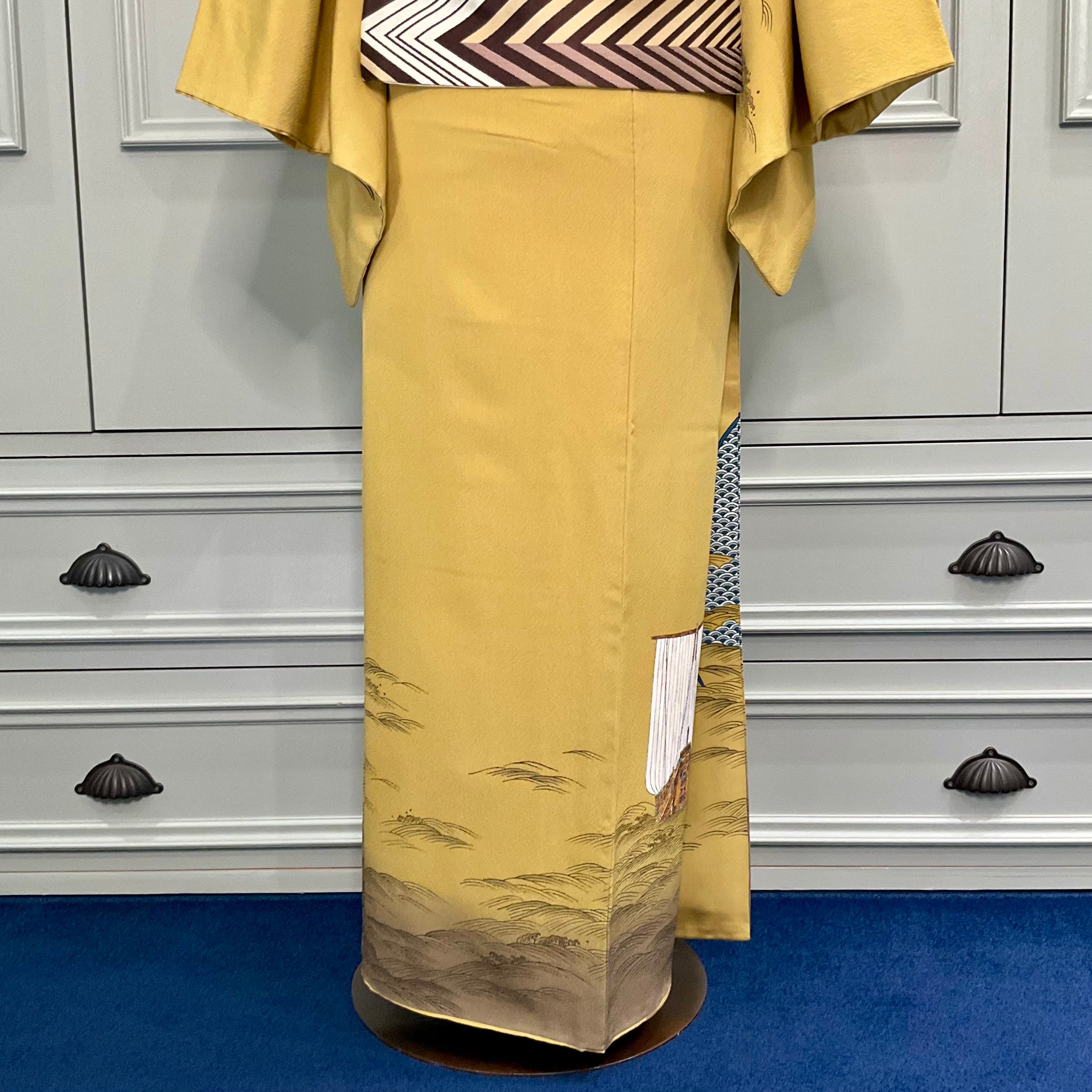 こっくり辛子色の地色に、静かな海と風を感じる船のモチーフがステキなカジュアル付下げ着物です