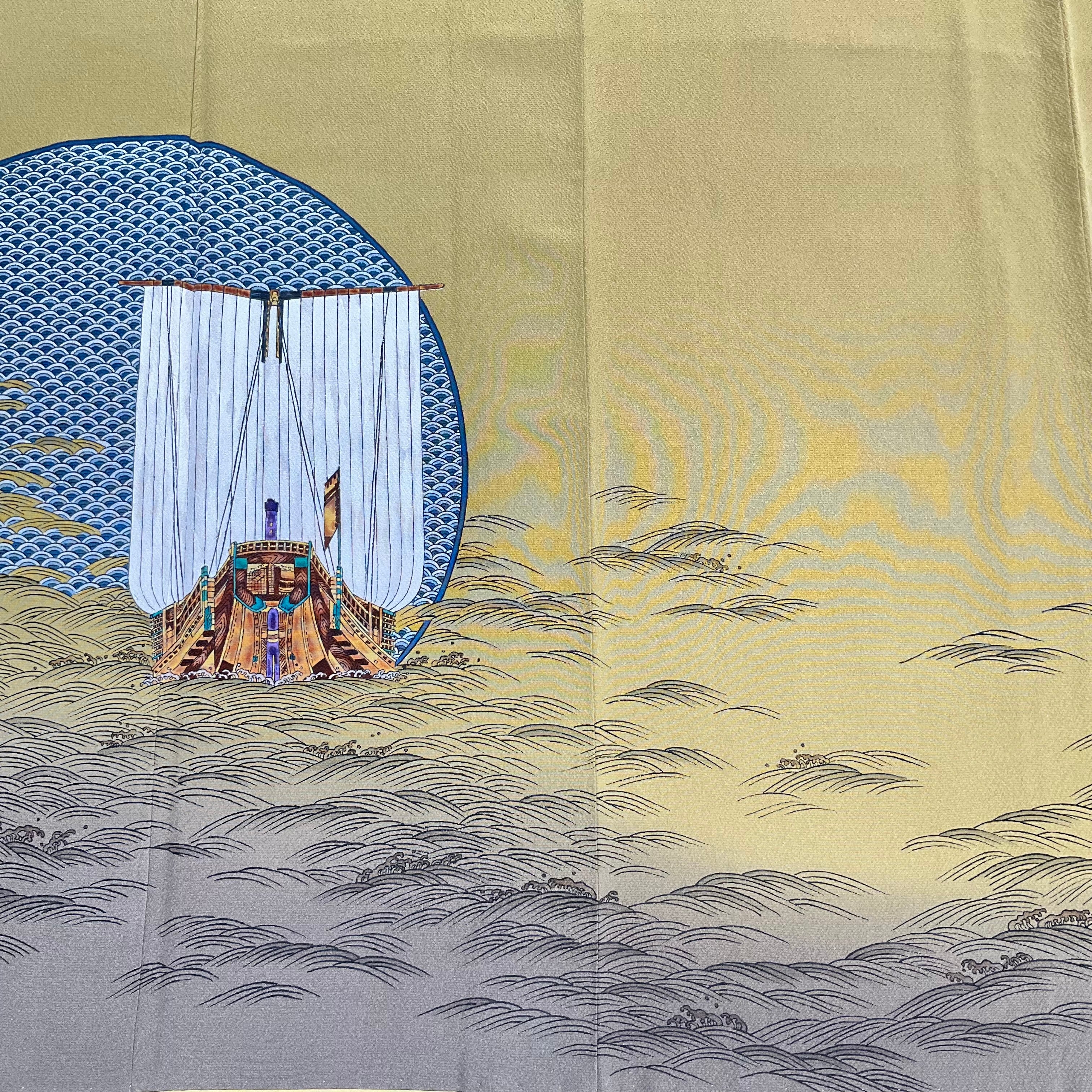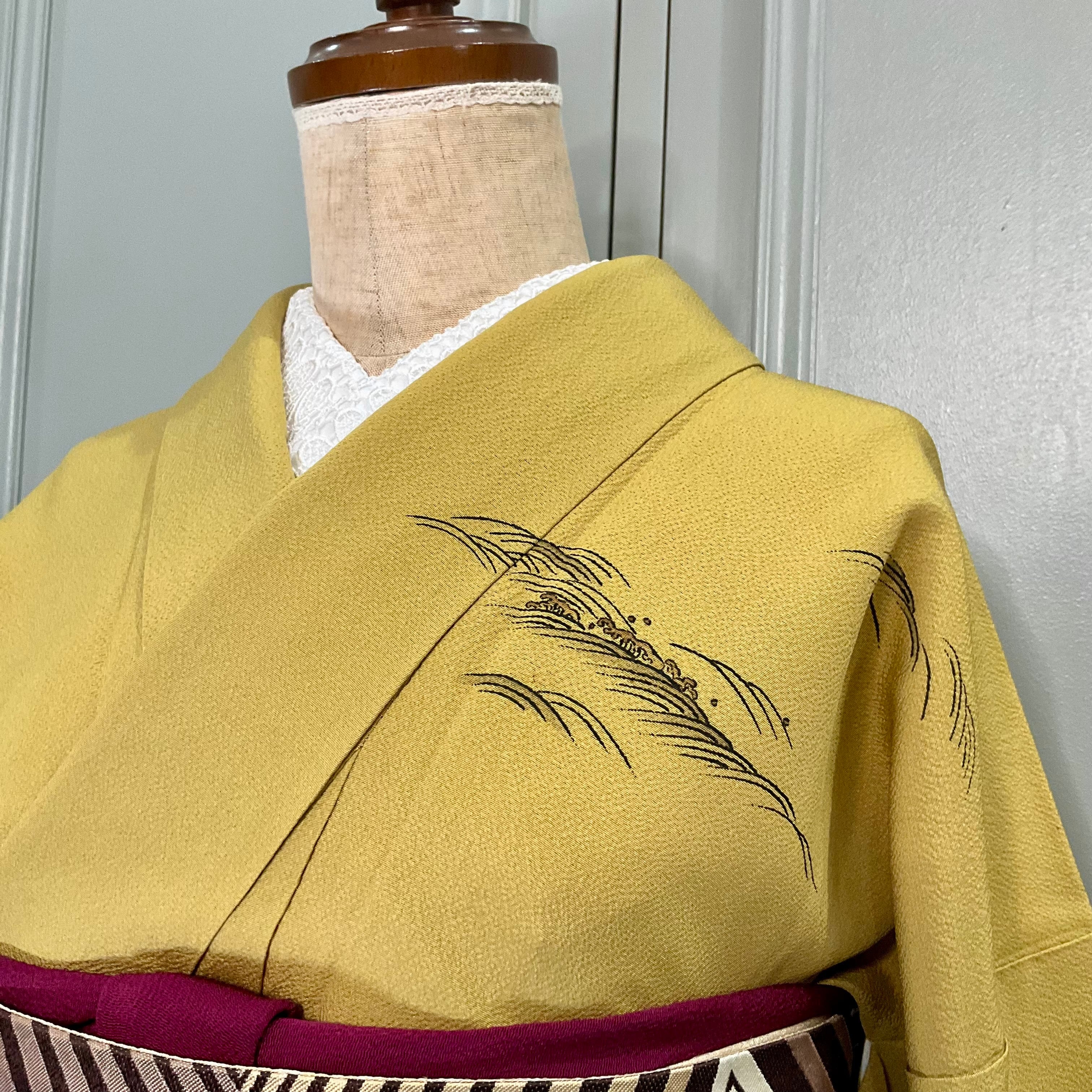 long*Silent Voyage*船 舟 帆船 縮緬 辛子 マスタード カジュアル付下げ着物 B352