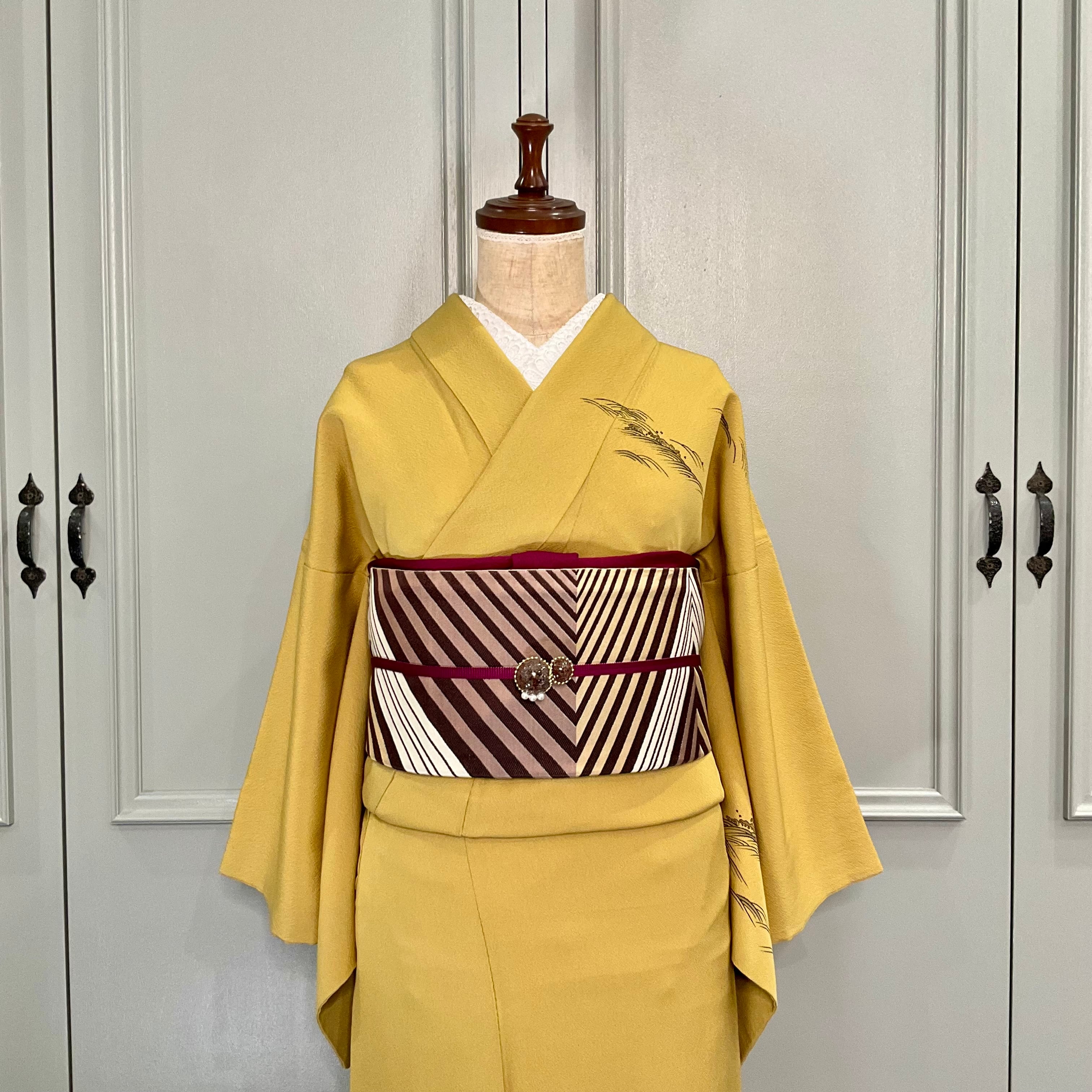 地色の大人っぽさと、かしこまりすぎない柄付けなので、名古屋帯を合わせてキレイ目カジュアルに、袋帯を合わせてセミフォーマル寄りな装いと幅広いシーンにてお使いいただけます
