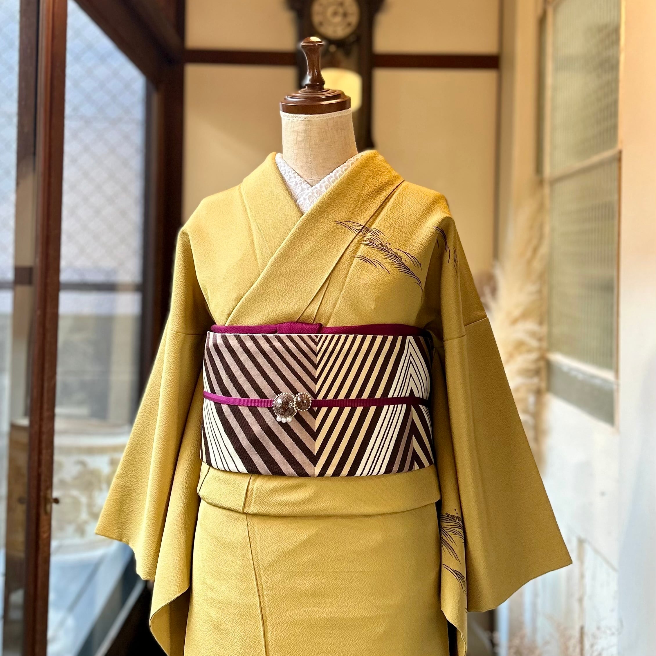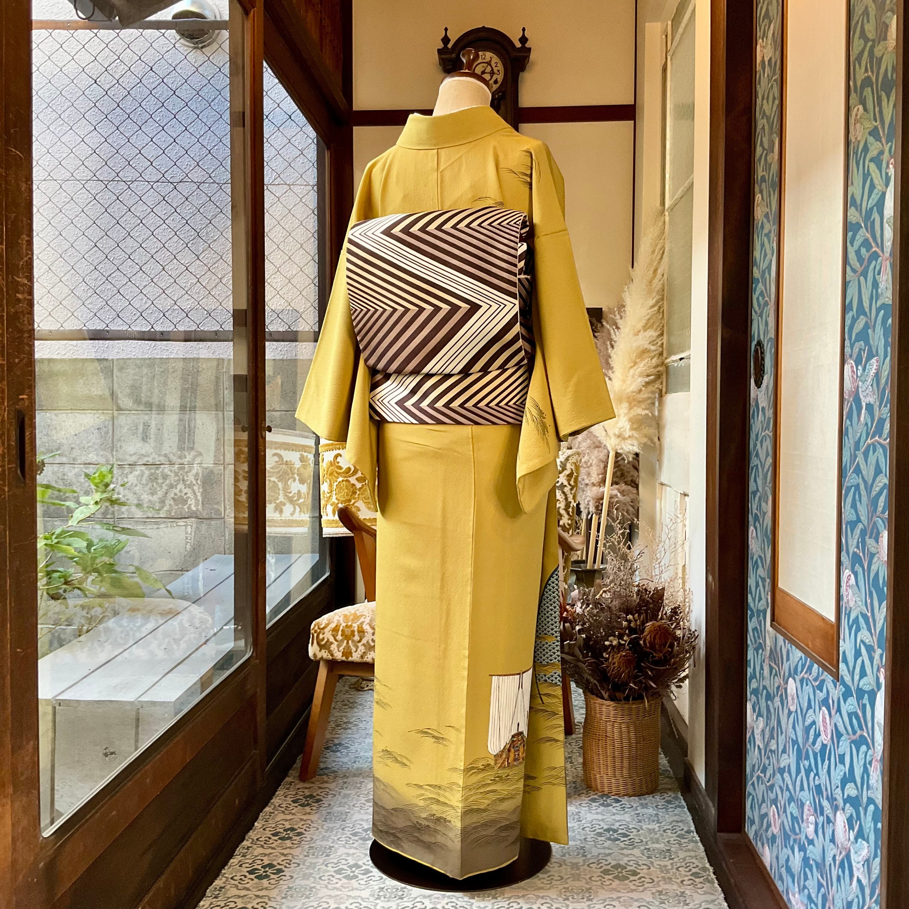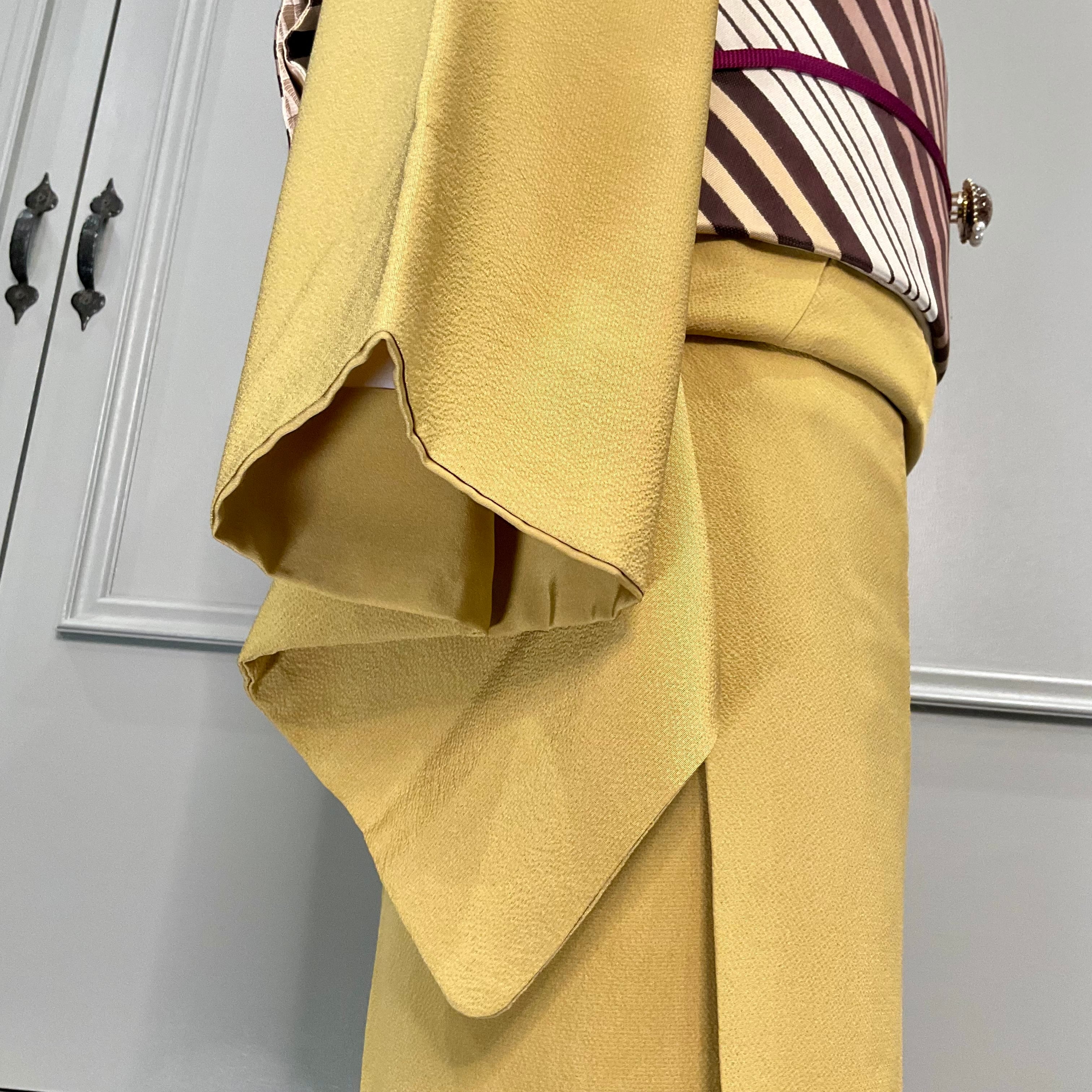 やわらかな辛子色の彩りが大人の雰囲気を醸し出すこちらの付け下げ