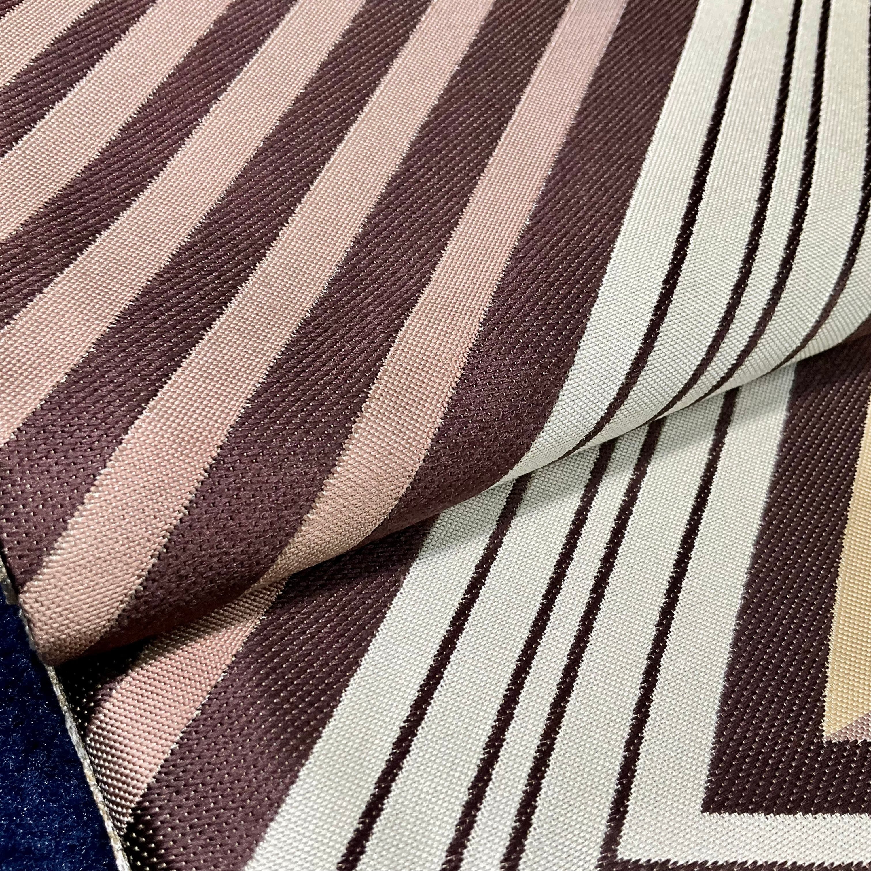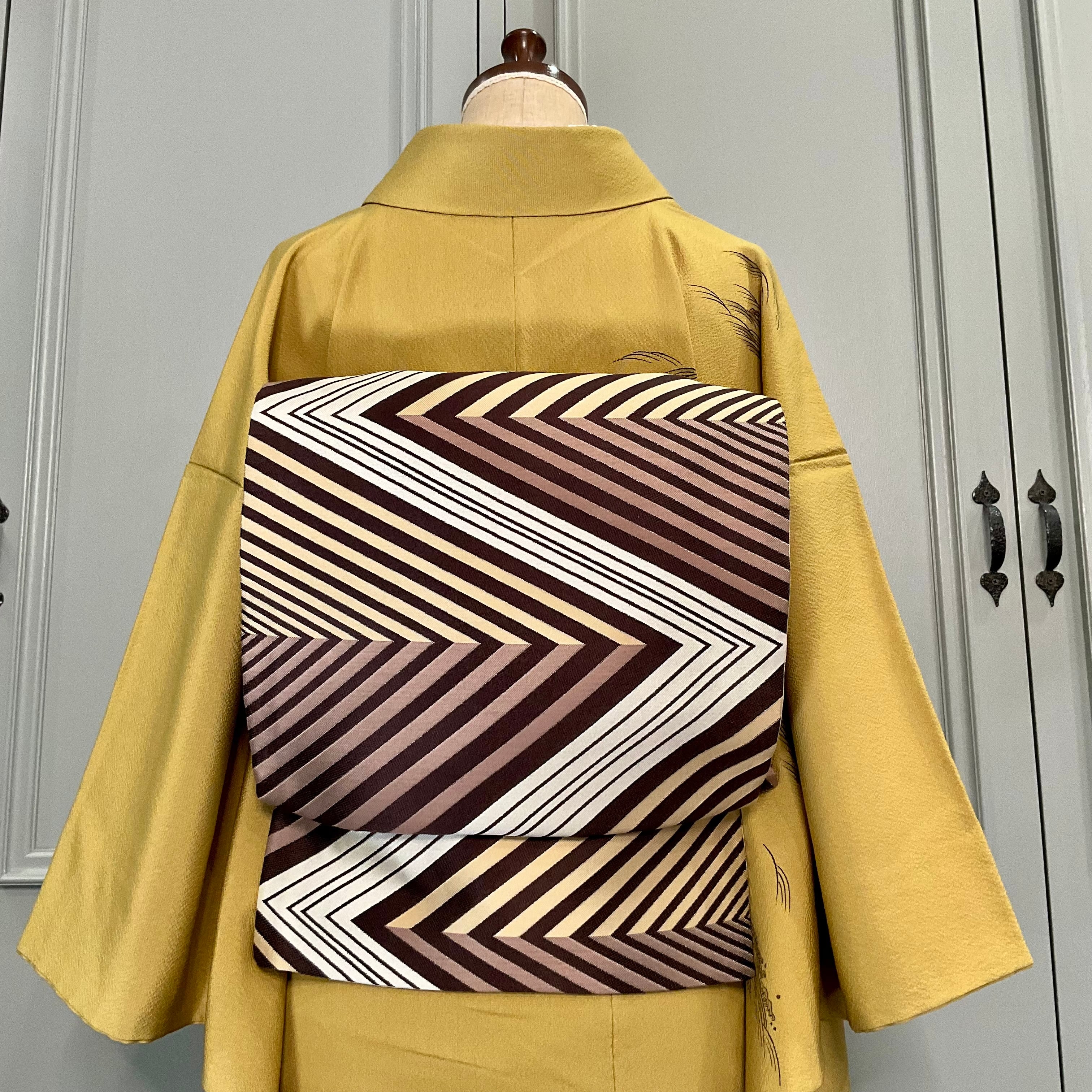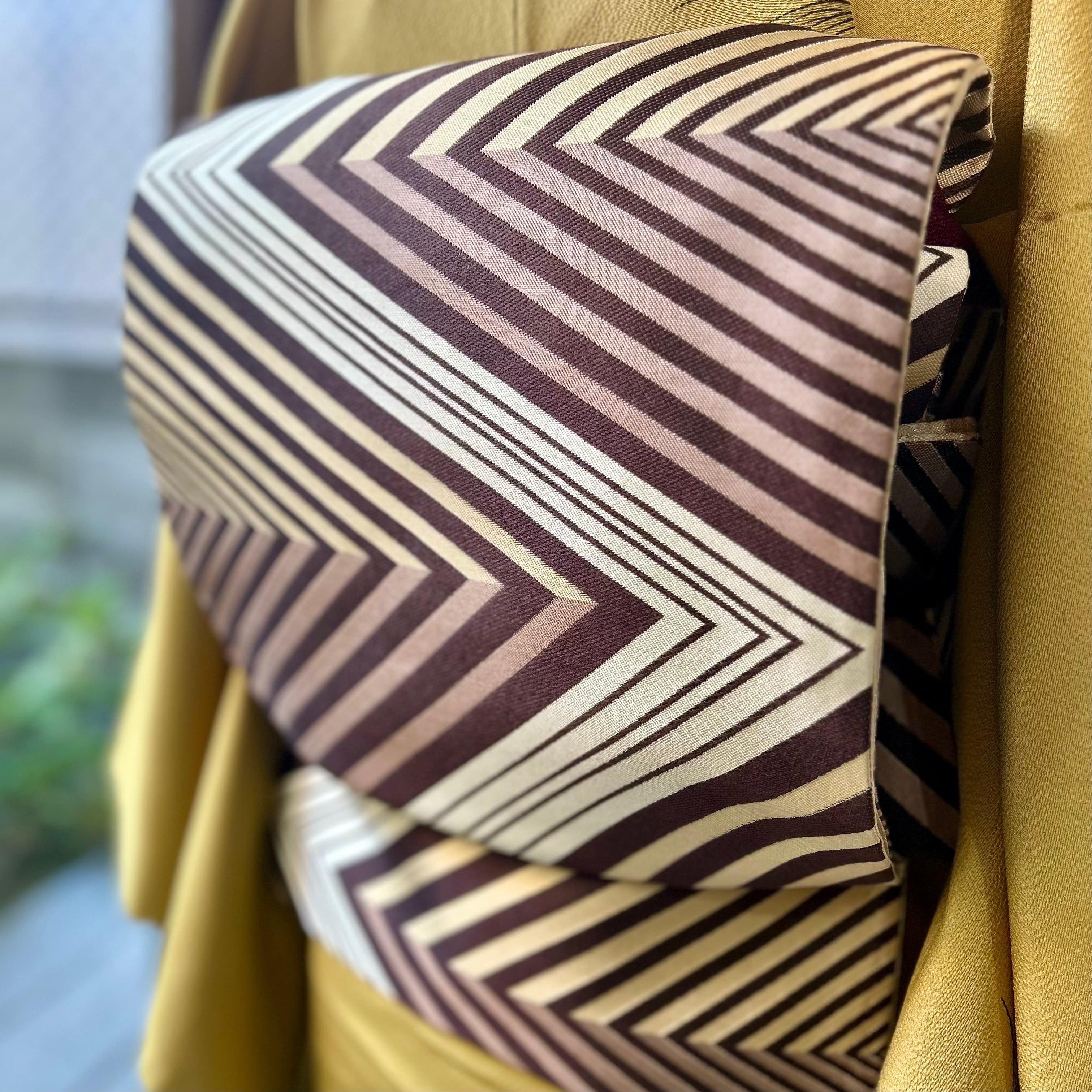 ブラウン系の地色で描かれたシャープな斜線の連続が矢羽のようにスタイリッシュな洒落袋帯です