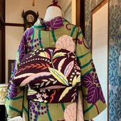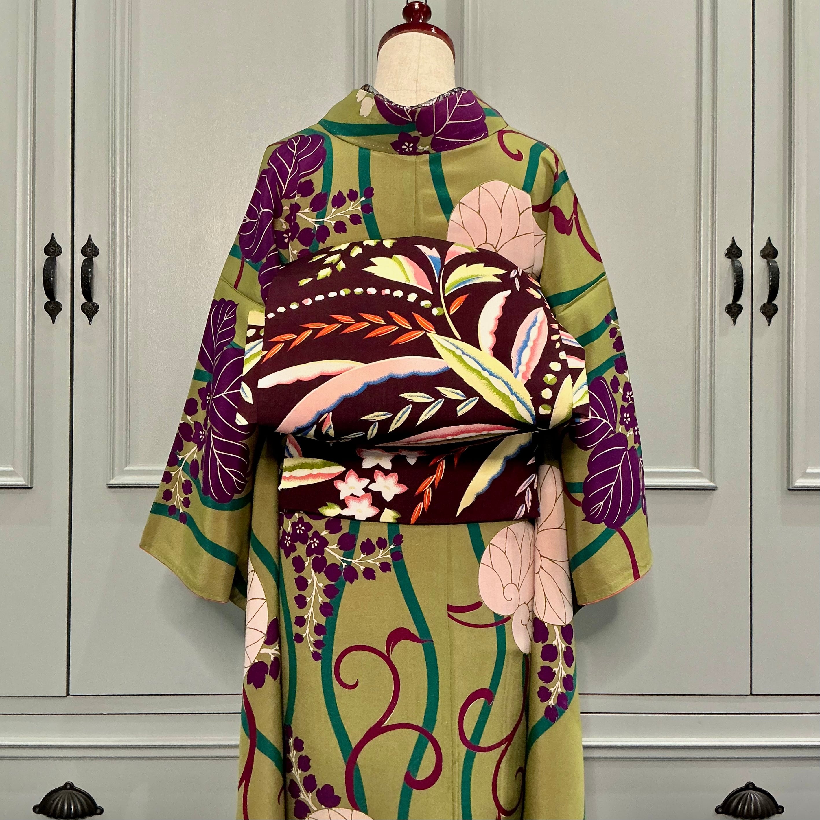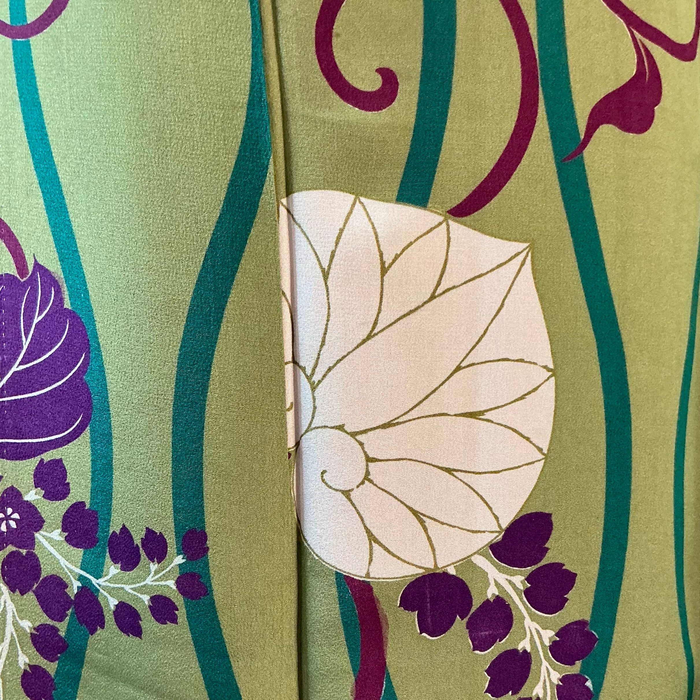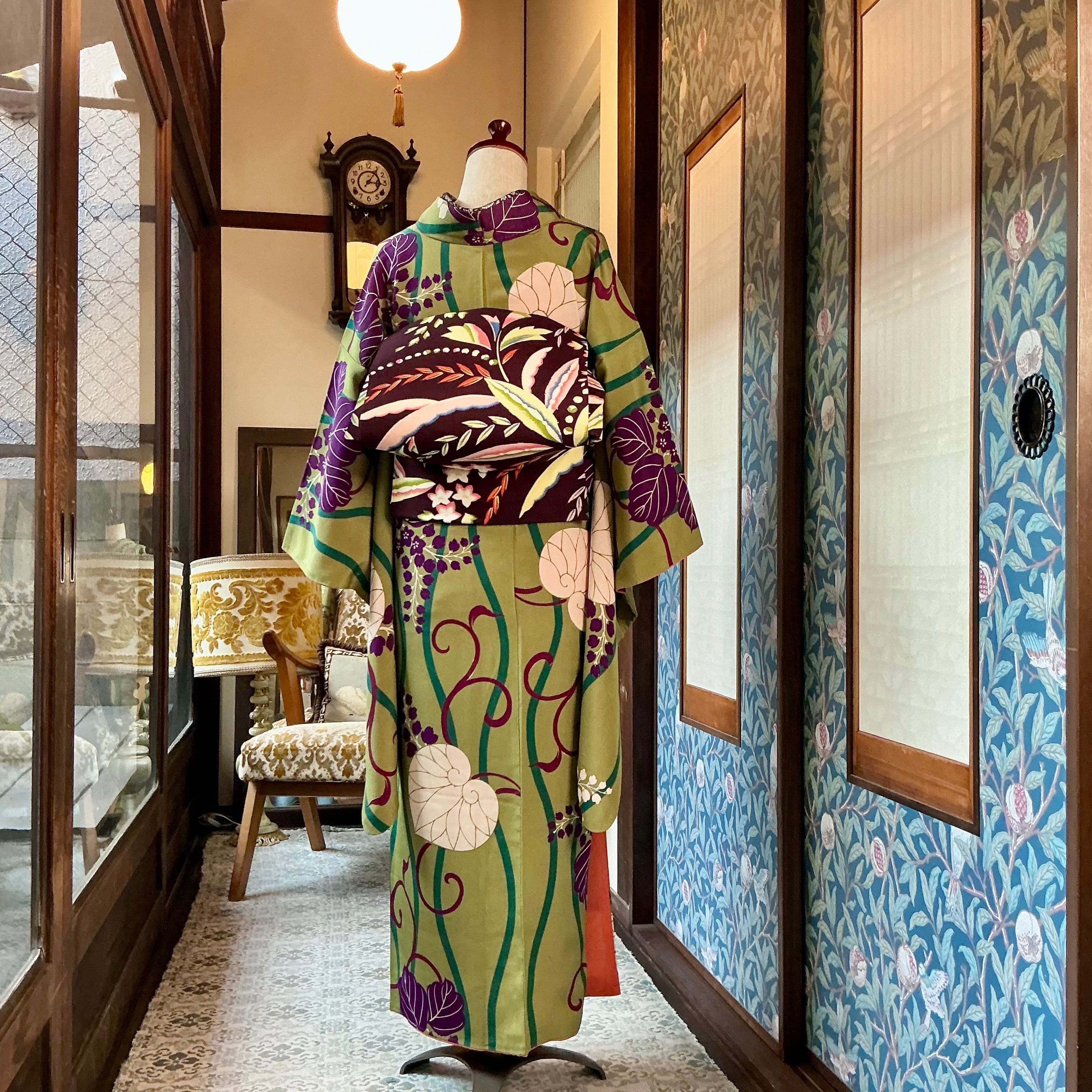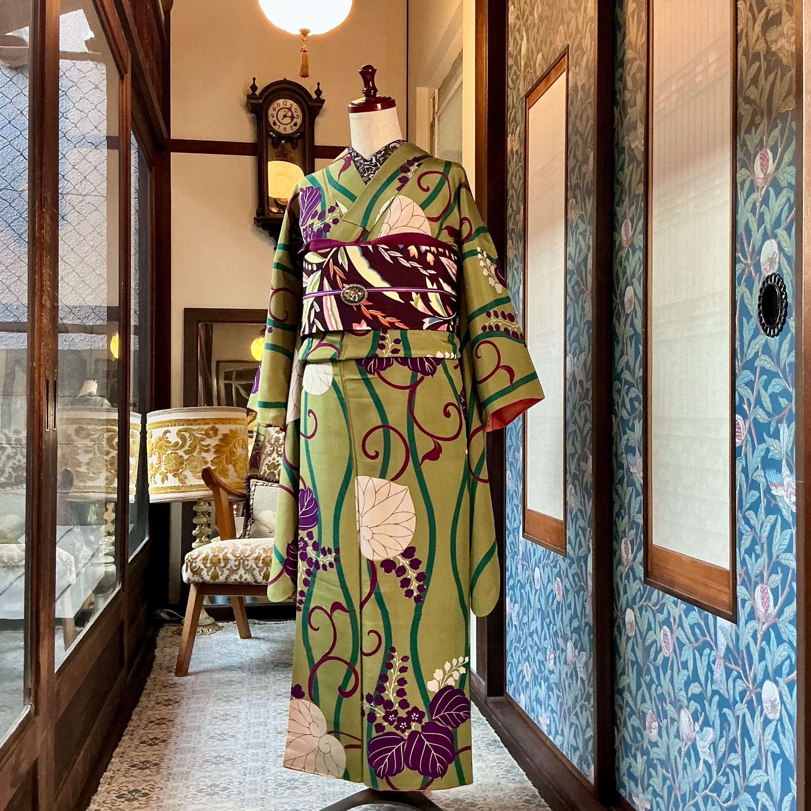珍しい抹茶系のグリーン地に、白い葵の葉と、落ち着いた紫の桐の葉がひときわ映えます✨️