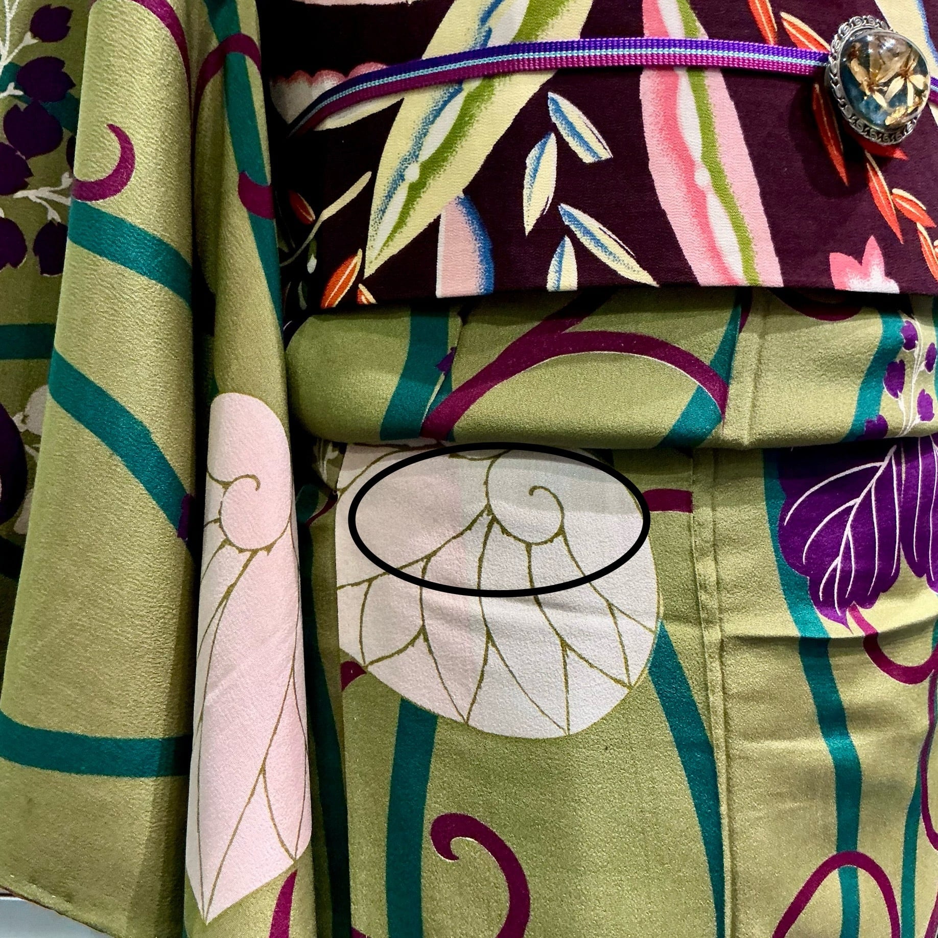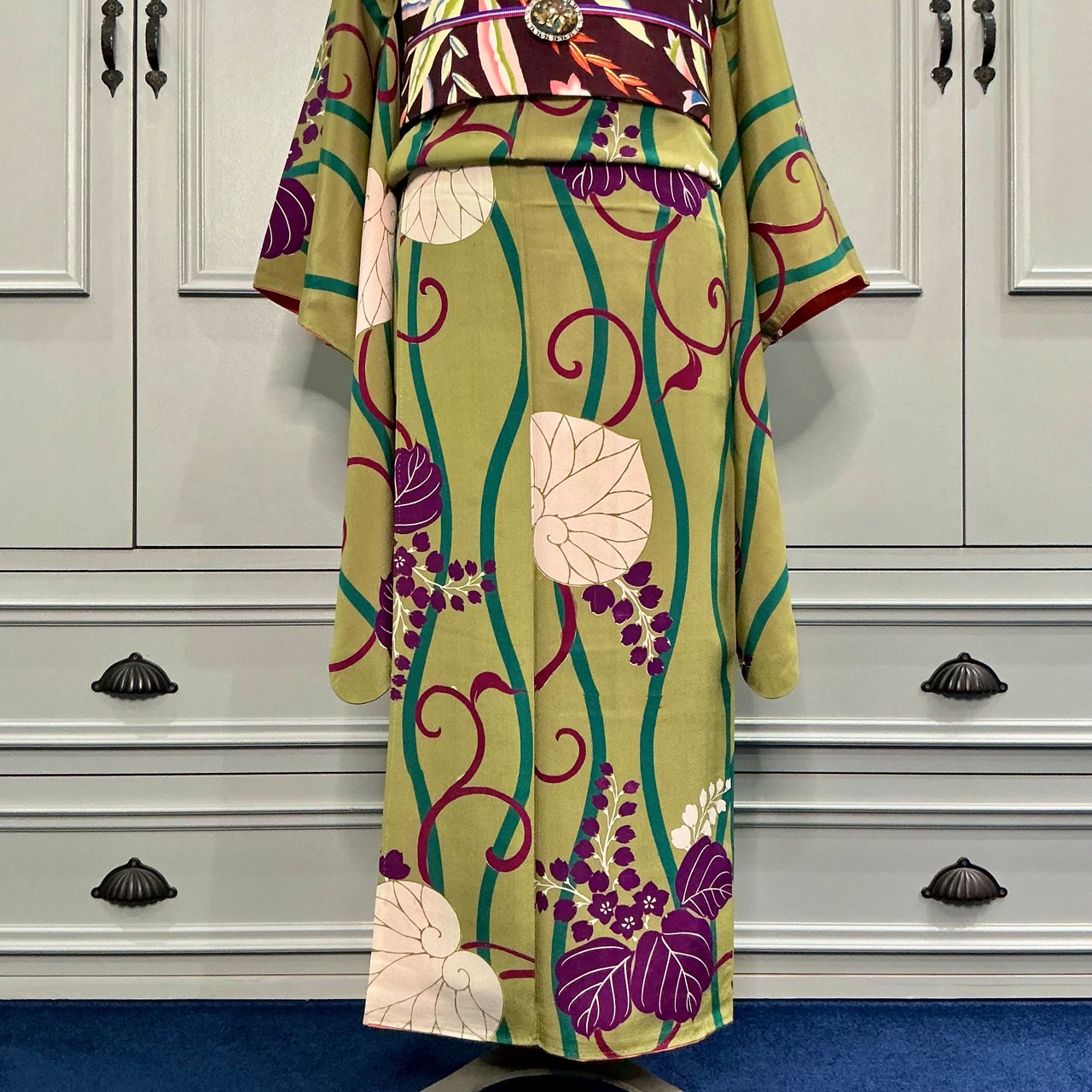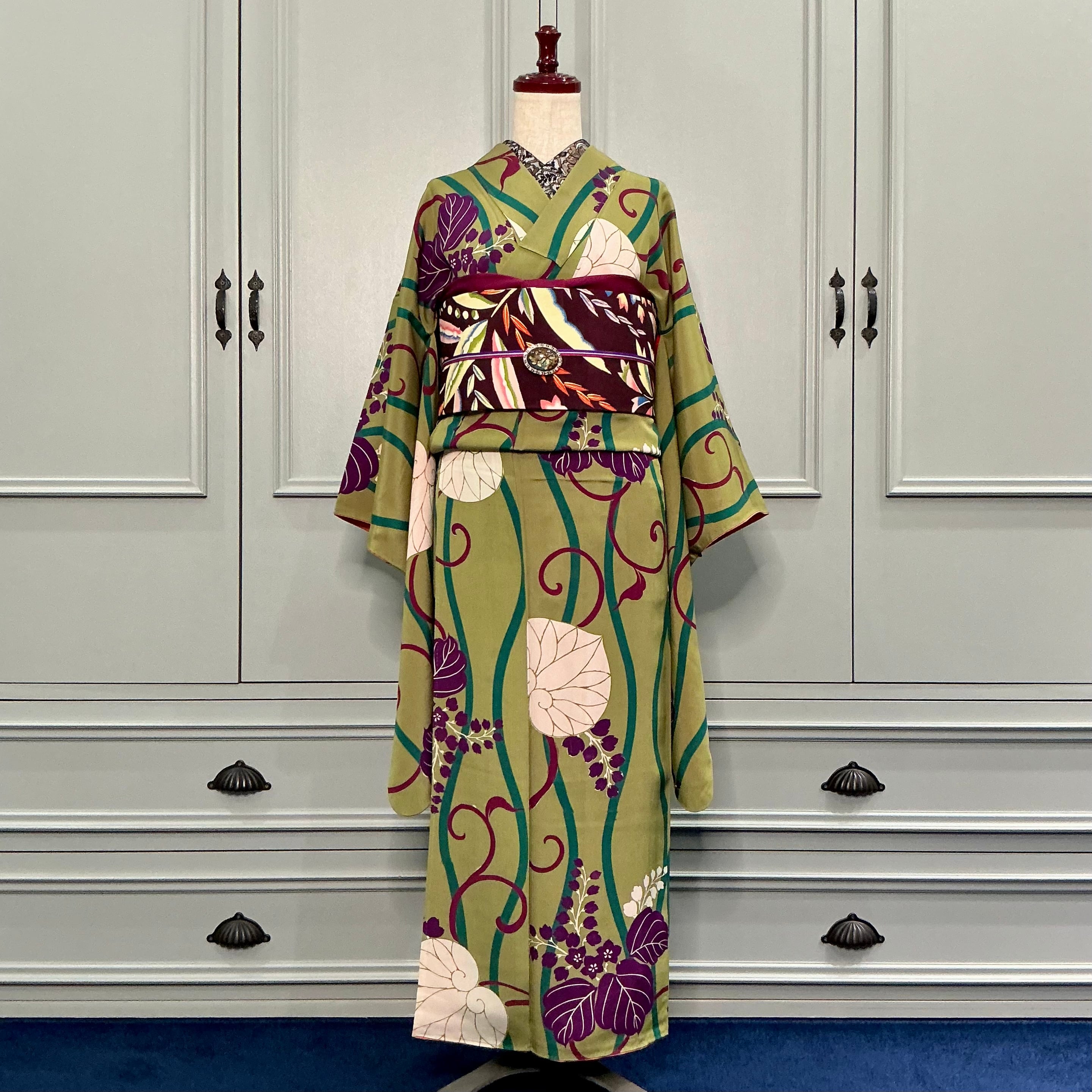 Modern green*葵 桐 立涌 唐草 抹茶色 オリーブグリーン 緑 紫 錦紗縮緬 袴 卒業式 アンティーク小紋着物 B366