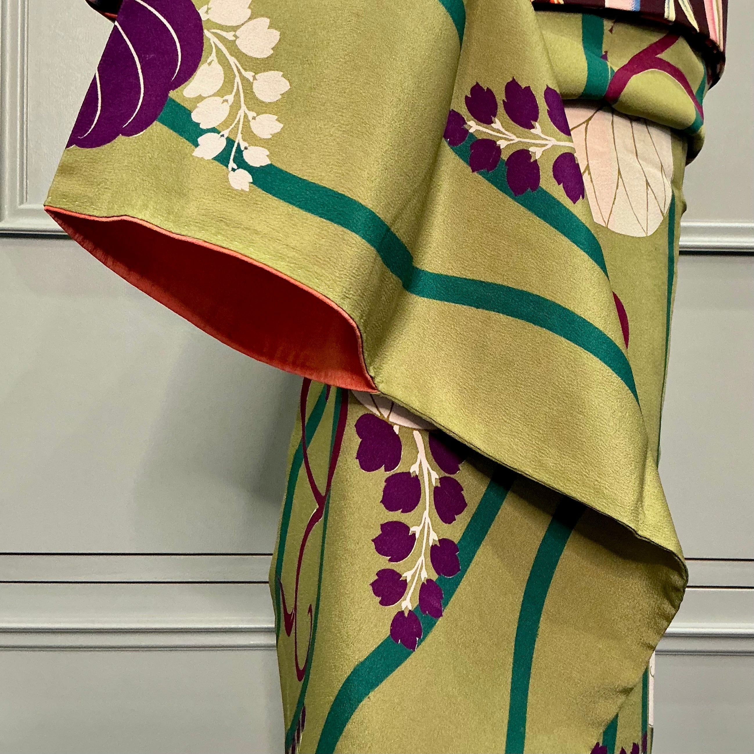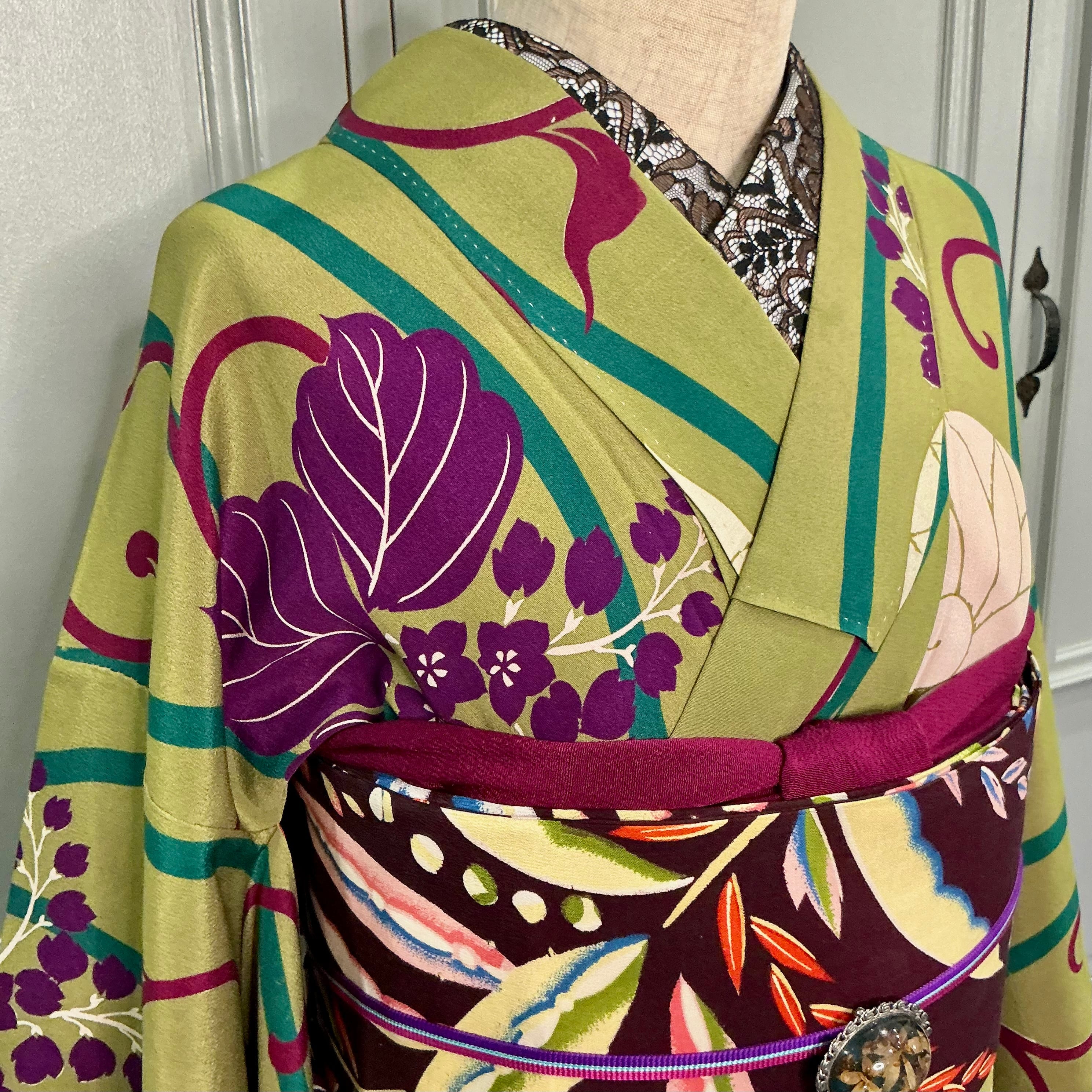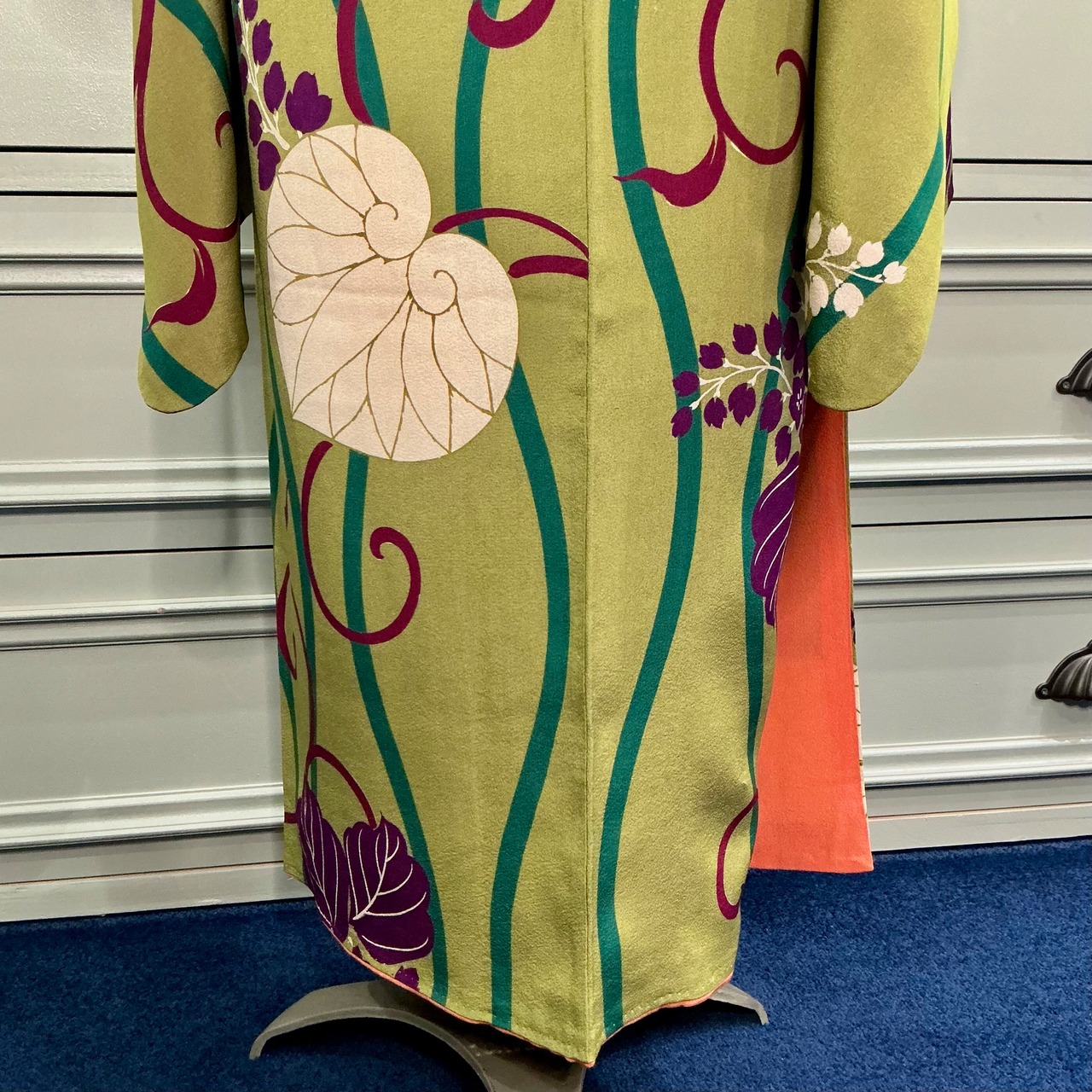Modern green*葵 桐 立涌 唐草 抹茶色 オリーブグリーン 緑 紫 錦紗縮緬 袴 卒業式 アンティーク小紋着物 B366