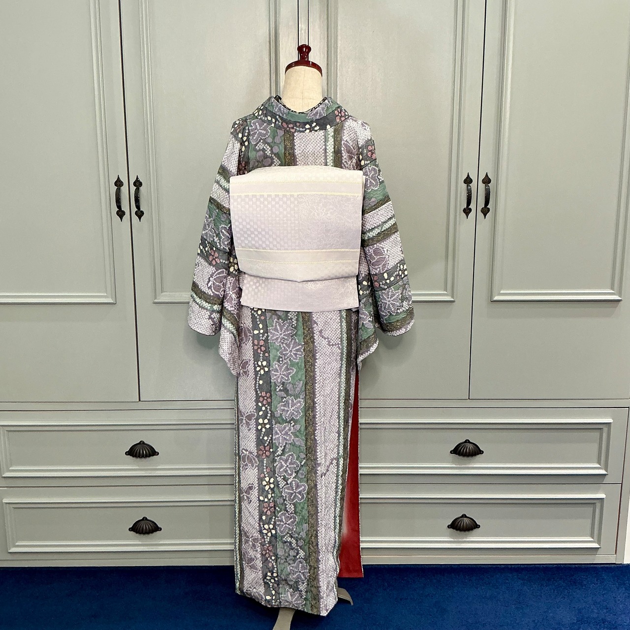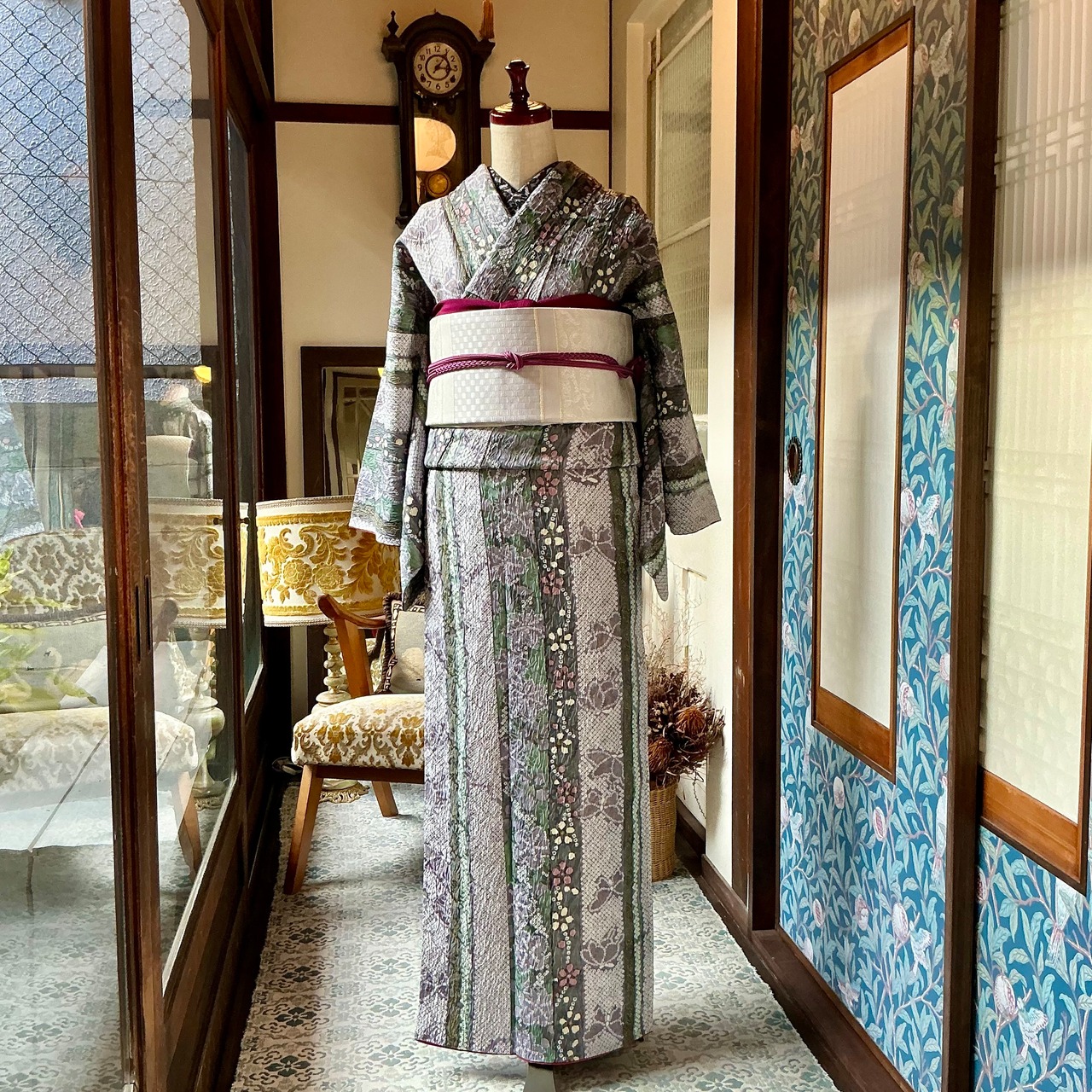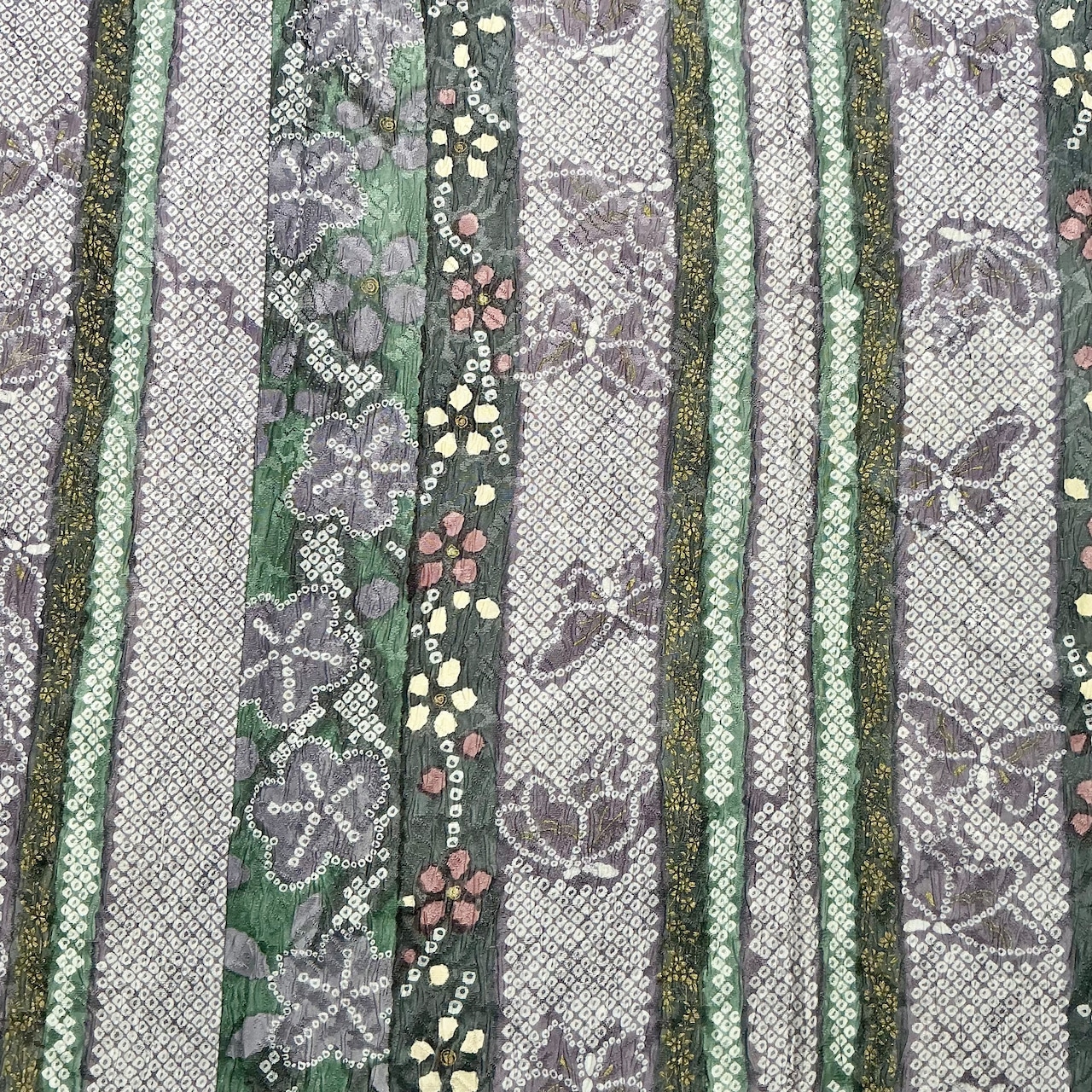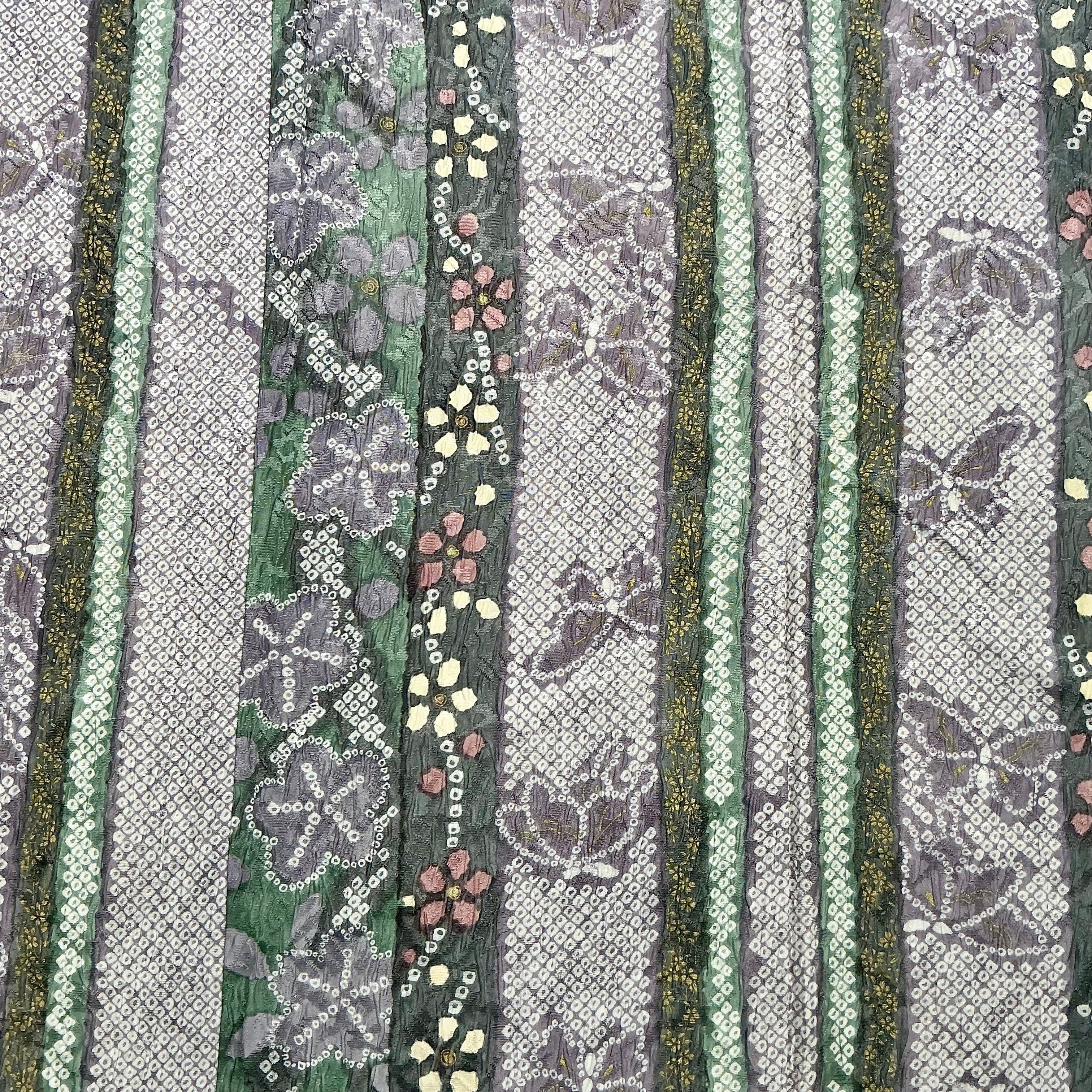 藤鼠×緑の地色に縦ラインに蝶や花、鹿の子模様が素敵な小紋着物です