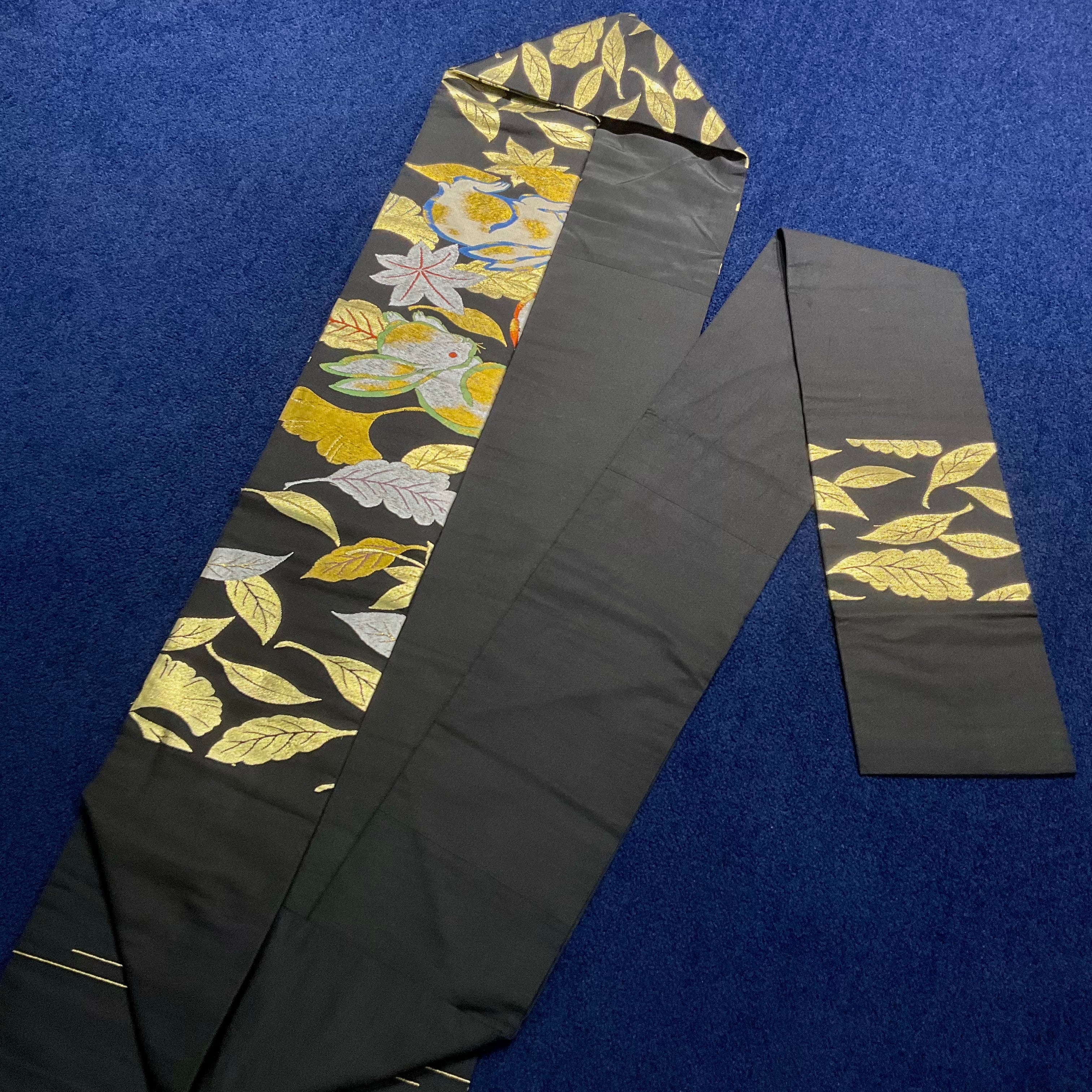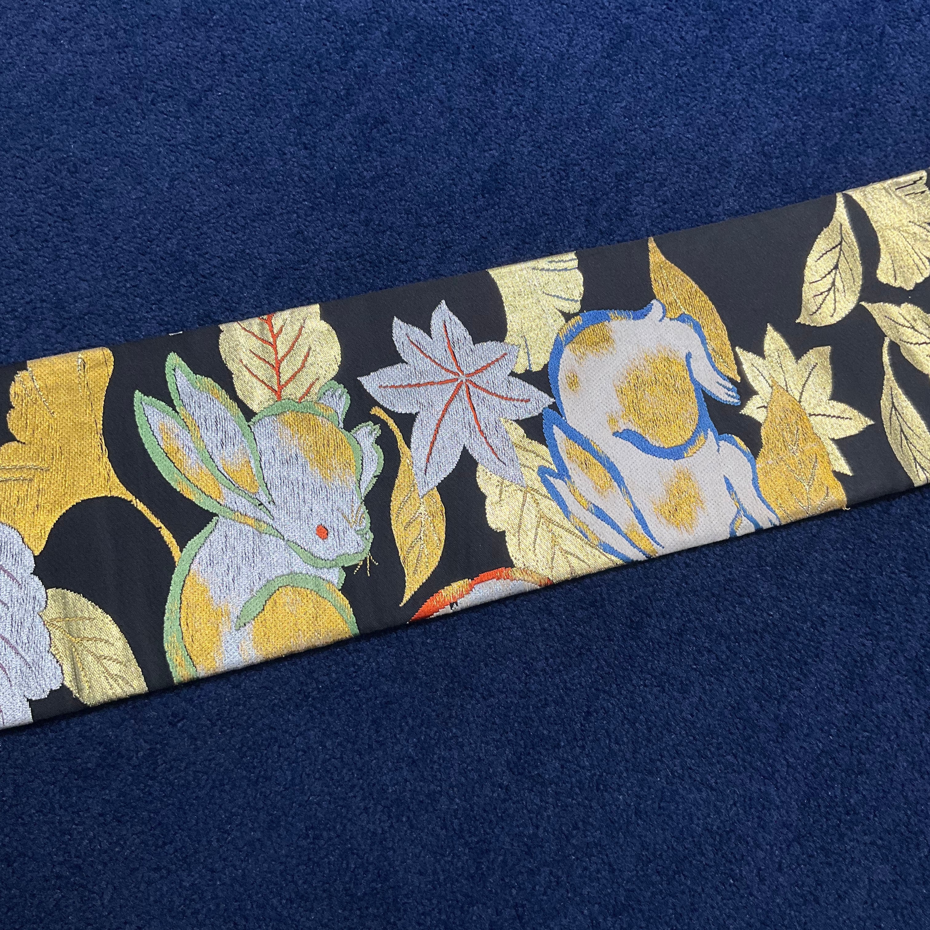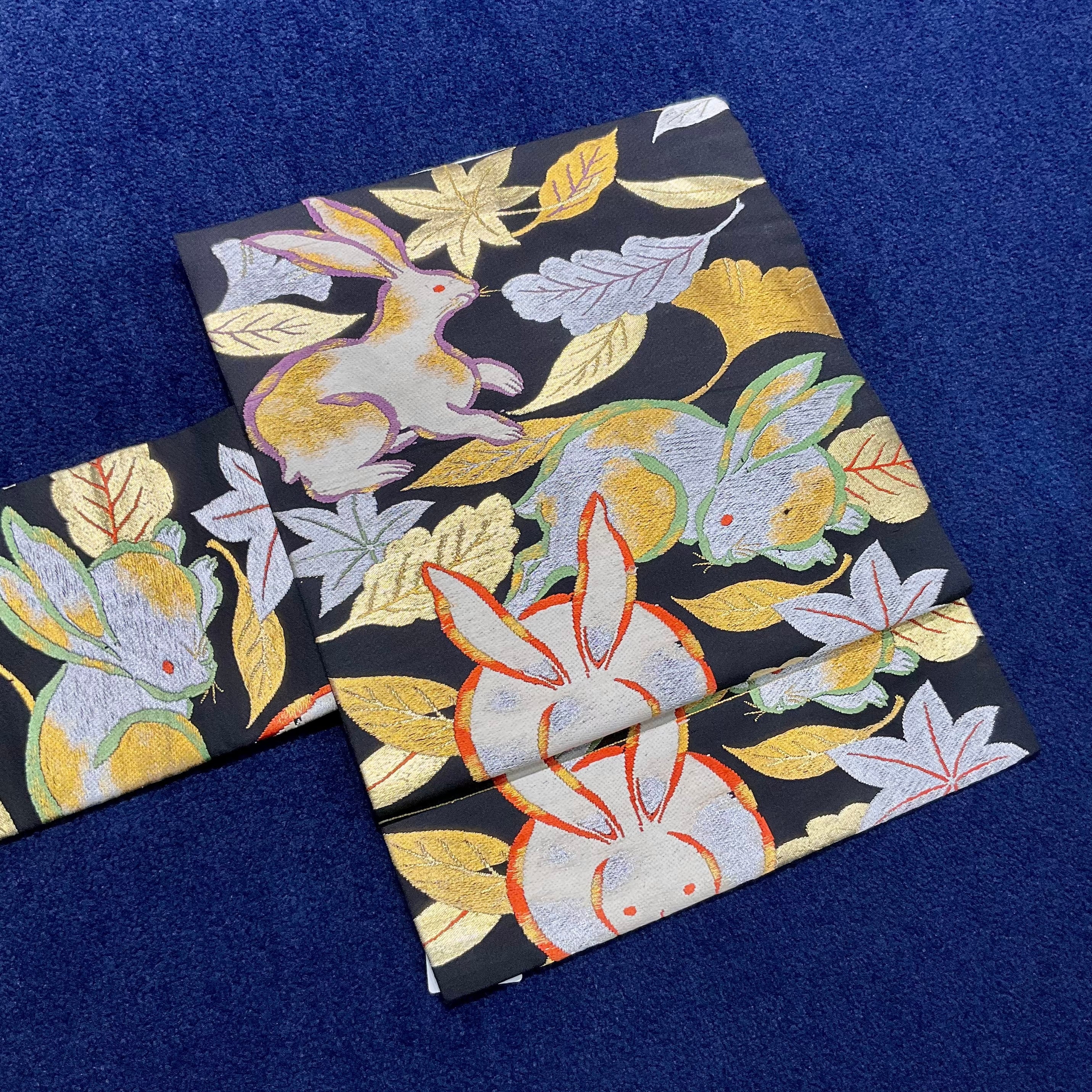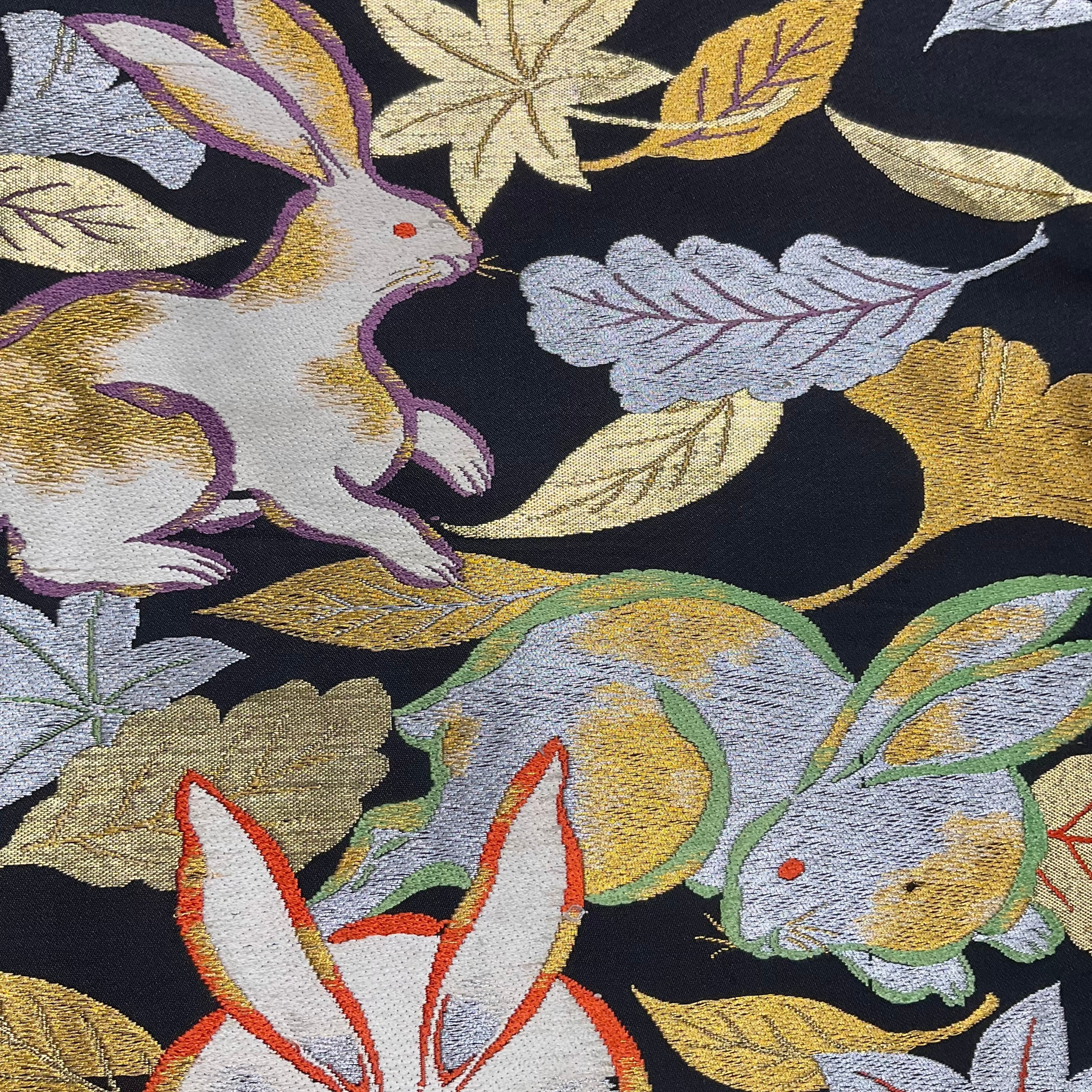 黒地にウサギと紅葉やイチョウの織り模様が美しいアンティーク名古屋帯です
