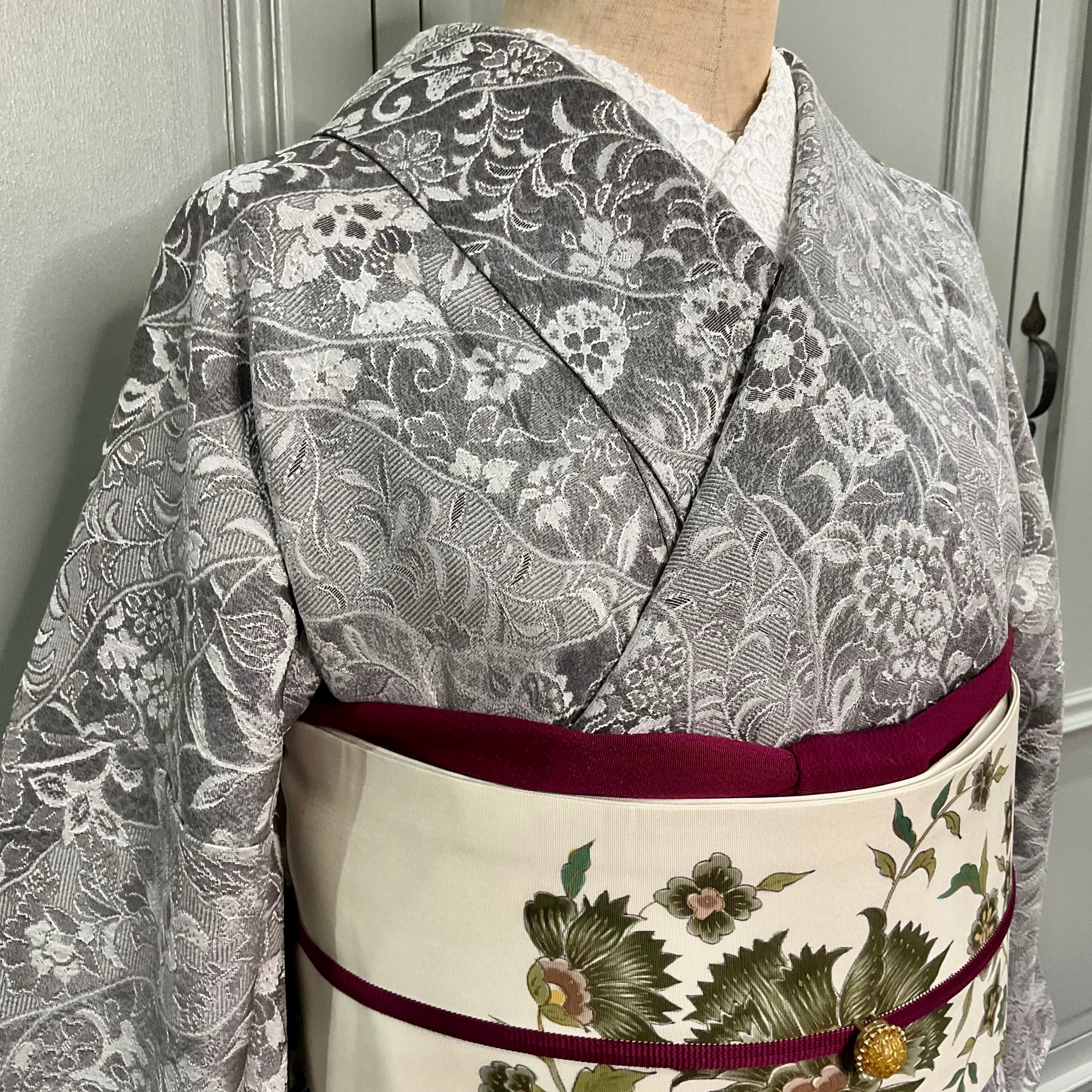 淡い墨色の地色に、花の織り模様が美しい天目織の小紋着物です