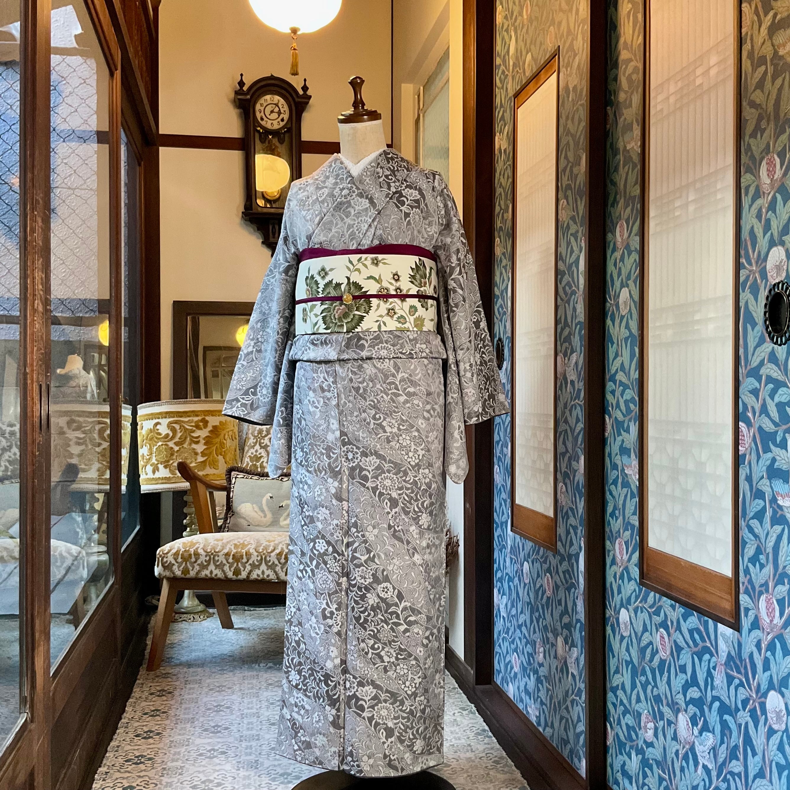 銀灰の華流れ*long 天目織 グレー 更紗模様 唐花 小紋着物 B376