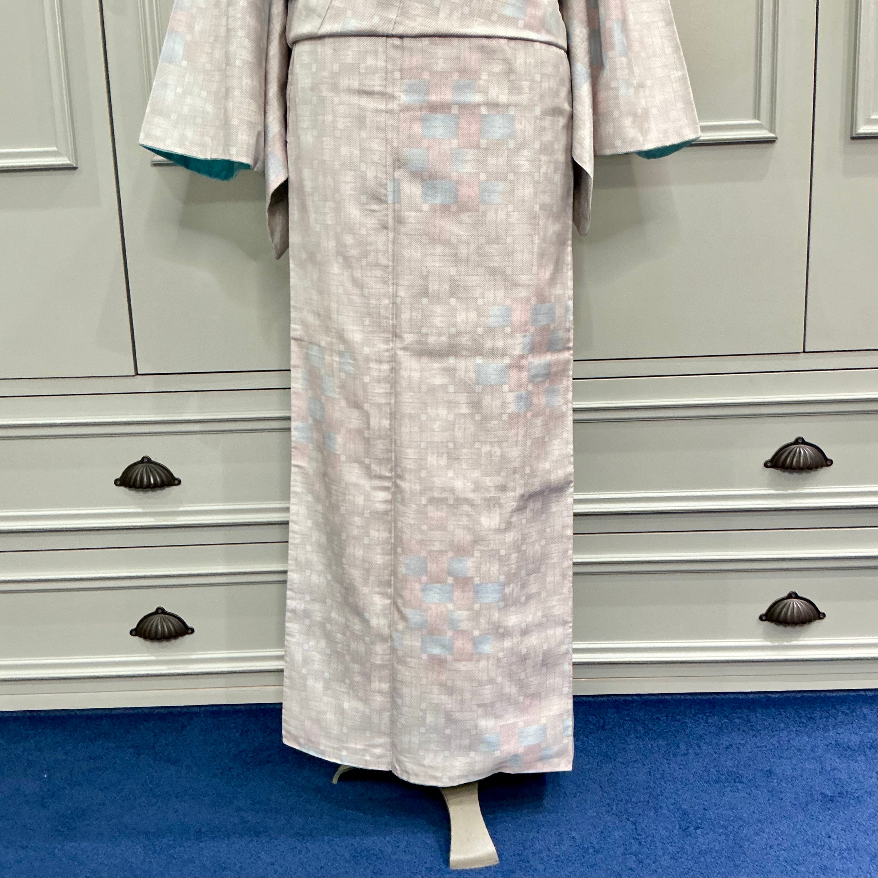 long*絹雪*白大島 幾何学模様 青 桃 空色 白大島紬着物 B378