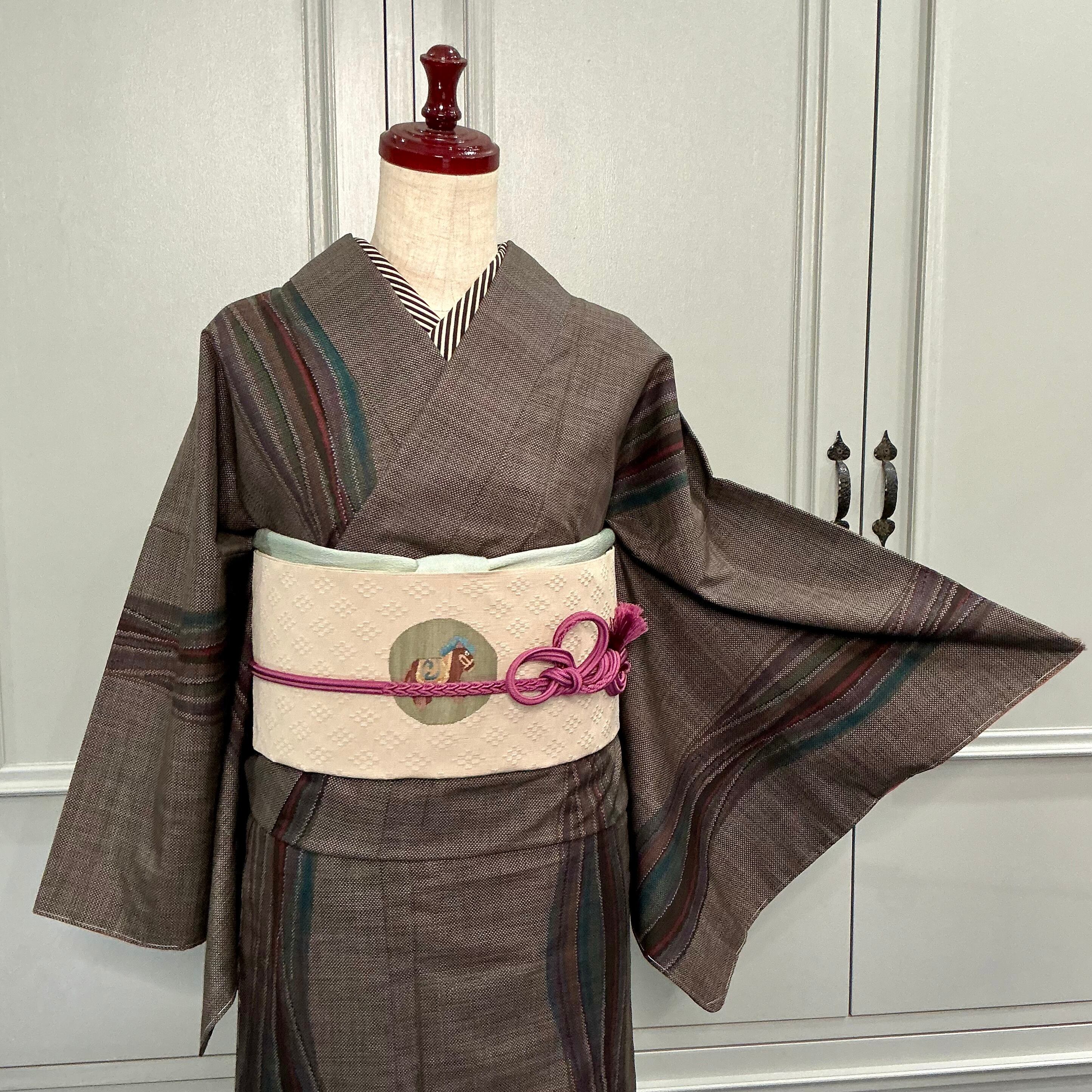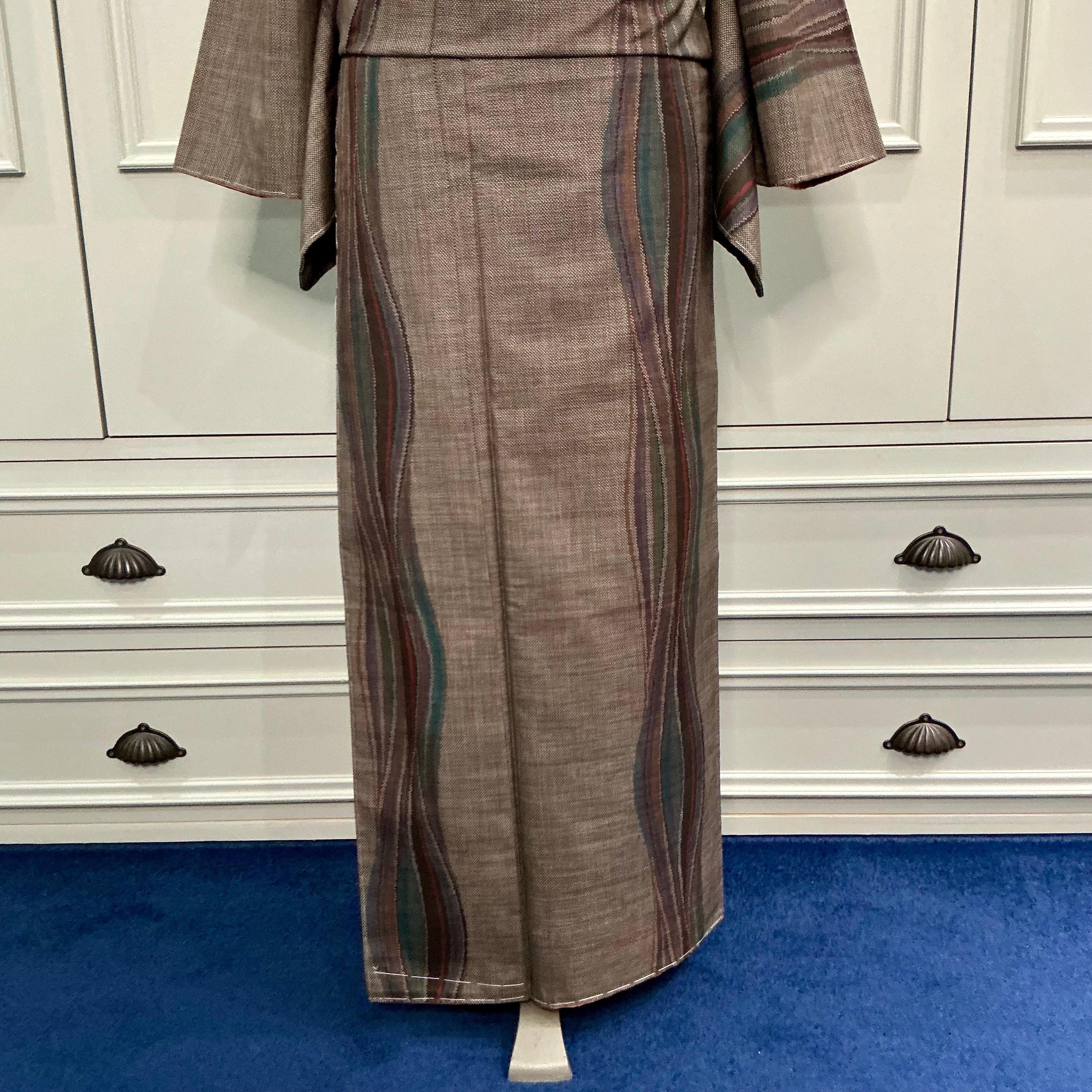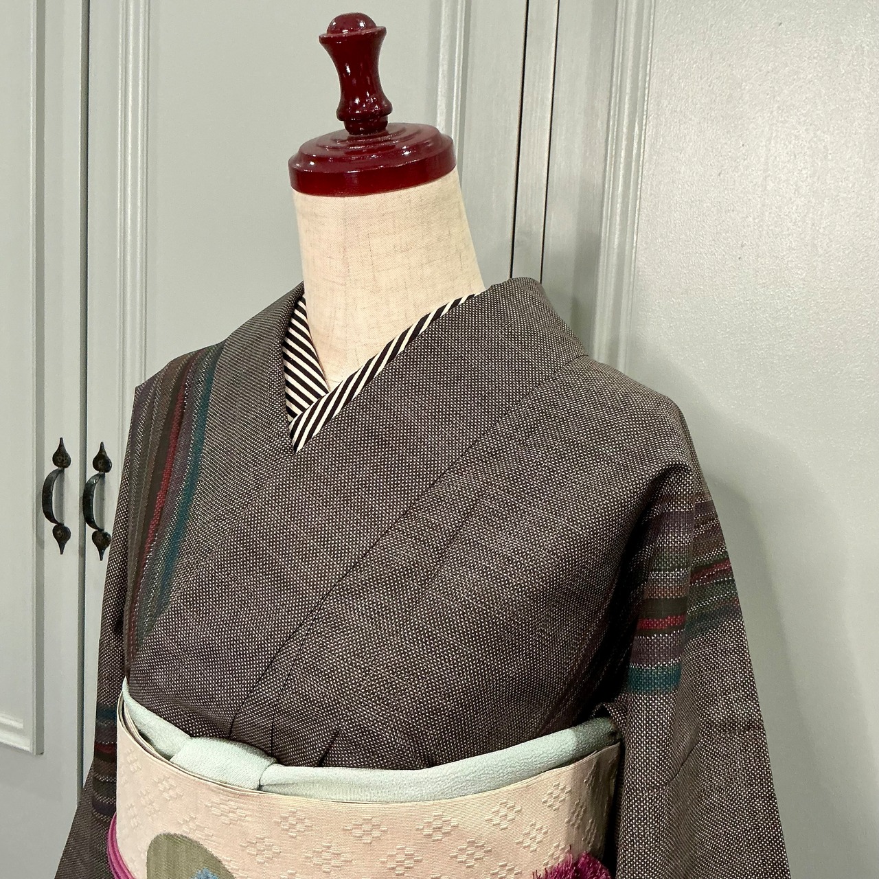 大人っぽいブラウンの地色に色とりどりのラインで描かれた立涌がスタイリッシュな大島紬の着物です