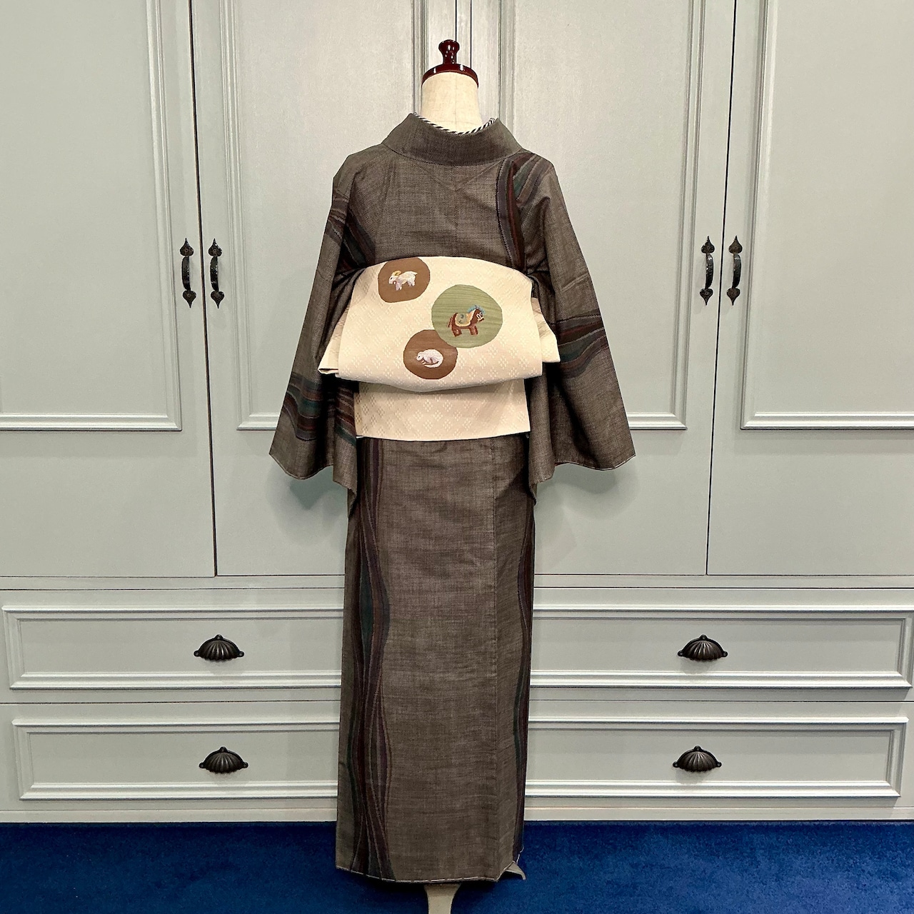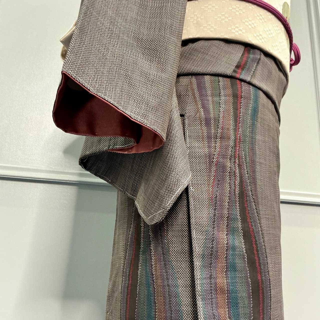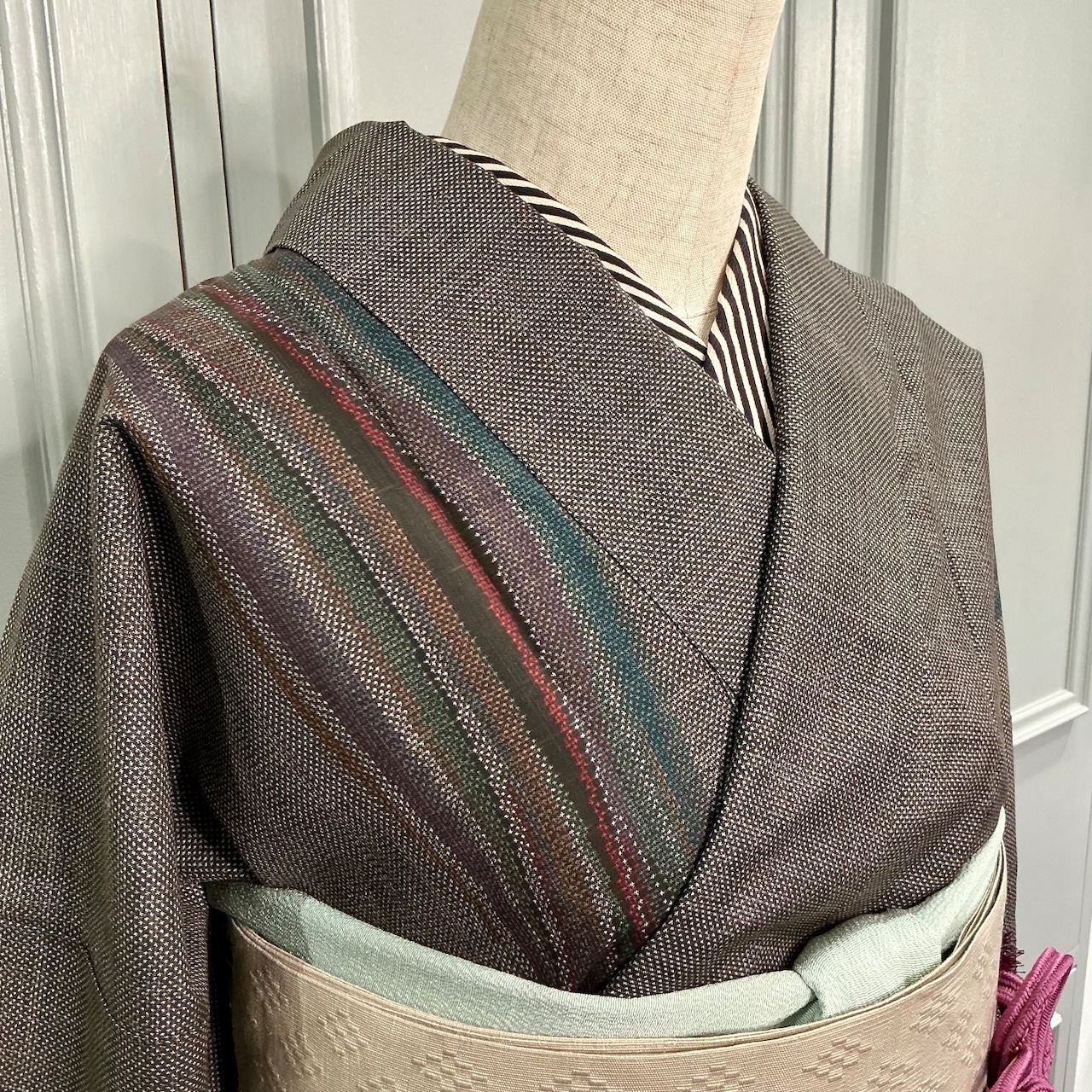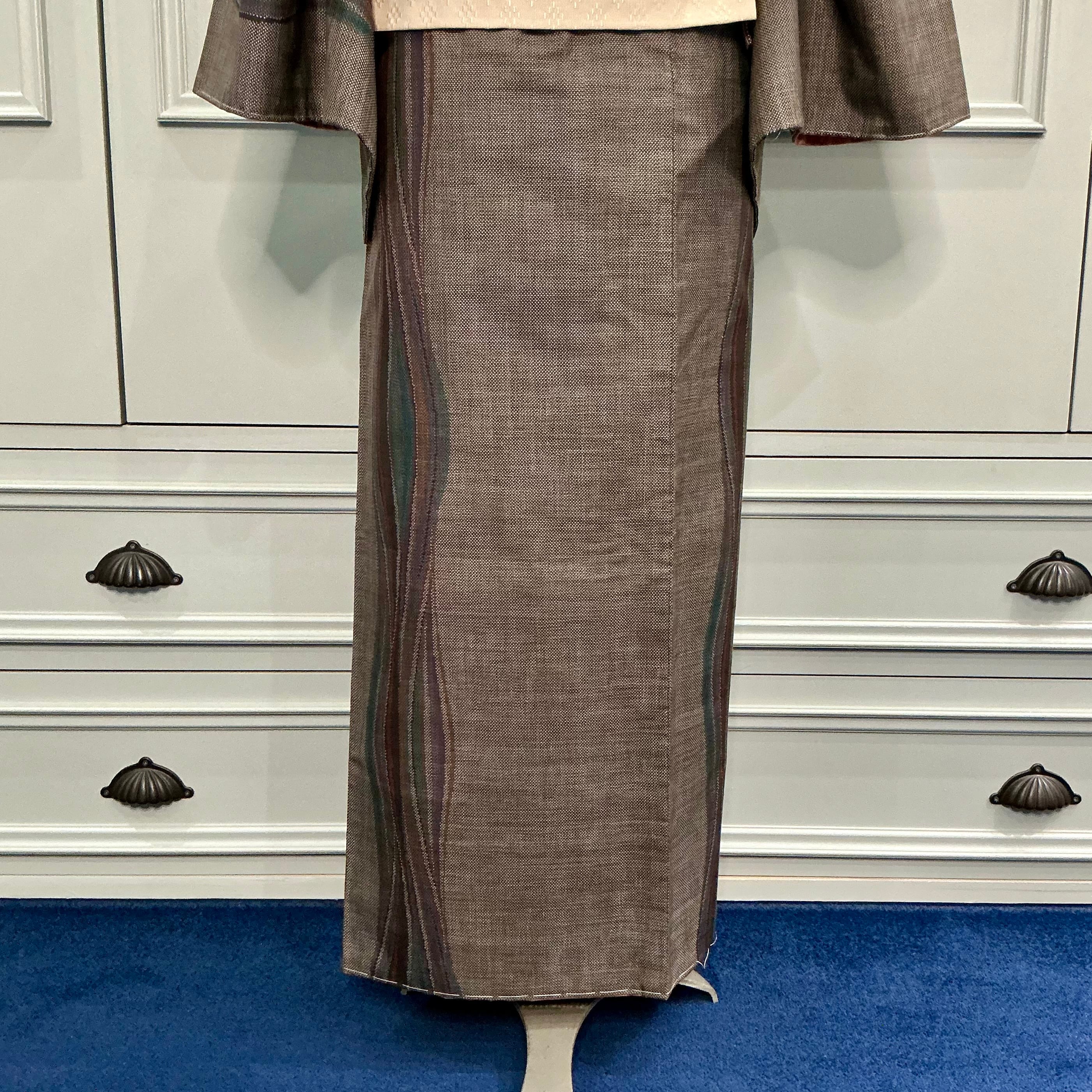 大人っぽいブラウンの地色に色とりどりのラインで描かれた立涌がスタイリッシュな大島紬の着物です