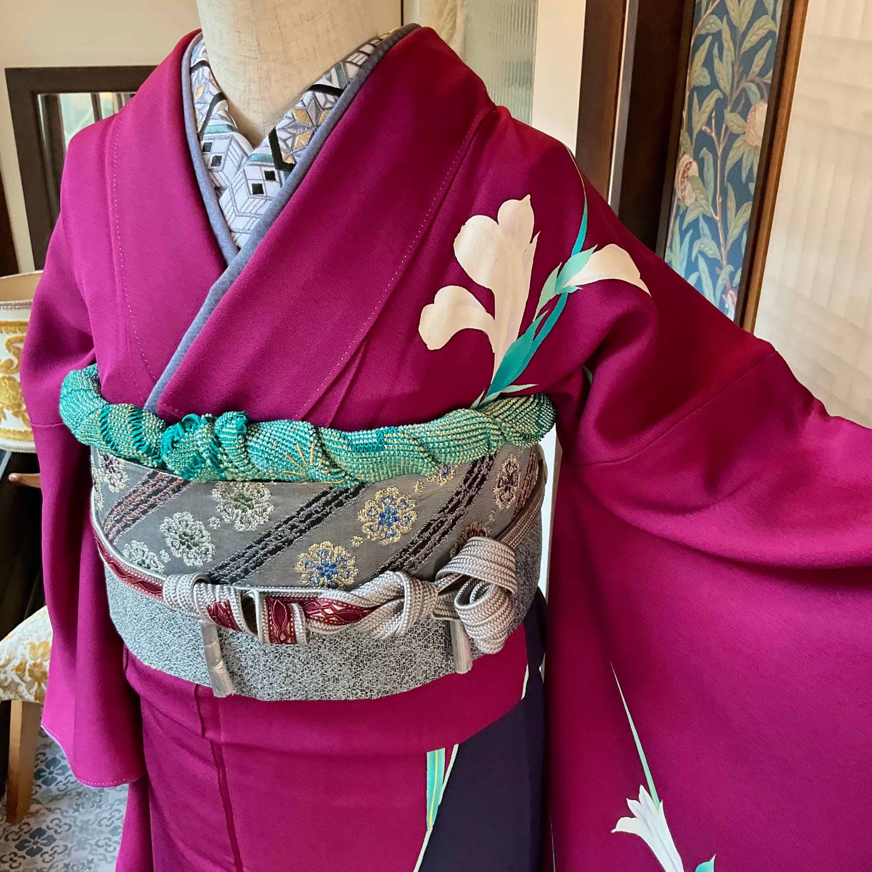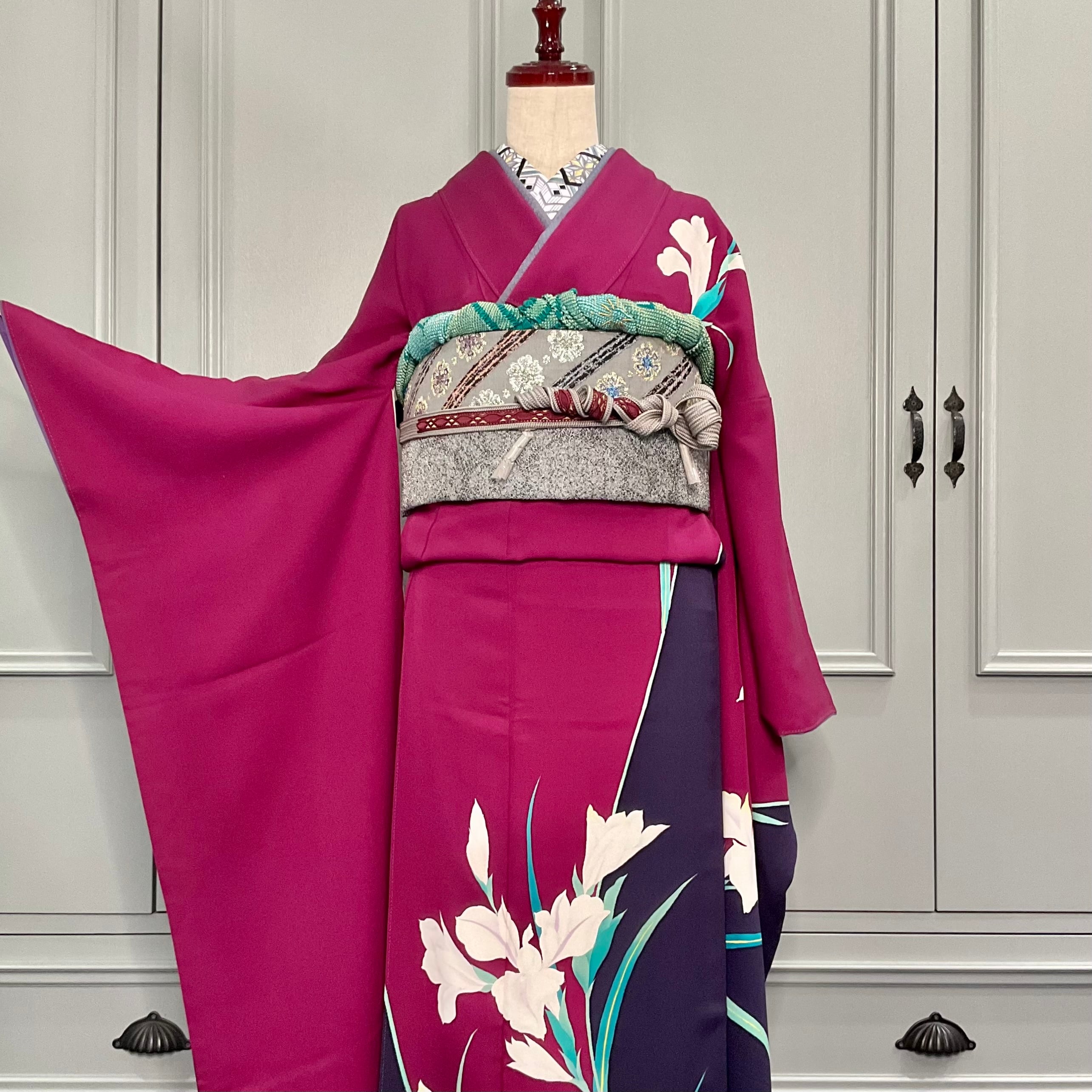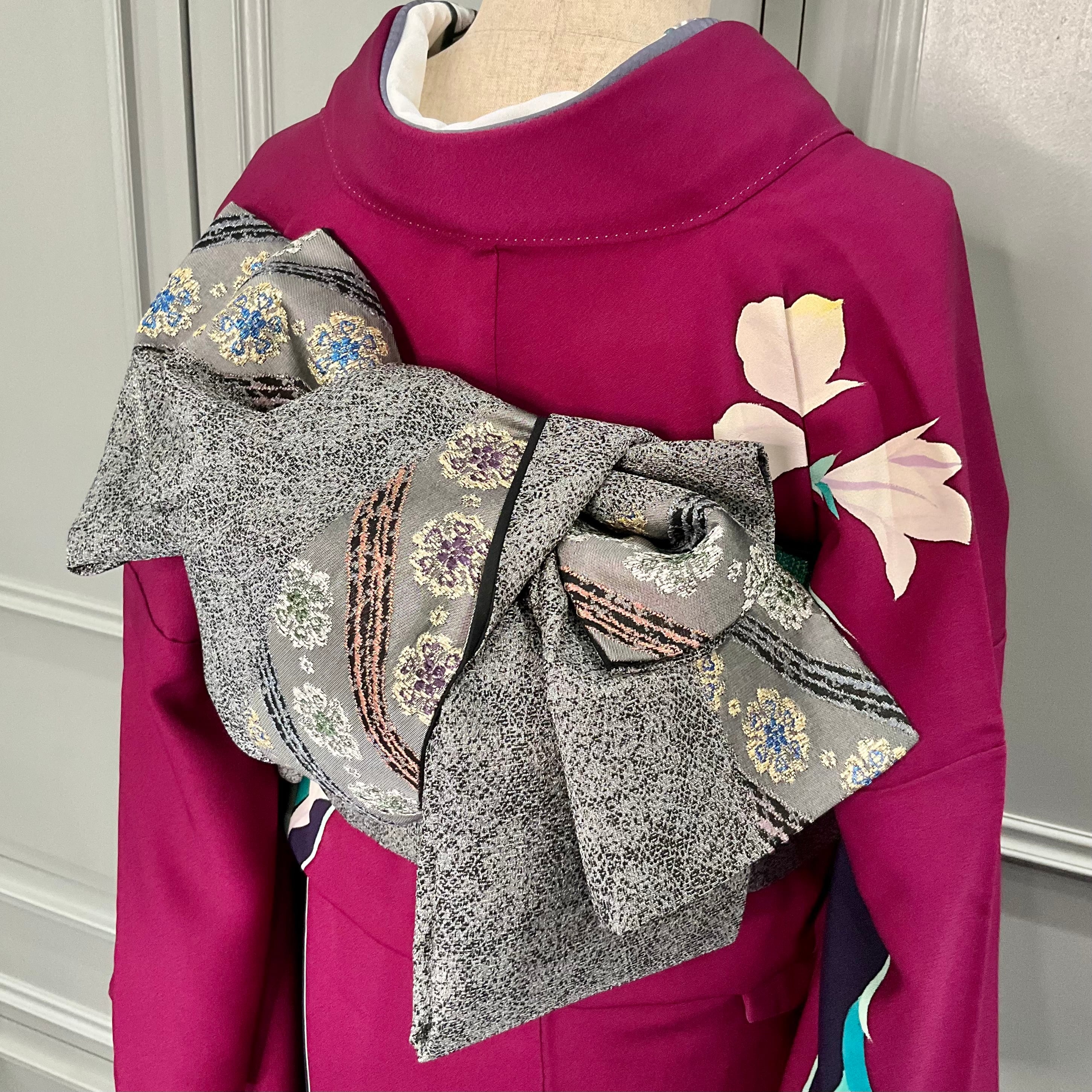 合わせた袋帯は、振袖の美しさを引き立てるように、大人シックなグレー