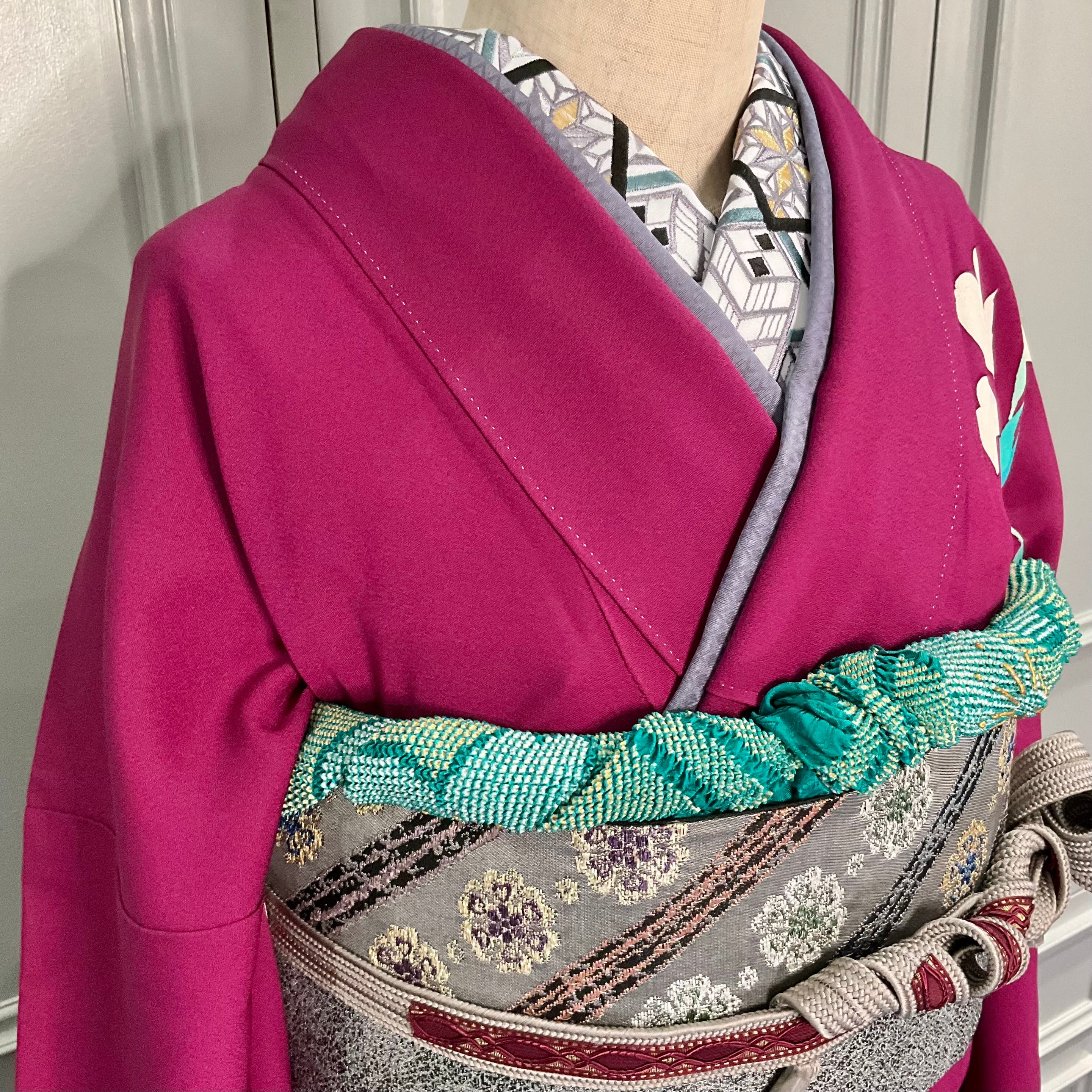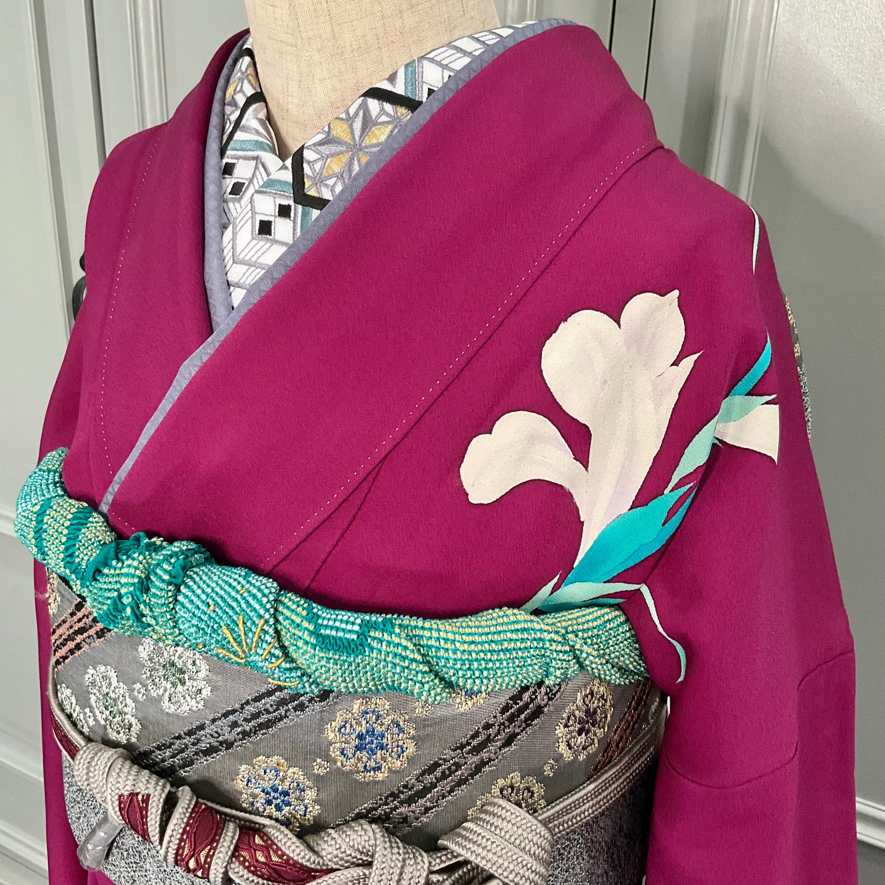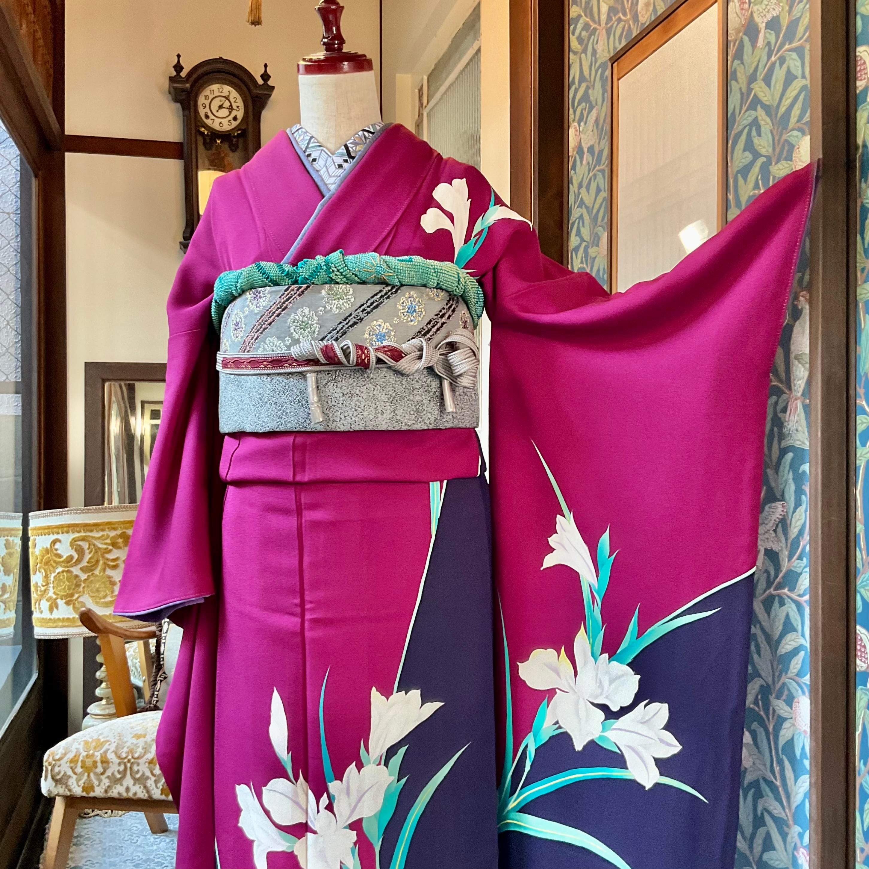 合わせた袋帯は、振袖の美しさを引き立てるように、大人シックなグレー