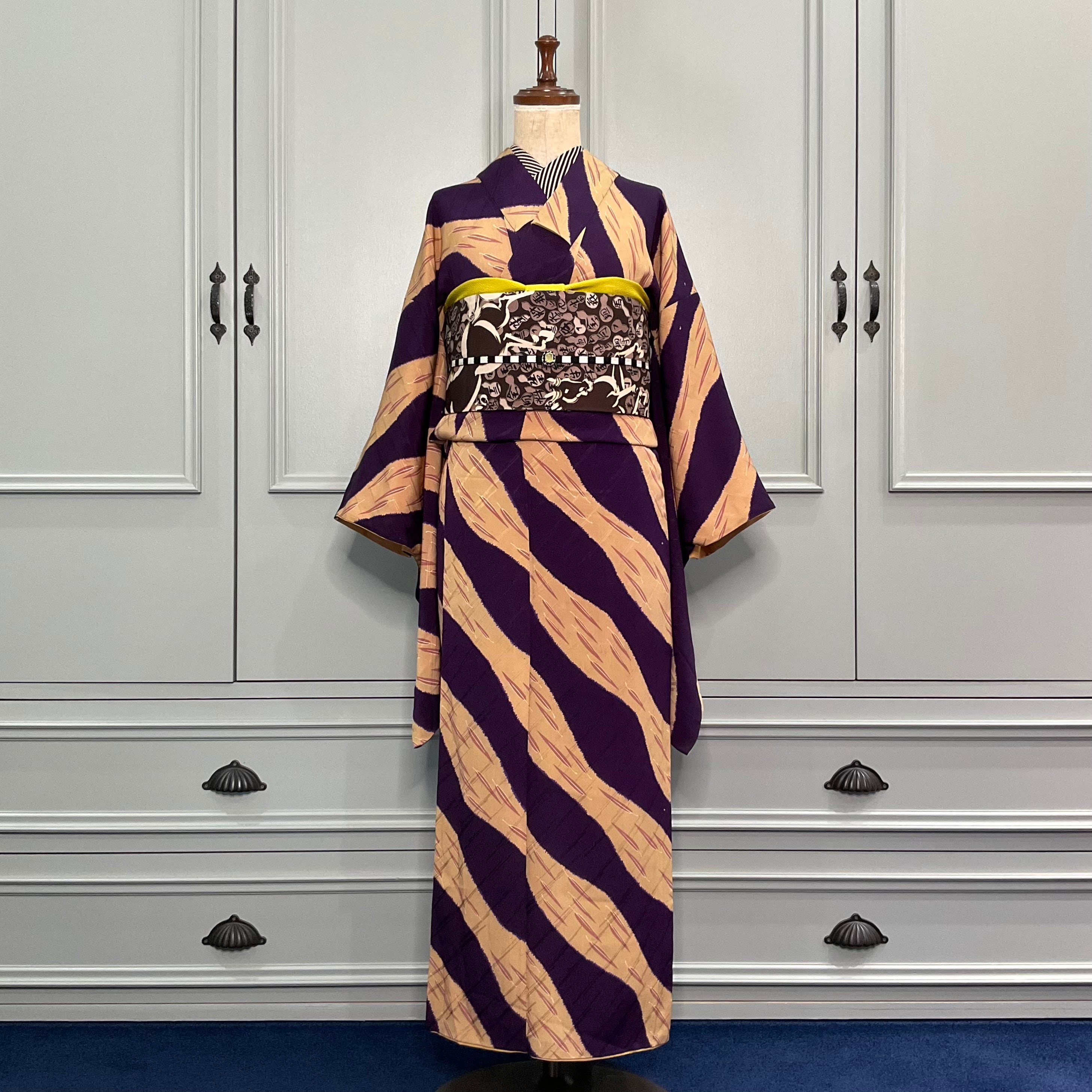 黒×オレンジベージュ系のななめボーダーがお洒落な袷のアンティーク小紋着物です