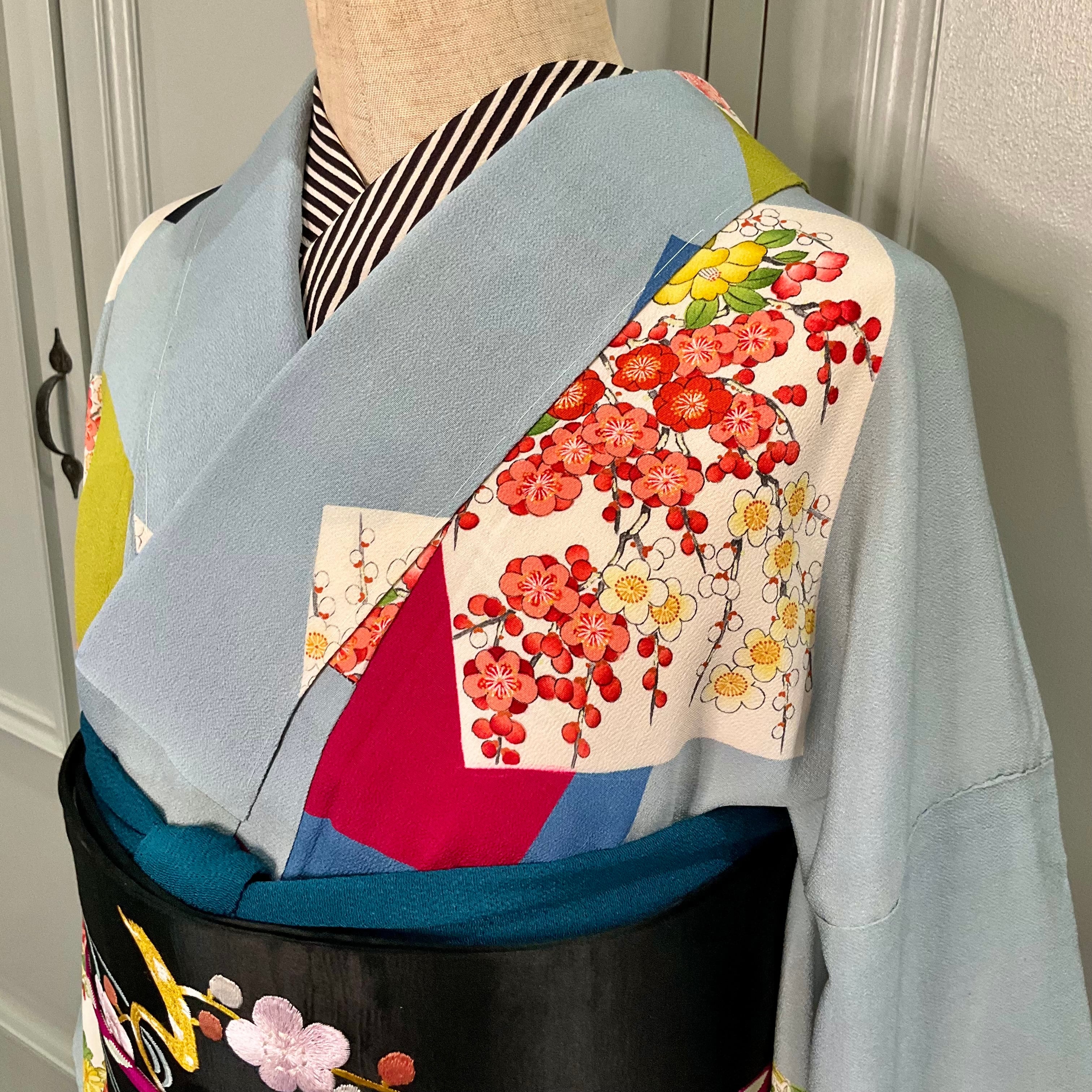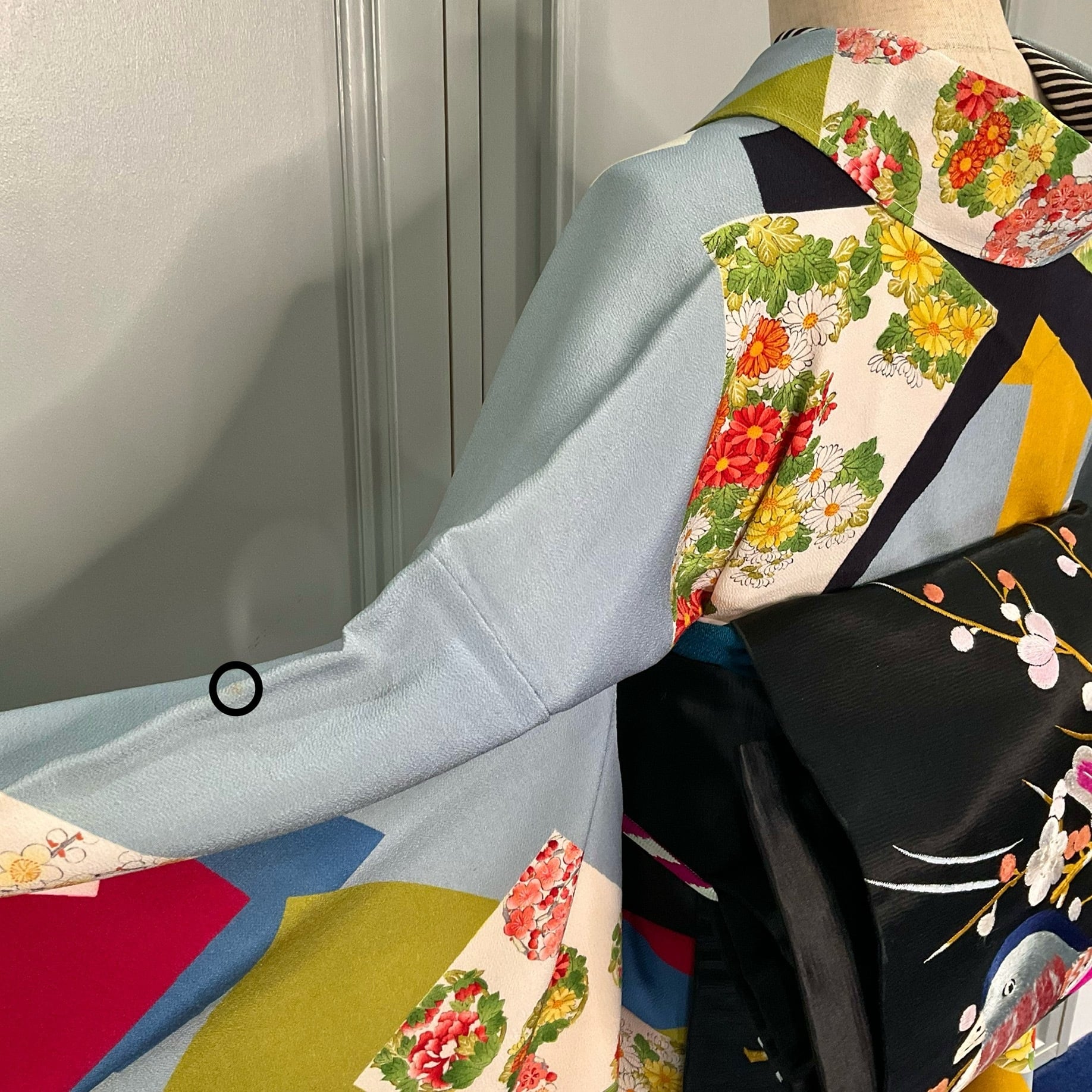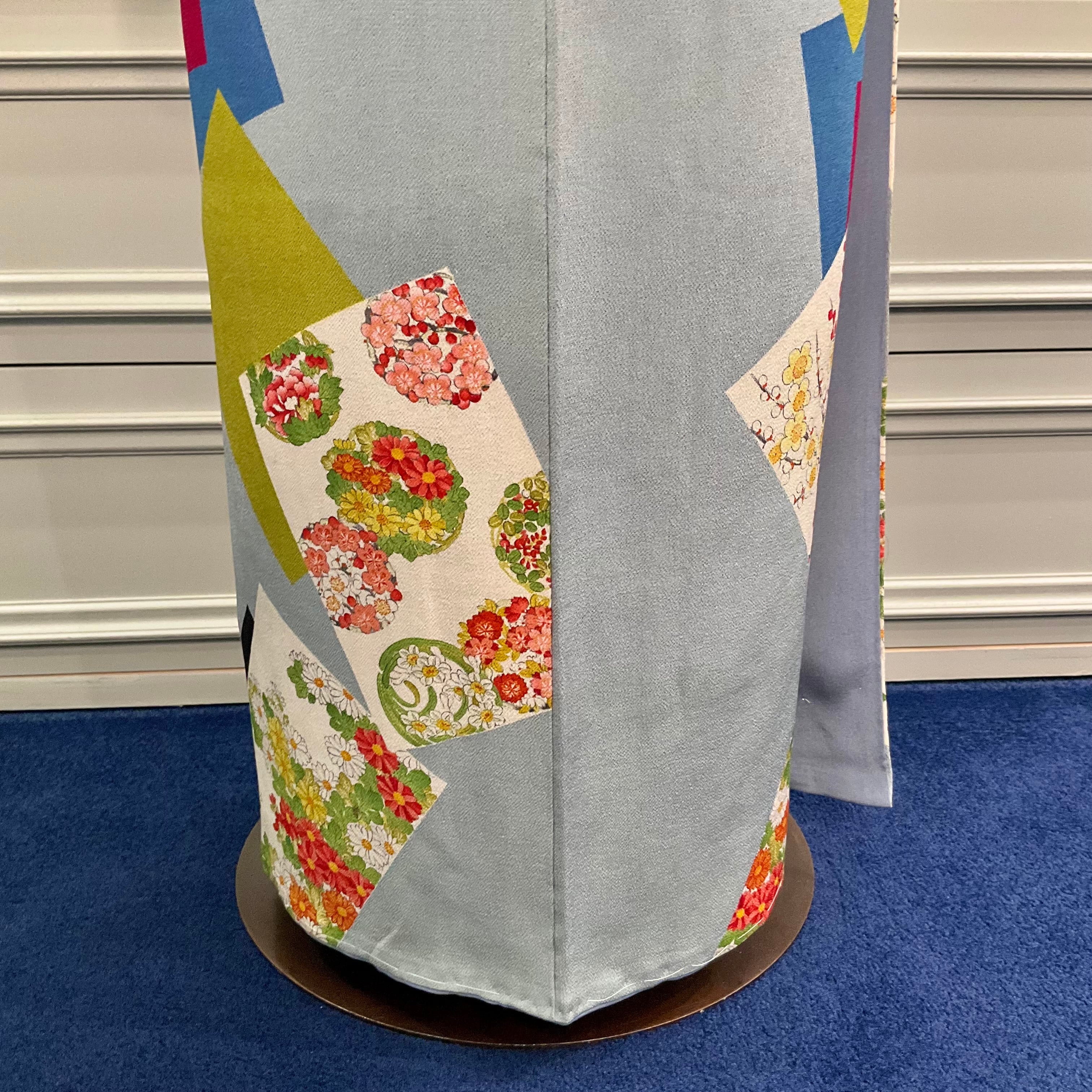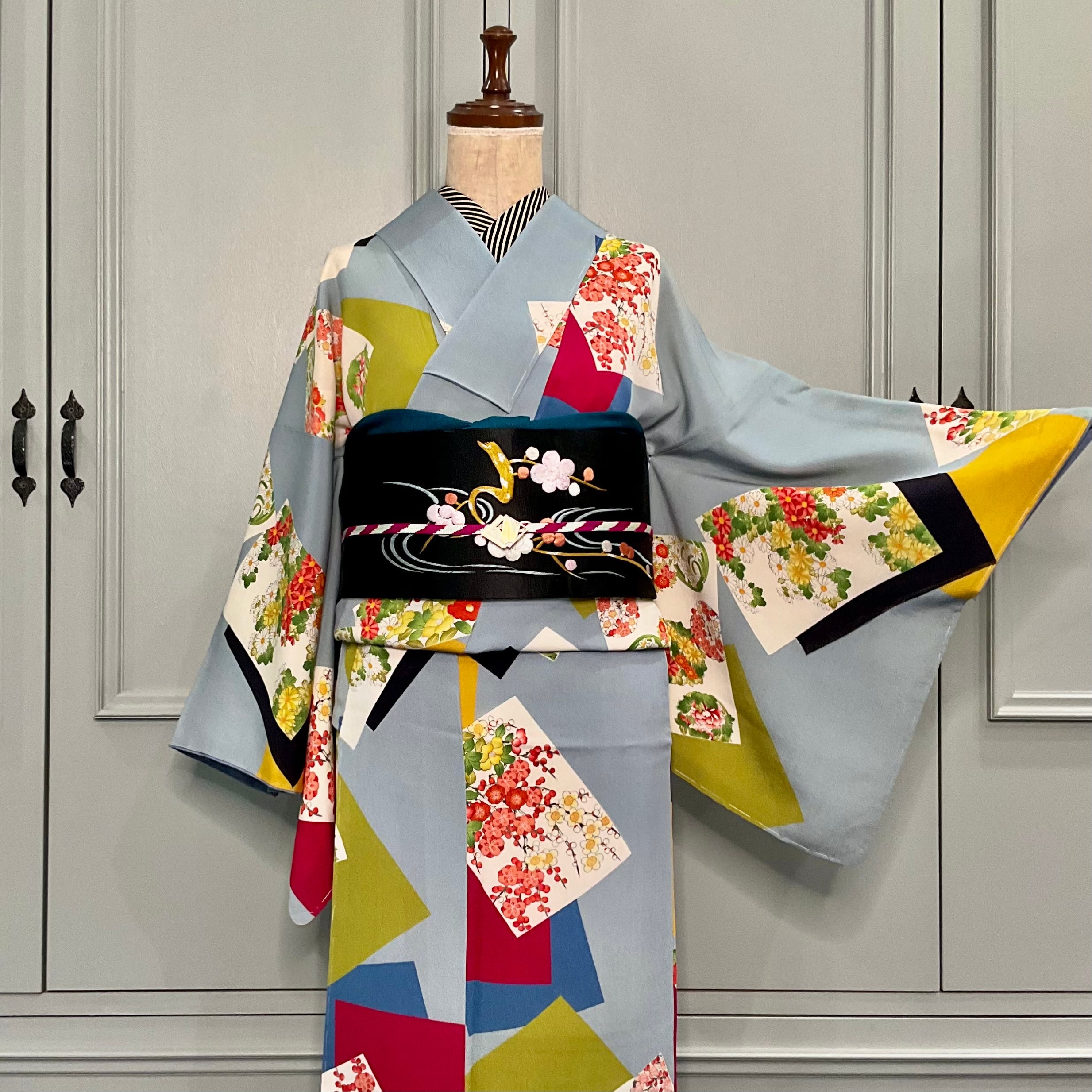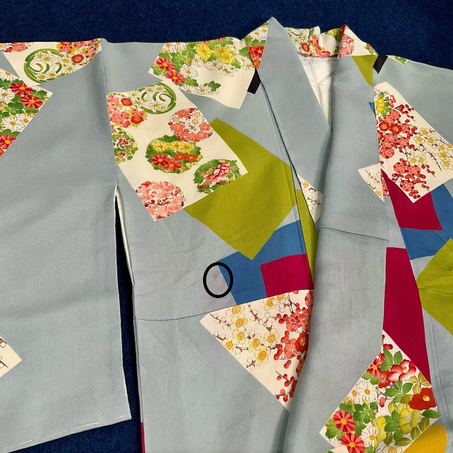 柔らかな淡いブルー地に、色とりどりの色紙が舞い散る美しい一着です✨️