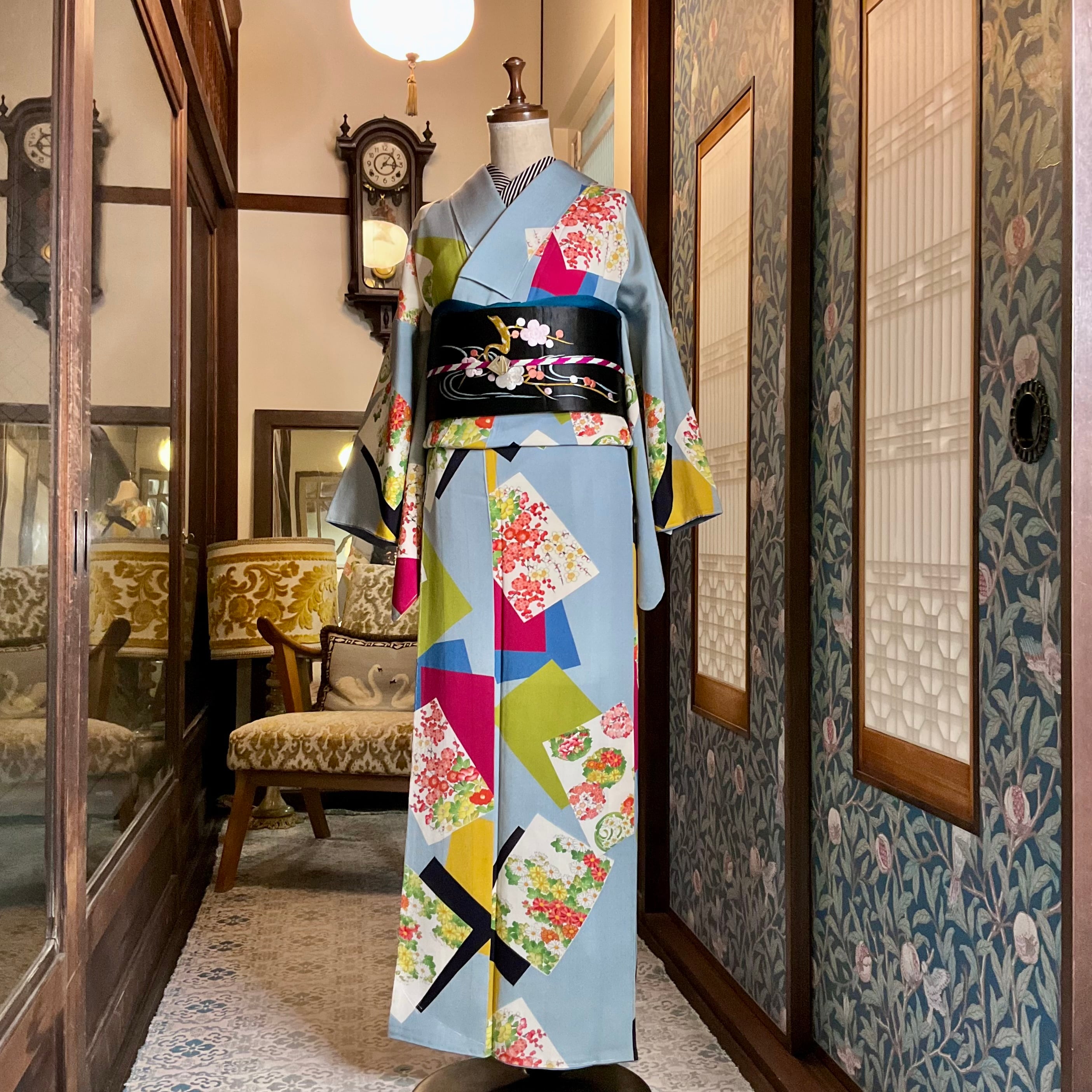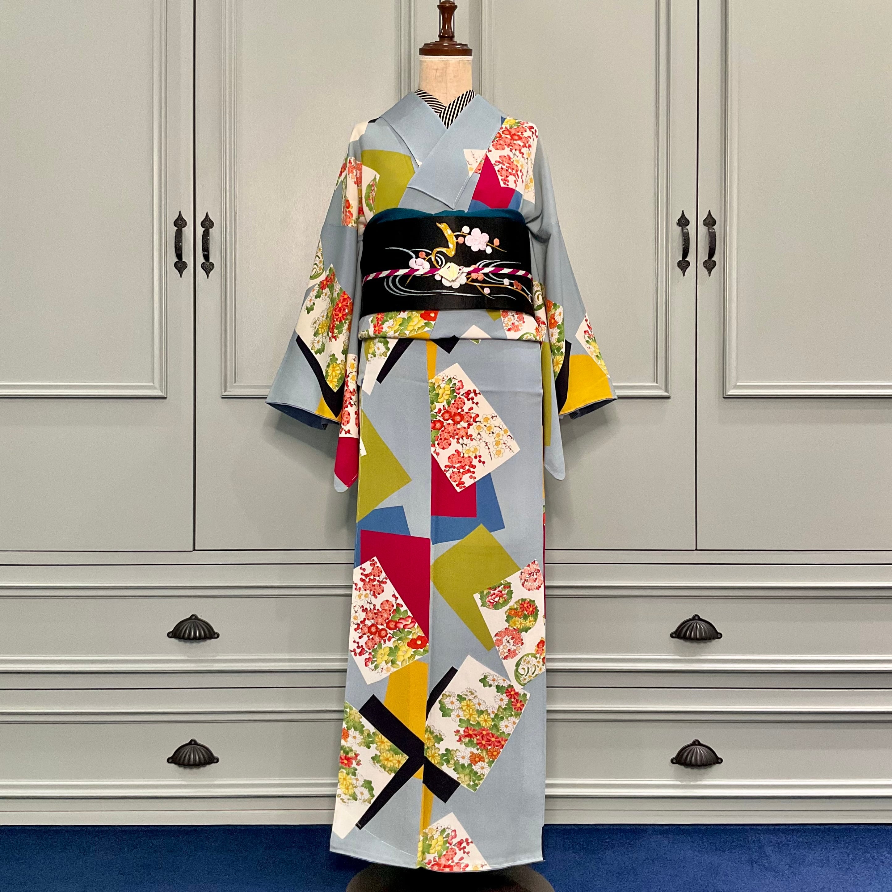 くすみライトブルー地に、色紙模様が描かれた袷のアンティーク小紋着物です