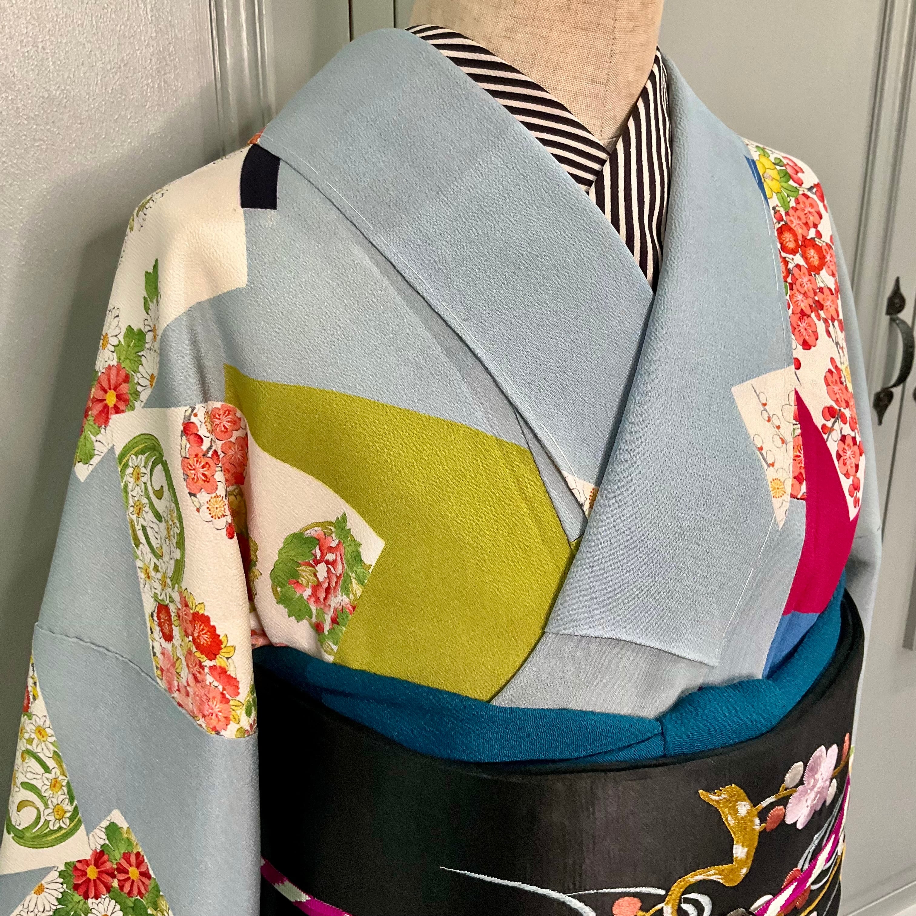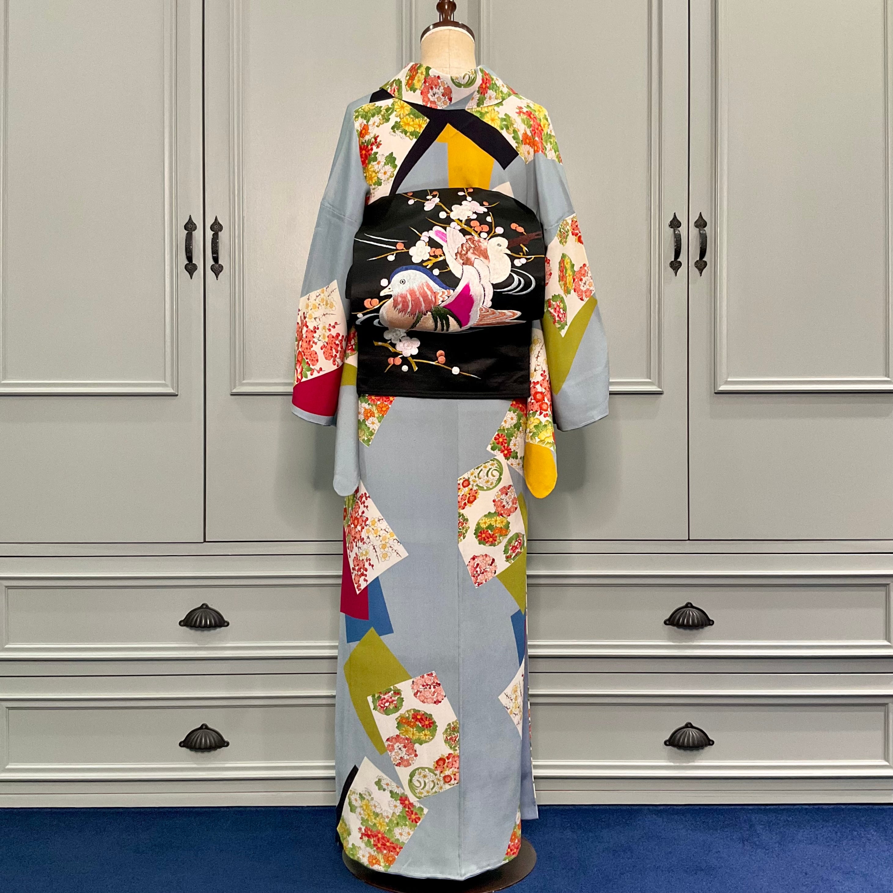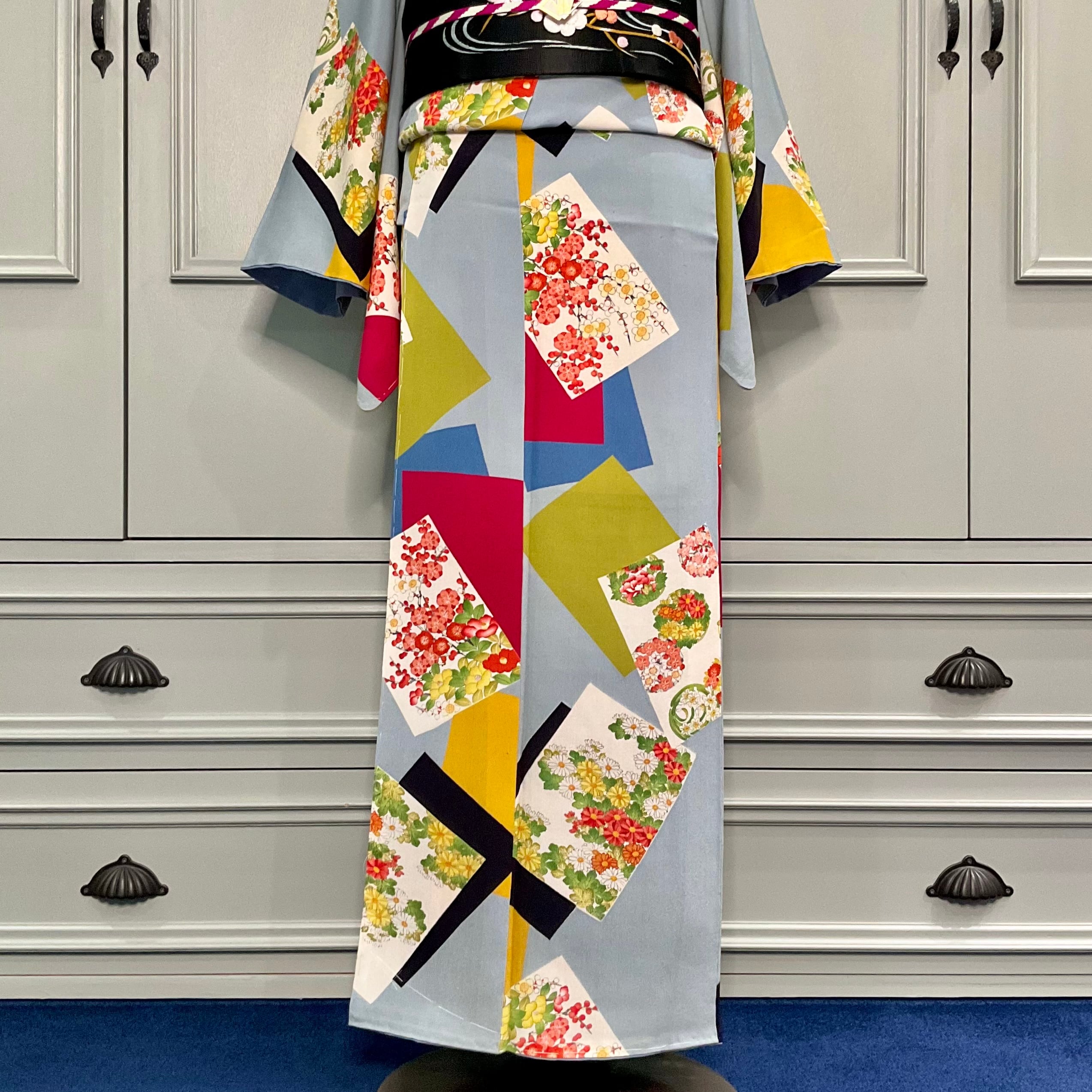霞空に色紙*花丸 梅 菊 椿 水仙 水色 ライトブルーグレー アンティーク小紋着物 B387