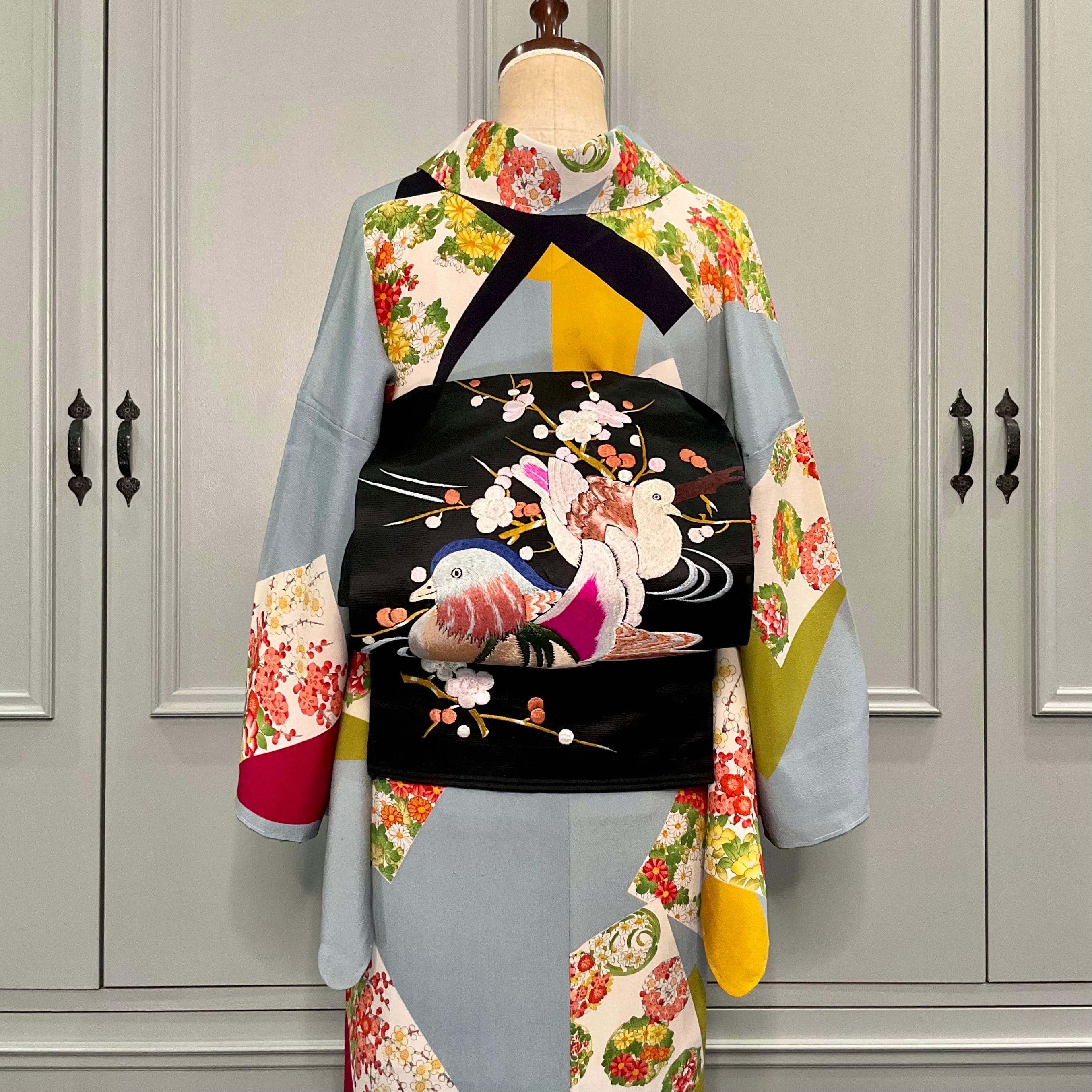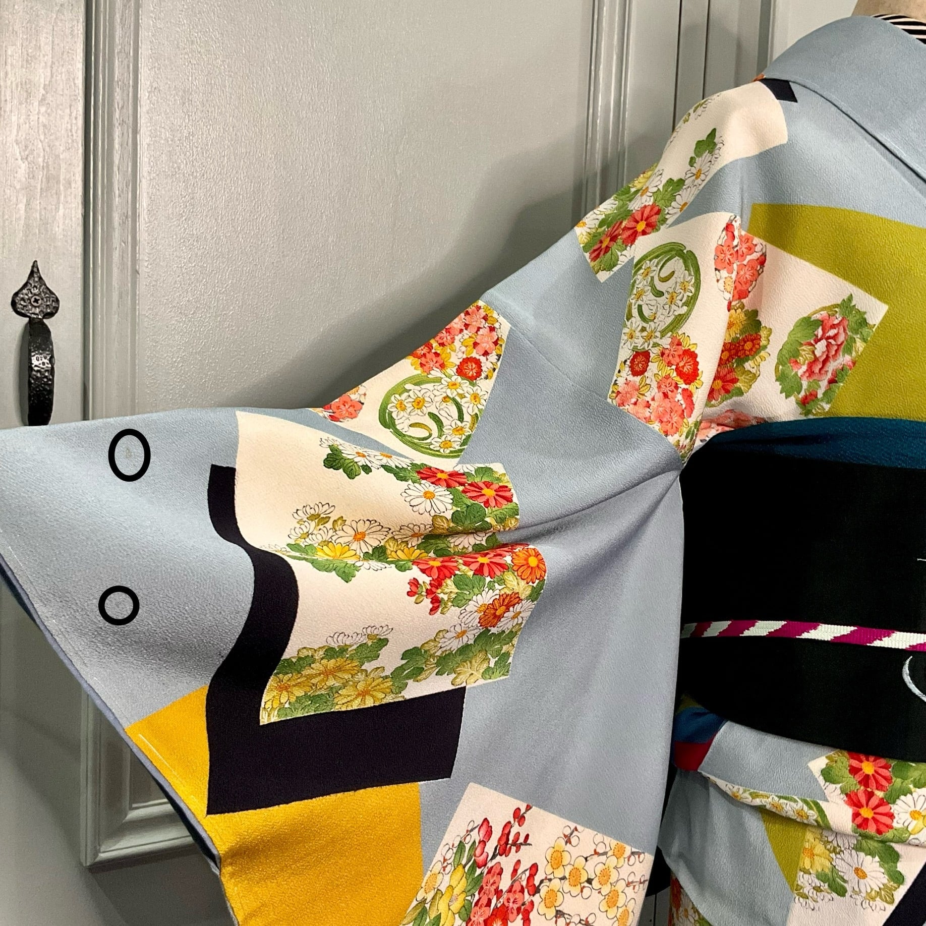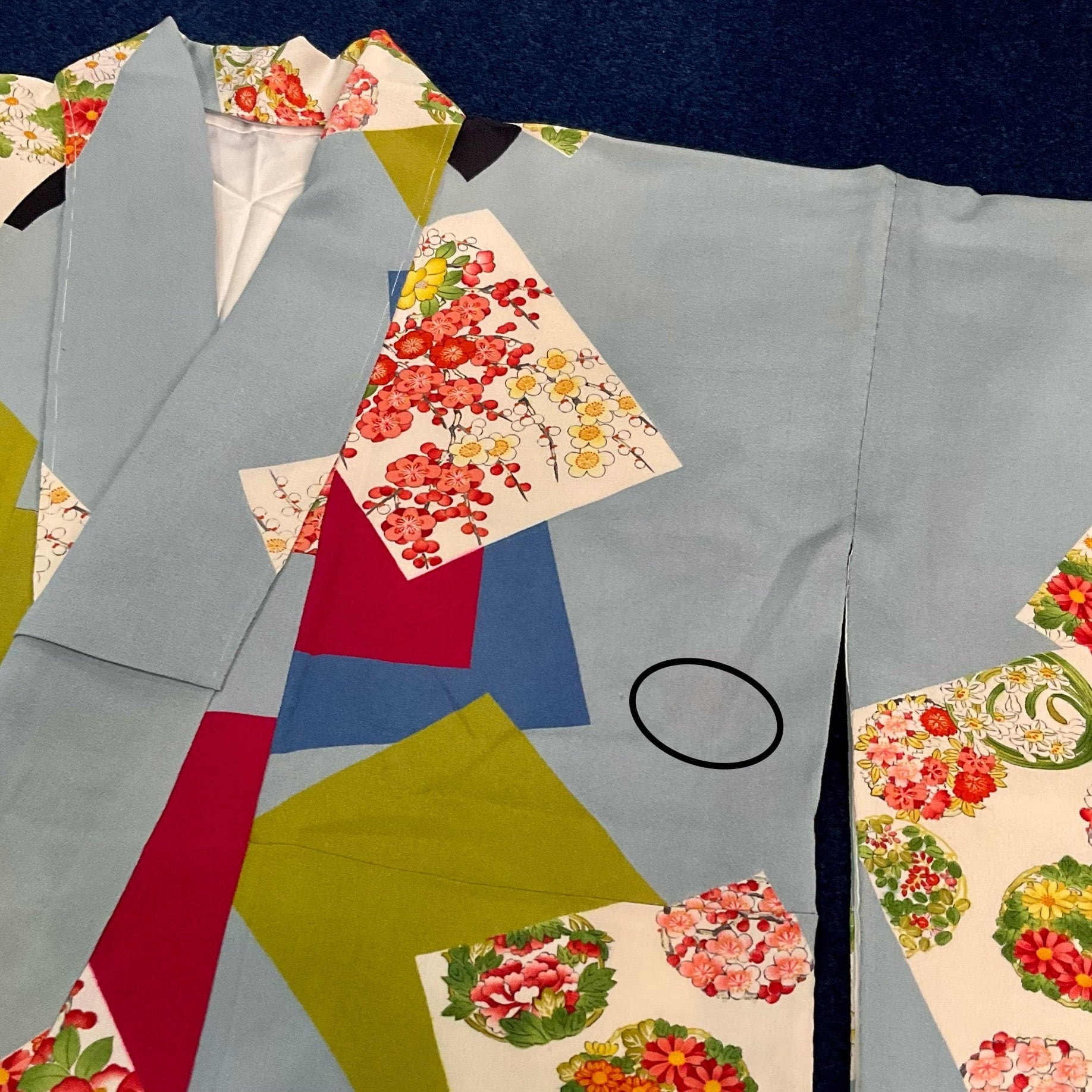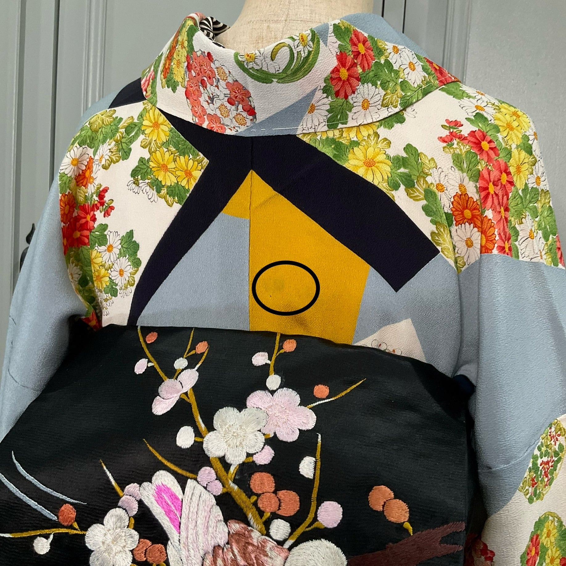 霞空に色紙*花丸 梅 菊 椿 水仙 水色 ライトブルーグレー アンティーク小紋着物 B387