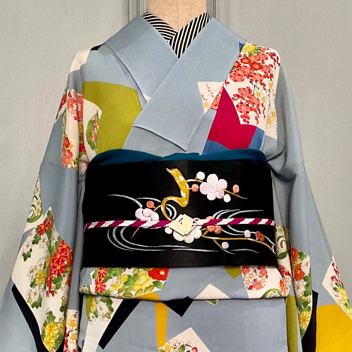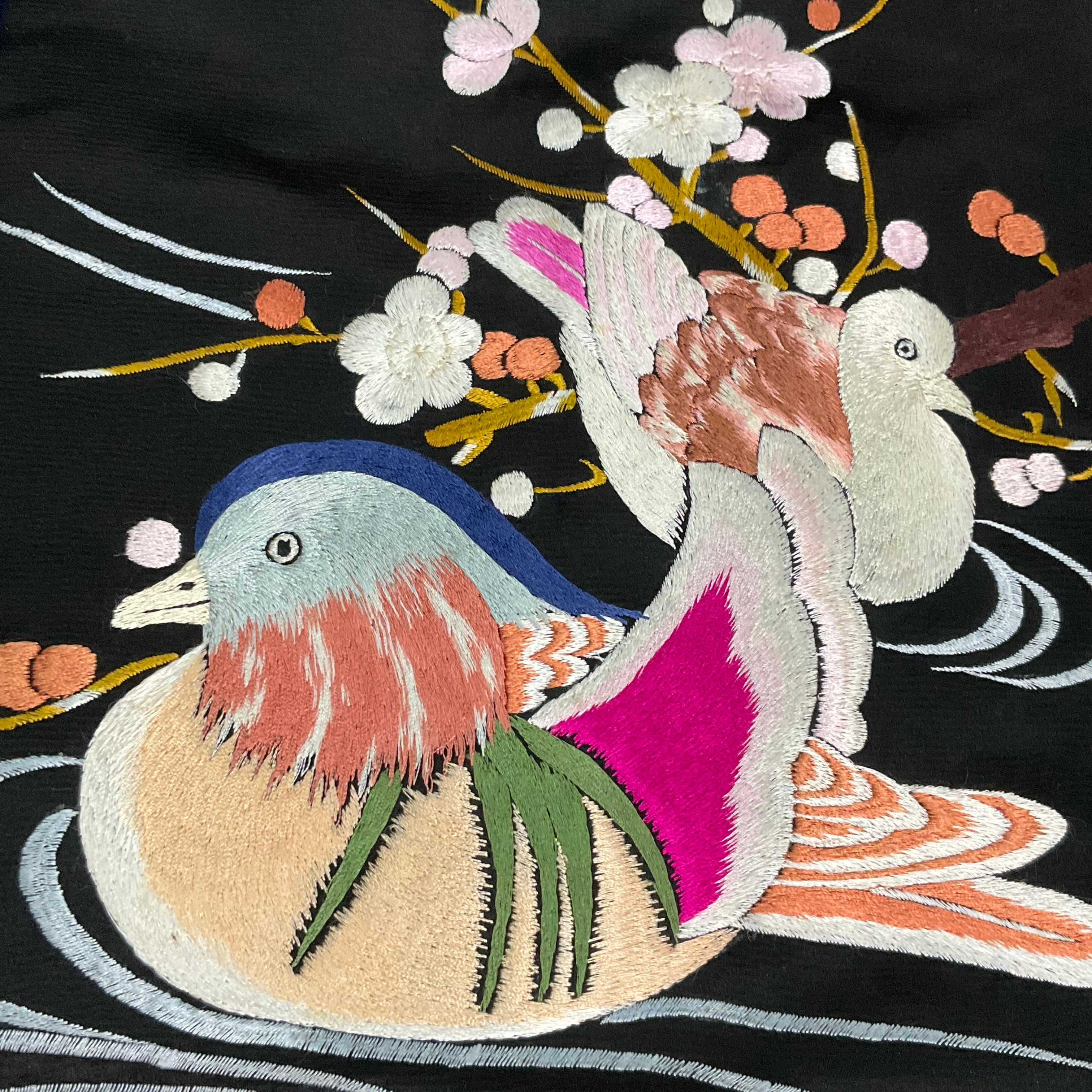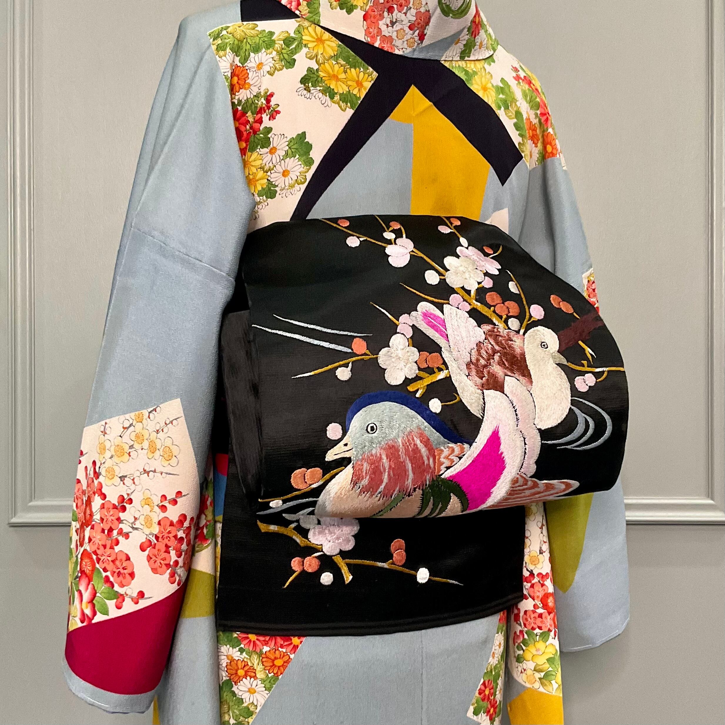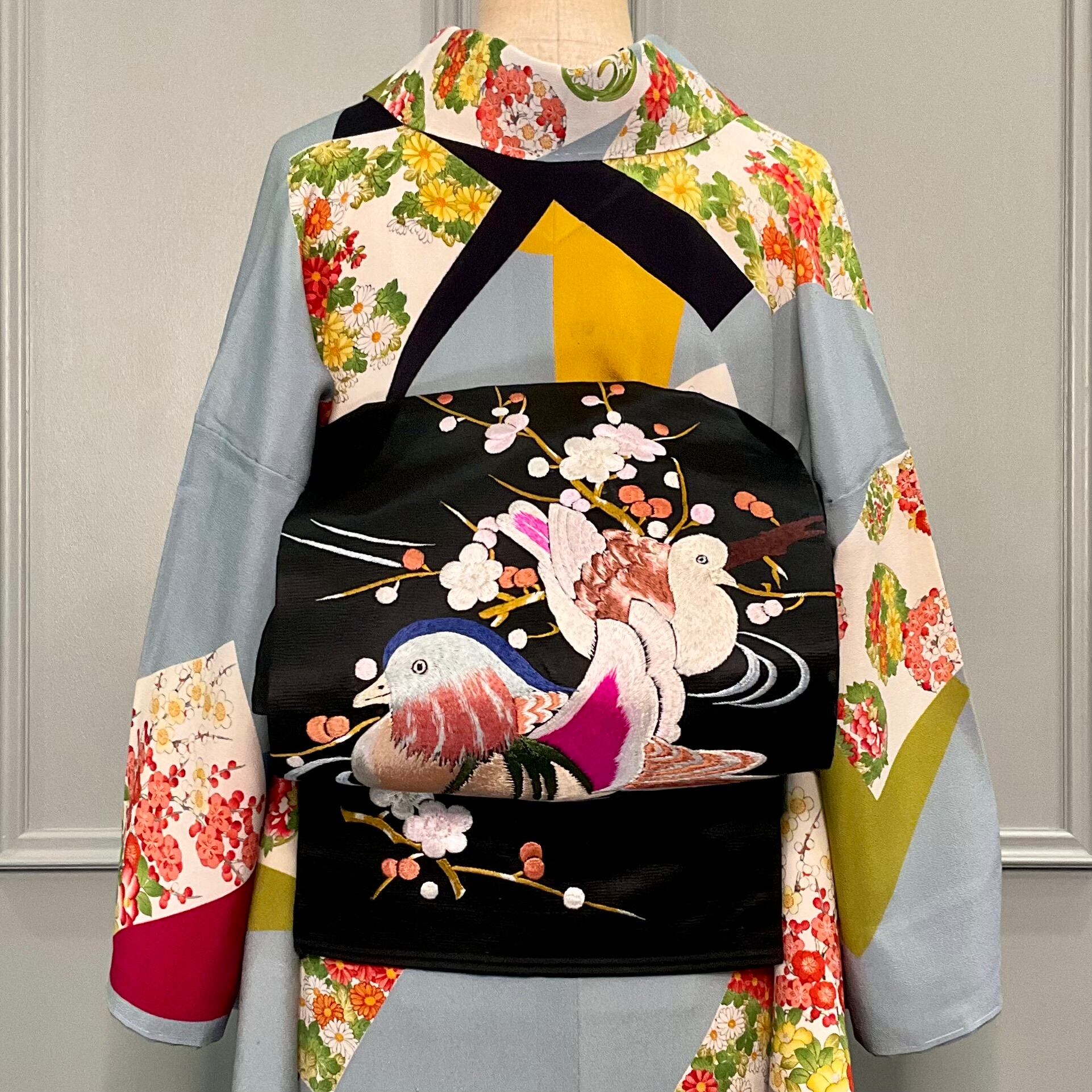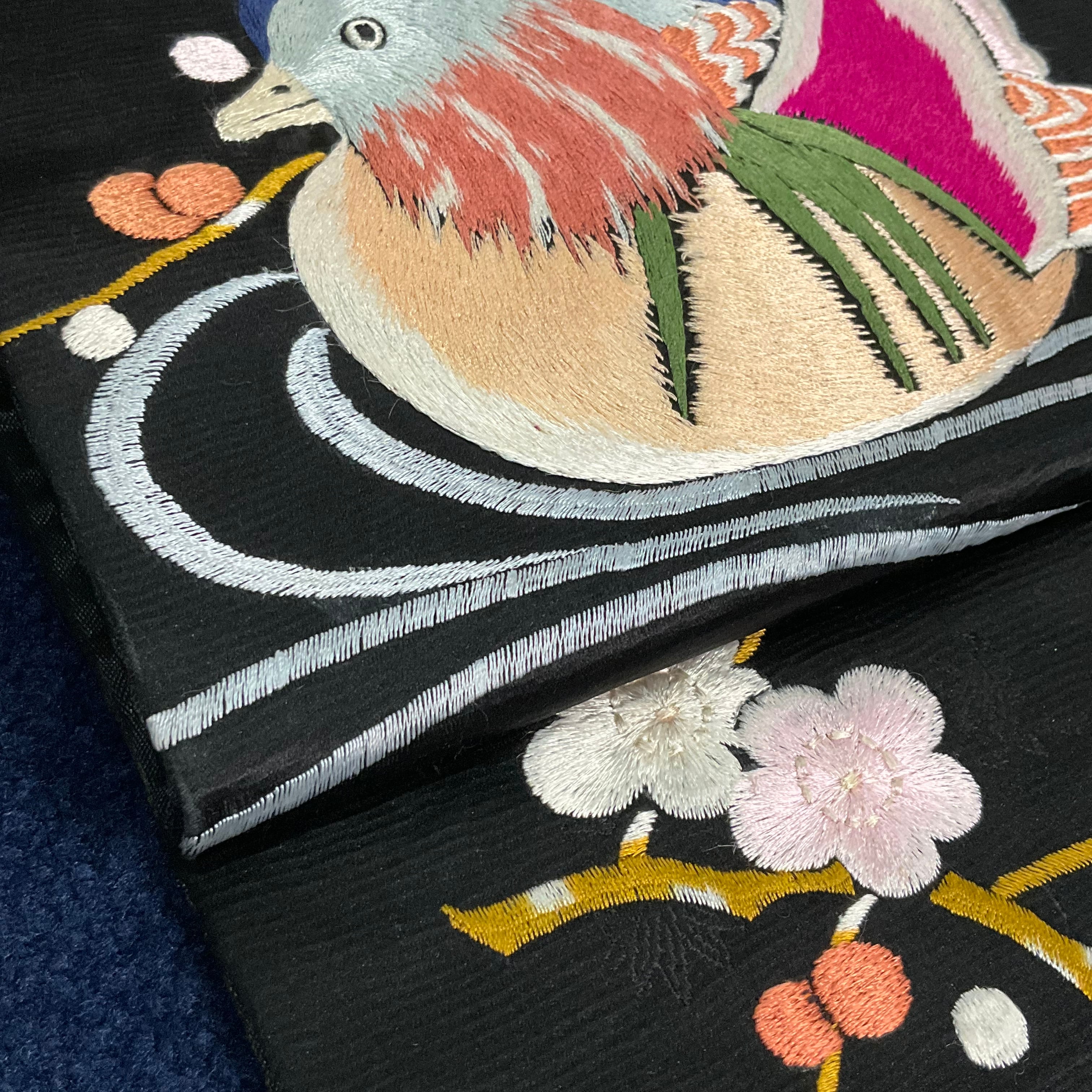 色とりどりな鴛と、淡いピンク色の梅の刺繍が目を惹きます*