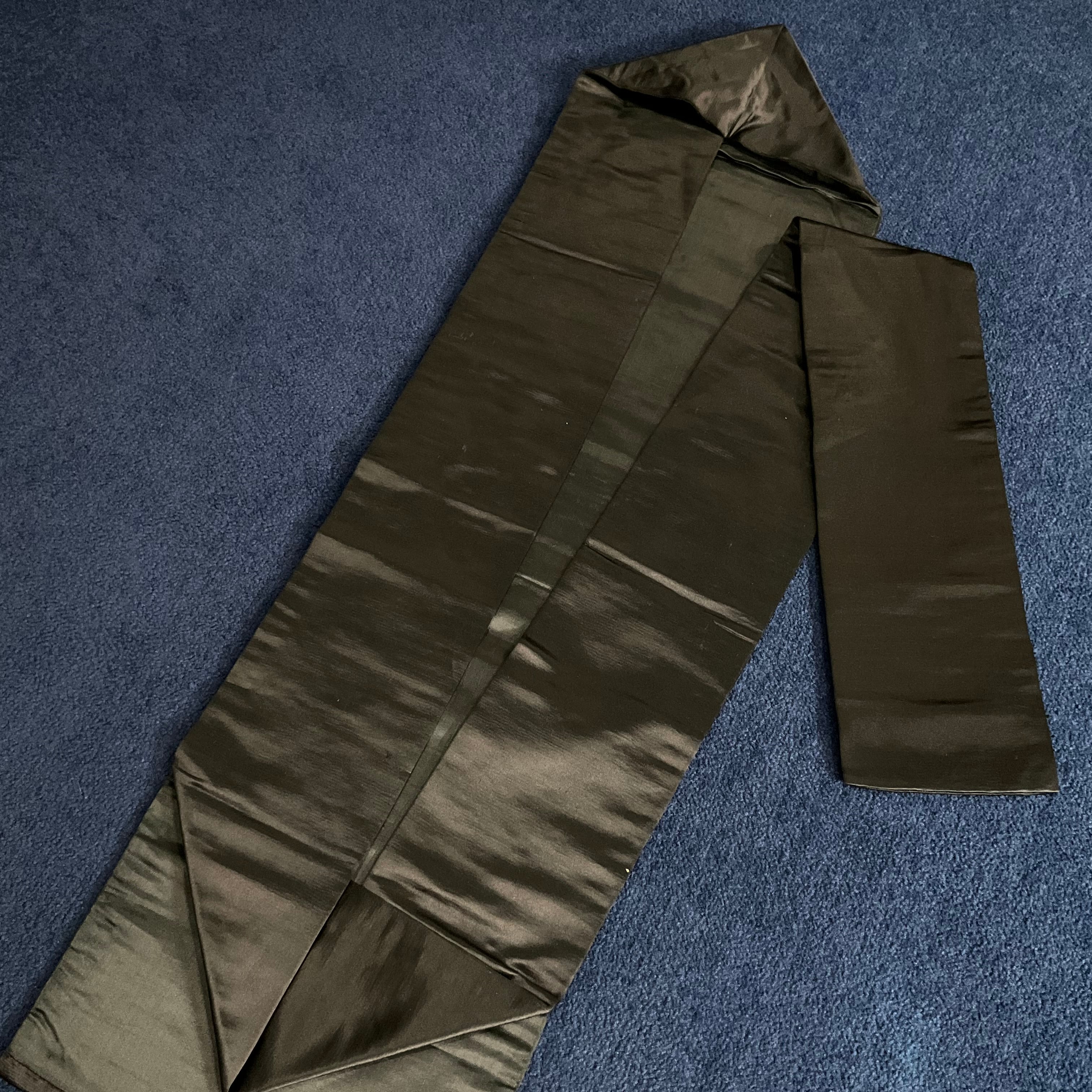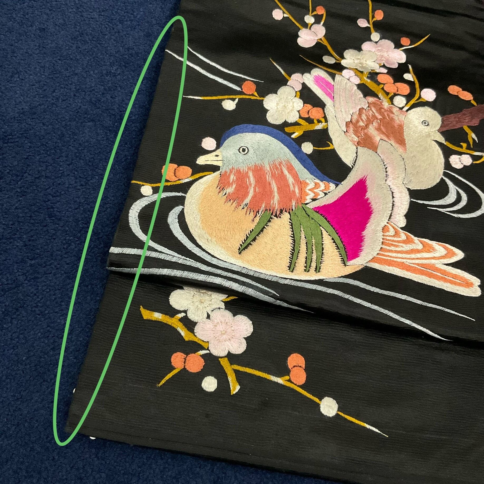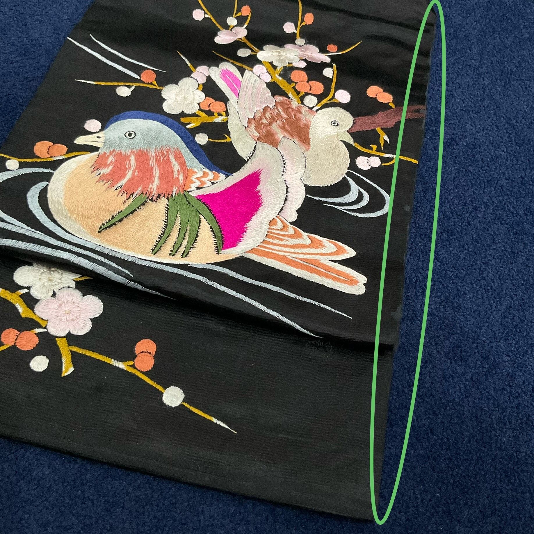 黒繻子地におしどりと梅が刺繍されたアンティーク名古屋帯です