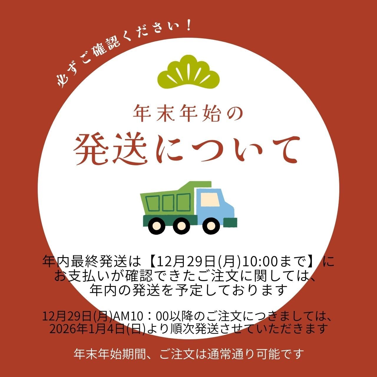年内最終発送は12月29日(月)AM10:00までにお支払いが確認できたご注文に関しては、年内の発送を予定しております